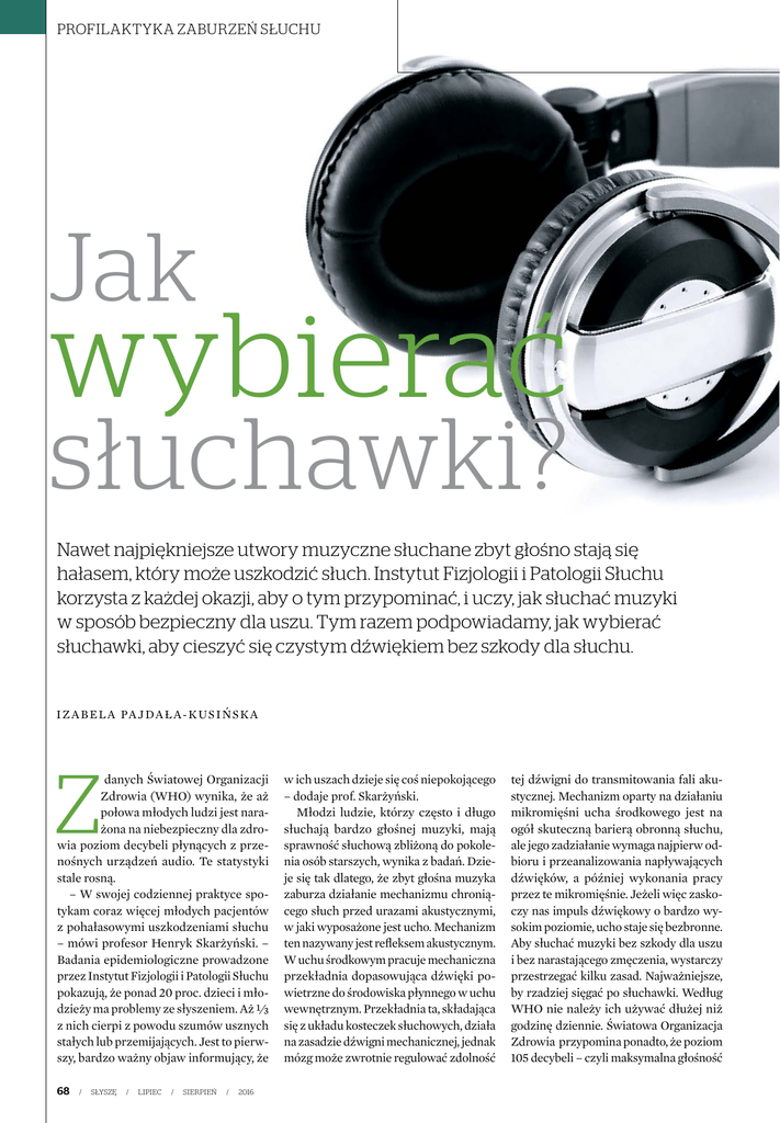 PROFILAKTYKA ZABURZEŃ SŁUCHU Jak wybierać słuchawki? Nawet najpiękniejsze utwory muzyczne słuchane zbyt głośno stają się hałasem, który może uszkodzić słuch. Instytut Fizjologii i Patologii Słuchu korzysta z każdej okazji, aby o tym przypominać, i uczy, jak słuchać muzyki w sposób bezpieczny dla uszu. Tym razem podpowiadamy, jak wybierać słuchawki, aby cieszyć się czystym dźwiękiem bez szkody dla słuchu. I ZABEL A PAJDAŁ A-K US I ŃS K A Z danych Światowej Organizacji Zdrowia (WHO) wynika, że aż połowa młodych ludzi jest narażona na niebezpieczny dla zdrowia poziom decybeli płynących z przenośnych urządzeń audio. Te statystyki stale rosną. – W swojej codziennej praktyce spotykam coraz więcej młodych pacjentów z pohałasowymi uszkodzeniami słuchu – mówi profesor Henryk Skarżyński. – Badania epidemiologiczne prowadzone przez Instytut Fizjologii i Patologii Słuchu pokazują, że ponad 20 proc. dzieci i młodzieży ma problemy ze słyszeniem. Aż ⅓ z nich cierpi z powodu szumów usznych stałych lub przemijających. Jest to pierwszy, bardzo ważny objaw informujący, że 68 / SŁYSZĘ / LIPIEC / SIERPIEŃ / 2016 w ich uszach dzieje się coś niepokojącego – dodaje prof. Skarżyński. Młodzi ludzie, którzy często i długo słuchają bardzo głośnej muzyki, mają sprawność słuchową zbliżoną do pokolenia osób starszych, wynika z badań. Dzieje się tak dlatego, że zbyt głośna muzyka zaburza działanie mechanizmu chroniącego słuch przed urazami akustycznymi, w jaki wyposażone jest ucho. Mechanizm ten nazywany jest refleksem akustycznym. W uchu środkowym pracuje mechaniczna przekładnia dopasowująca dźwięki powietrzne do środowiska płynnego w uchu wewnętrznym. Przekładnia ta, składająca się z układu kosteczek słuchowych, działa na zasadzie dźwigni mechanicznej, jednak mózg może zwrotnie regulować zdolność tej dźwigni do transmitowania fali akustycznej. Mechanizm oparty na działaniu mikromięśni ucha środkowego jest na ogół skuteczną barierą obronną słuchu, ale jego zadziałanie wymaga najpierw odbioru i przeanalizowania napływających dźwięków, a później wykonania pracy przez te mikromięśnie. Jeżeli więc zaskoczy nas impuls dźwiękowy o bardzo wysokim poziomie, ucho staje się bezbronne. Aby słuchać muzyki bez szkody dla uszu i bez narastającego zmęczenia, wystarczy przestrzegać kilku zasad. Najważniejsze, by rzadziej sięgać po słuchawki. Według WHO nie należy ich używać dłużej niż godzinę dziennie. Światowa Organizacja Zdrowia przypomina ponadto, że poziom 105 decybeli – czyli maksymalna głośność GŁÓWNE ZASADY BEZPIECZNEGO UŻYWANIA SŁUCHAWEK Przestrzegając kilku podstawowych zasad użytkowania słuchawek, zminimalizujemy ryzyko uszkodzenia słuchu, a odbiorem ulubionej muzyki będziemy cieszyć się przez długie lata. • Nie ustawiajmy maksymalnej głośności. •Optymalne warunki słuchania to połowa natężenia głośności (max 85 dB). • Czas słuchania ograniczmy do 1 godziny. •Podczas słuchania muzyki przez słuchawki róbmy przerwy. •Przy podłączeniu słuchawek do źródła dźwięku profilaktycznie ustawiajmy poziom głośności na 0. •Im bardziej zamknięte słuchawki, tym ciszej należy Fot.: Ijansempoi | Dreamstime.com słuchać. większości urządzeń MP3 – jest bezpieczny dla słuchu tylko przez cztery minuty. Za poziom bezpieczny dla zdrowia specjaliści WHO rekomendują głośność odpowiadającą około 60 proc. możliwości urządzenia. Przy zakupie słuchawek należy zwrócić uwagę nie tylko na ich parametry. Dobór słuchawek zależy również m.in. od tego, czy będziemy używać ich w domu, czy na ulicy, jaki mamy gust muzyczny, do jakiego sprzętu źródłowego zostaną podłączone, a także jakie mamy zdolności percepcji dźwięku. Ogólnie rozróżnia się trzy podstawowe grupy słuchawek: zamknięte, otwarte i półotwarte. Dodatkowo słuchawki w tych grupach różnicuje się na modele nauszne, wokółuszne, i douszne, w tym dokanałowe. Przyjrzyjmy się poszczególnym grupom i modelom. Słuchawki zamknięte mają szczelną obudowę, dzięki czemu zapewniają dużą izolację dźwięków z otoczenia oraz ograniczają znacznie dźwięki wychodzące na zewnątrz. Słuchawki te charakteryzują się przeważnie dobrą podstawą basową i dynamicznym brzmieniem, choć to zależy również od konkretnego modelu. Najczęściej wybierane są przez osoby używające słuchawek na zewnątrz. Słuchawki zamknięte można poznać zazwyczaj po tym, że ich muszle są pełne i jednolite, nie ma w nich żadnych sitek czy otworów. Mogą być zarówno modele nauszne, jak i dokanałowe (ang. In-Ear Monitors, IEMs, Canalphones). Te ostatnie są szczególnie popularne wśród biegaczy. Mniejsze od typowych słuchawek dousznych i wsuwane głęboko do kanału usznego mają tę zaletę, że nawet podczas joggingu nie wypadają z mał- żowiny usznej. Dzięki uszczelniającym, silikonowym nakładkom, dźwięk z otoczenia stłumiony jest na poziomie 20-30 dB. W słuchawkach dokanałowych stosowane są dwa rodzaje przetworników: membranowe lub armaturowe. Membranowe, inaczej dynamiczne (ang. Dynamic Drivers, Moving Coil Drivers), przeważnie grają z wzmocnieniem basów, używane są również w słuchawkach dousznych. Warto wiedzieć, że dłużej się rozgrzewają, co oznacza, że lepszy dźwięk uzyskamy dopiero jakiś czas po włączeniu. Przetworniki armaturowe (ang. Balanced Armature Drivers, BA) eliminują zakłócenia elektromagnetyczne dochodzące z otoczenia i nie potrzebują czasu na tzw. „wygrzewanie”. Dzięki przetwornikom armaturowym dźwięk jest lepszy, choć i cena słuchawek odpowiednio wyższa. Konstrukcja słuchawek całkowicie zamyka kanał słuchowy, dobrze izoluje od dźwięków otoczenia, jednak częste i długotrwałe używanie tego typu słuchawek może powodować zwiększone wydzielanie woskowiny 