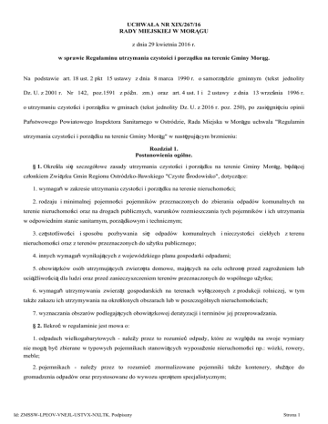UCHWAŁA NR XIX/267/16 RADY MIEJSKIEJ W MORĄGU z dnia 29 kwietnia 2016 r. w sprawie Regulaminu utrzymania czystości i porządku na terenie Gminy Morąg. Na podstawie art. 18 ust. 2 pkt 15 ustawy z dnia 8 marca 1990 r. o samorządzie gminnym (tekst jednolity Dz. U. z 2001 r. Nr 142, poz.1591 z późn. zm.) oraz art. 4 ust. 1 i 2 ustawy z dnia 13 września 1996 r. o utrzymaniu czystości i porządku w gminach (tekst jednolity Dz. U. z 2016 r. poz. 250), po zasięgnięciu opinii Państwowego Powiatowego Inspektora Sanitarnego w Ostródzie, Rada Miejska w Morągu uchwala "Regulamin utrzymania czystości i porządku na terenie Gminy Morąg" w następującym brzmieniu: Rozdział 1. Postanowienia ogólne. § 1. Określa się szczegółowe zasady utrzymania czystości i porządku na terenie Gminy Morąg, będącej członkiem Związku Gmin Regionu Ostródzko-Iławskiego "Czyste Środowisko", dotyczące: 1. wymagań w zakresie utrzymania czystości i porządku na terenie nieruchomości; 2. rodzaju i minimalnej pojemności pojemników przeznaczonych do zbierania odpadów komunalnych na terenie nieruchomości oraz na drogach publicznych, warunków rozmieszczania tych pojemników i ich utrzymania w odpowiednim stanie sanitarnym, porządkowym i technicznym; 3. częstotliwości i sposobu pozbywania się odpadów komunalnych i nieczystości ciekłych z terenu nieruchomości oraz z terenów przeznaczonych do użytku publicznego; 4. innych wymagań wynikających z wojewódzkiego planu gospodarki odpadami; 5. obowiązków osób utrzymujących zwierzęta domowe, mających na celu ochronę przed zagrożeniem lub uciążliwością dla ludzi oraz przed zanieczyszczeniem terenów przeznaczonych do wspólnego użytku; 6. wymagań utrzymywania zwierząt gospodarskich na terenach wyłączonych z produkcji rolniczej, w tym także zakazu ich utrzymywania na określonych obszarach lub w poszczególnych nieruchomościach; 7. wyznaczania obszarów podlegających obowiązkowej deratyzacji i terminów jej przeprowadzania. § 2. Ilekroć w regulaminie jest mowa o: 1. odpadach wielkogabarytowych - należy przez to rozumieć odpady, które ze względu na swoje wymiary nie mogą być zbierane w typowych pojemnikach stanowiących wyposażenie nieruchomości np.: wózki, rowery, meble; 2. pojemnikach - należy przez to rozumieć znormalizowane pojemniki także kontenery, służące do gromadzenia odpadów oraz przystosowane do wywozu sprzętem specjalistycznym; Id: ZMSSW-LPEOV-VNEJL-USTVX-NXLTK. Podpisany Strona 1 3. punktach selektywnej zbiórki - należy przez to rozumieć miejsce, gdzie można dostarczyć odpady problemowe z gwarancją, że zostaną one właściwie i bez szkody dla środowiska zagospodarowane; 4. ustawie - należy przez to rozumieć ustawę z dnia 13 września 1996 r. o utrzymaniu czystości i porządku w gminach (Dz. U. z 2016 r., poz. 250); 5. związku gmin - należy przez to rozumieć Związek Gmin Regionu Ostródzko-Iławskiego "Czyste Środowisko", który tworzą: - Gmina Dąbrówno - Gmina Godkowo - Gmina Grunwald - Miasto Iława - Gmina Iława - Gmina Jonkowo - Gmina Kurzętnik - Gmina Lubawa - Gmina Łukta - Gmina Olsztynek - Miasto Ostróda - Gmina Ostróda - Gmina Małdyty - Gmina Miłakowo - Gmina Miłomłyn - Gmina Morąg - Gmina Nowe Miasto Lubawskie - Miasto Nowe Miasto Lubawskie - Gmina Zalewo Rozdział 2. Wymagania w zakresie utrzymania czystości i porządku na terenie nieruchomości. § 3. Właściciele nieruchomości obowiązani są do prowadzenia selektywnego zbierania następujących rodzajów odpadów komunalnych: 1. papier i tektura; 2. metale; 3. tworzywa sztuczne; 4. opakowania wielomateriałowe; 5. szkło; Id: ZMSSW-LPEOV-VNEJL-USTVX-NXLTK. Podpisany Strona 2 6. odpady komunalne ulegające biodegradacji, w tym odpady opakowaniowe ulegające biodegradacji; 7. odpady zielone; 8. przeterminowane leki; 9. chemikalia; 10. zużyte baterie i akumulatory; 11. zużyty sprzęt elektryczny i elektroniczny; 12. meble i inne odpady wielkogabarytowe; 13. odpady budowlane i rozbiórkowe stanowiące odpady komunalne; 14. zużyte opony; 15. żużel i popiół z palenisk domowych. § 4. 1. Określa się szczegółowy sposób postępowania z odpadami komunalnymi: 1)w zabudowie jednorodzinnej – w systemie „u źródła”: a) papier i tekturę należy gromadzić w odpowiednio oznaczonych pojemnikach lub workach i przekazywać uprawnionemu przedsiębiorcy odbierającemu odpady komunalne w terminach odbioru tych odpadów; b) tworzywa sztuczne, metale oraz opakowania wielomateriałowe należy gromadzić w odpowiednio oznaczonych pojemnikach lub workach i przekazywać uprawnionemu przedsiębiorcy odbierającemu odpady komunalne w terminach odbioru tych odpadów; c) szkło należy gromadzić w odpowiednio oznaczonych pojemnikach lub workach i przekazywać uprawnionemu przedsiębiorcy odbierającemu odpady komunalne w terminach odbioru tych odpadów; d) odpady zielone i odpady komunalne ulegające biodegradacji, w tym odpady opakowaniowe ulegające biodegradacji należy gromadzić w odpowiednio oznaczonych pojemnikach lub workach i przekazywać uprawnionemu przedsiębiorcy odbierającemu odpady komunalne w terminach odbioru tych odpadów. Wskazane jest kompostowanie tych odpadów w przydomowych kompostownikach; e) żużel i popiół z palenisk domowych (wygaszony) należy gromadzić w odpowiednio oznaczonych pojemnikach i przekazywać uprawnionemu przedsiębiorcy odbierającemu odpady komunalne w terminach odbioru tych odpadów; f) niesegregowane (zmieszane) odpady komunalne należy gromadzić w odpowiednio oznaczonych pojemnikach i przekazywać uprawnionemu przedsiębiorcy odbierającemu odpady komunalne w terminach odbioru tych odpadów. W wyjątkowych, uzasadnionych sytuacjach, do zbierania większych ilości odpadów komunalnych przekraczających pojemność pojemnika, mogą być użyte worki; 2)w budynkach wielolokalowych – system pojemnikowy w tzw. „gniazdach” : a) papier i tekturę należy