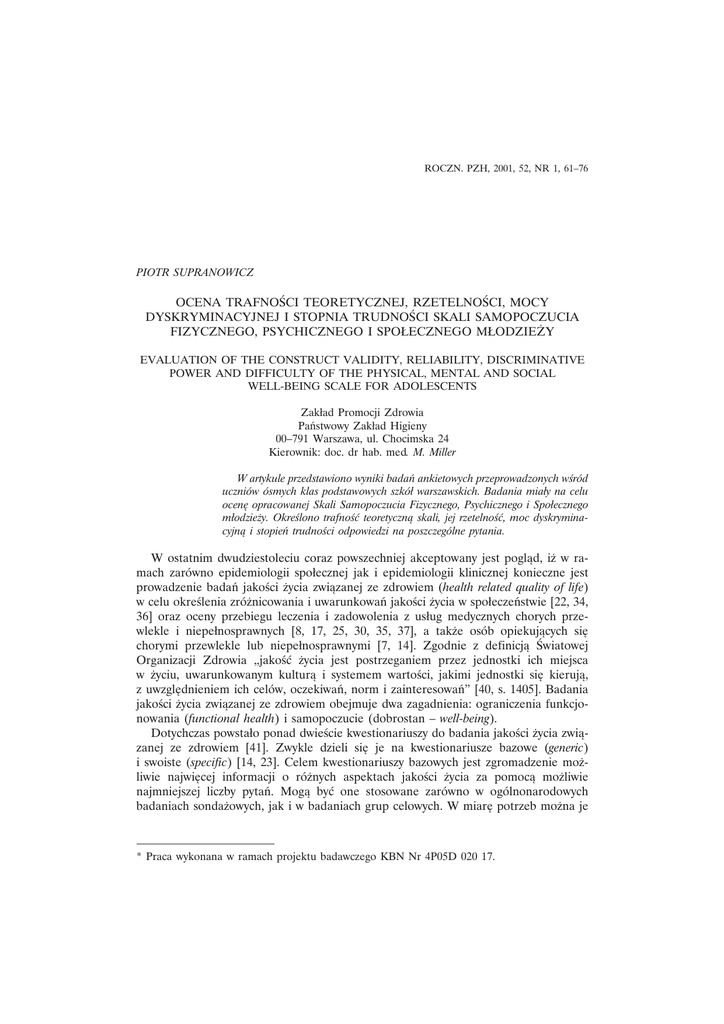 ROCZN. PZH, 2001, 52, NR 1, 61–76 PIOTR SUPRANOWICZ OCENA TRAFNOŚCI TEORETYCZNEJ, RZETELNOŚCI, MOCY DYSKRYMINACYJNEJ I STOPNIA TRUDNOŚCI SKALI SAMOPOCZUCIA FIZYCZNEGO, PSYCHICZNEGO I SPOŁECZNEGO MŁODZIEŻY EVALUATION OF THE CONSTRUCT VALIDITY, RELIABILITY, DISCRIMINATIVE POWER AND DIFFICULTY OF THE PHYSICAL, MENTAL AND SOCIAL WELL-BEING SCALE FOR ADOLESCENTS Zakład Promocji Zdrowia Państwowy Zakład Higieny 00–791 Warszawa, ul. Chocimska 24 Kierownik: doc. dr hab. med. M. Miller W artykule przedstawiono wyniki badań ankietowych przeprowadzonych wśród uczniów ósmych klas podstawowych szkół warszawskich. Badania miały na celu ocenę opracowanej Skali Samopoczucia Fizycznego, Psychicznego i Społecznego młodzieży. Określono trafność teoretyczną skali, jej rzetelność, moc dyskryminacyjną i stopień trudności odpowiedzi na poszczególne pytania. W ostatnim dwudziestoleciu coraz powszechniej akceptowany jest pogląd, iż w ramach zarówno epidemiologii społecznej jak i epidemiologii klinicznej konieczne jest prowadzenie badań jakości życia związanej ze zdrowiem (health related quality of life) w celu określenia zróżnicowania i uwarunkowań jakości życia w społeczeństwie [22, 34, 36] oraz oceny przebiegu leczenia i zadowolenia z usług medycznych chorych przewlekle i niepełnosprawnych [8, 17, 25, 30, 35, 37], a także osób opiekujących się chorymi przewlekle lub niepełnosprawnymi [7, 14]. Zgodnie z definicją Światowej Organizacji Zdrowia „jakość życia jest postrzeganiem przez jednostki ich miejsca w życiu, uwarunkowanym kulturą i systemem wartości, jakimi jednostki się kierują, z uwzględnieniem ich celów, oczekiwań, norm i zainteresowań” [40, s. 1405]. Badania jakości życia związanej ze zdrowiem obejmuje dwa zagadnienia: ograniczenia funkcjonowania (functional health) i samopoczucie (dobrostan – well-being). Dotychczas powstało ponad dwieście kwestionariuszy do badania jakości życia związanej ze zdrowiem [41]. Zwykle dzieli się je na kwestionariusze bazowe (generic) i swoiste (specific) [14, 23]. Celem kwestionariuszy bazowych jest zgromadzenie możliwie najwięcej informacji o różnych aspektach jakości życia za pomocą możliwie najmniejszej liczby pytań. Mogą być one stosowane zarówno w ogólnonarodowych badaniach sondażowych, jak i w badaniach grup celowych. W miarę potrzeb można je * Praca wykonana w ramach projektu badawczego KBN Nr 4P05D 020 17. 62 P. Supranowicz Nr 1 rozbudowywać. Do najbardziej znanych kwestionariuszy bazowych należą WHOQOL100 (World Health Organization Quality of Life – kwestionariusz Jakości Życia Światowej Organizacji Zdrowia) [40] oraz SF-36 HS (Short Form-36 Health Survey – Krótki Formularz do Badania Zdrowia) [38]. Swoiste kwestionariusze jakości życia stanowią jedno z narzędzi umożliwiających ocenę profilaktyki chorób przewlekłych, metod ich leczenia i adaptacji chorych w społeczności, w której żyją. Do najbardziej znanych, najczęściej stosowanych i powszechnie zaakceptowanych należą kwestionariusze przeznaczone dla chorych na choroby nowotworowe EORT QLQ-C30 (European Organization of Research and Treatment, Quality of Life Questionnaire-Cancer30 – Europejska Organizacja Badań i Leczenia, Kwestionariusz Jakości Życia-Choroby Nowotworowe) [1], astmę AQLQ (Asthma Quality of Life Questionnaire – Kwestionariusz Jakości Życia w przypadku Astmy) oraz ms-LWAQ (modified and shortened version of Living With Asthma Questionnaire – zmodyfikowana i skrócona wersja Kwestionariusza Żyć z Astmą) [19,32], epilepsję QOLIE-31 (Quality of Life in Epilepsia-31 – Jakość Życia w przypadku Epilepsji) [9] i otyłości ORWELL (Obesity Related Well-Being – Samopoczucie Związane z Otyłością) [27]. Są one w zasadzie przeznaczone dla dorosłych. Zaawansowane są prace nad kwestionariuszami do badania postrzeganych przez dzieci i młodzież ograniczeń funkcjonowania w przypadku przewlekłych zaburzeń zdrowia takich, jak epilepsja [10], astma [20, 21], przewlekłe stany zapalne jelit [16], choroby skóry [26]. Narzędzia do pomiaru drugiego aspektu jakości życia – samopoczucia – w przypadku dzieci i młodzieży nie zostały jeszcze opracowane [29]. Wprawdzie liczne badania zdrowia i jego psychospołecznych uwarunkowań, zarówno międzynarodowe, jak i prowadzone w Polsce, uwzględniają subiektywnie postrzegany przez dzieci i młodzież stan zdrowia i wybrane elementy jakości życia, w tym również samopoczucia [18, 42, 43], brak jest jednak jednolitego kwestionariusza bazowego, który pozwoliłby mierzyć zarówno ogólne samopoczucie, jak i jego wymiary: fizyczny, psychiczny i społeczny. W Zakładzie Promocji Zdrowia Państwowego Zakładu Higieny podjęte zostały w 1999 roku badania, których celem było skonstruowanie narzędzia do mierzenia samopoczucia fizycznego, psychicznego i społecznego. W artykule przedstawiono: 1. ocenę trafności teoretycznej, rzetelności oraz mocy dyskryminacyjnej opracowanego narzędzia; 2. ocenę stopnia trudności odpowiedzi na pytania, mierzonej w skali dychotomicznej, skali postaw Likerta i analogowej skali wizualnej. MATERIAŁ I METODY Opracowana do badań ankieta składała się z dwóch części. Zasadniczą część stanowiły mierniki samopoczucia (mierniki testowane). Podzielono je na mierniki samopoczucia fizycznego, psychicznego i społecznego. Do mierzenia samopoczucia fizycznego przyjęto pięć mierników. Cztery pierwsze dotyczyły częstości występowania najbardziej rozpowszechnionych wśród młodzieży dolegliwości związanych z uwarunkowaniami emocjonalnymi, behawioralnymi i środowiskowymi: bóle głowy, bóle brzucha, bóle pleców i przemęczenie. Piąty miernik, nazwany „samopoczucie fizyczne”, stanowił zagregowany miernik pozostałych mierników. Samopoczucie psychiczne odnosiło się do sfery emocjonalnej, obejmującej najczęściej przeżywane uczucia i emocje związane z 