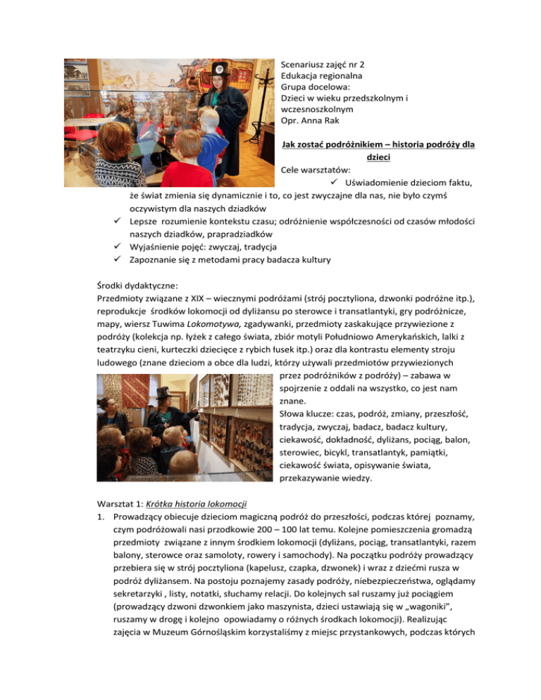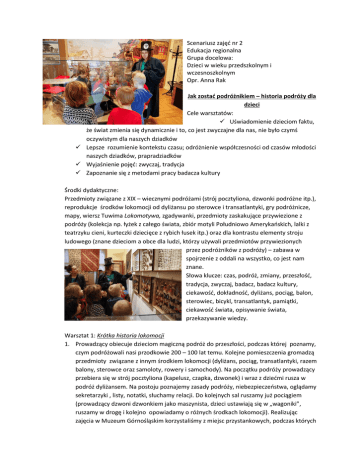 Scenariusz zajęć nr 2 Edukacja regionalna Grupa docelowa: Dzieci w wieku przedszkolnym i wczesnoszkolnym Opr. Anna Rak Jak zostać podróżnikiem – historia podróży dla dzieci Cele warsztatów: Uświadomienie dzieciom faktu, że świat zmienia się dynamicznie i to, co jest zwyczajne dla nas, nie było czymś oczywistym dla naszych dziadków Lepsze rozumienie kontekstu czasu; odróżnienie współczesności od czasów młodości naszych dziadków, prapradziadków Wyjaśnienie pojęć: zwyczaj, tradycja Zapoznanie się z metodami pracy badacza kultury Środki dydaktyczne: Przedmioty związane z XIX – wiecznymi podróżami (strój pocztyliona, dzwonki podróżne itp.), reprodukcje środków lokomocji od dyliżansu po sterowce i transatlantyki, gry podróżnicze, mapy, wiersz Tuwima Lokomotywa, zgadywanki, przedmioty zaskakujące przywiezione z podróży (kolekcja np. łyżek z całego świata, zbiór motyli Południowo Amerykańskich, lalki z teatrzyku cieni, kurteczki dziecięce z rybich łusek itp.) oraz dla kontrastu elementy stroju ludowego (znane dzieciom a obce dla ludzi, którzy używali przedmiotów przywiezionych przez podróżników z podróży) – zabawa w spojrzenie z oddali na wszystko, co jest nam znane. Słowa klucze: czas, podróż, zmiany, przeszłość, tradycja, zwyczaj, badacz, badacz kultury, ciekawość, dokładność, dyliżans, pociąg, balon, sterowiec, bicykl, transatlantyk, pamiątki, ciekawość świata, opisywanie świata, przekazywanie wiedzy. Warsztat 1: Krótka historia lokomocji 1. Prowadzący obiecuje dzieciom magiczną podróż do przeszłości, podczas której poznamy, czym podróżowali nasi przodkowie 200 – 100 lat temu. Kolejne pomieszczenia gromadzą przedmioty związane z innym środkiem lokomocji (dyliżans, pociąg, transatlantyki, razem balony, sterowce oraz samoloty, rowery i samochody). Na początku podróży prowadzący przebiera się w strój pocztyliona (kapelusz, czapka, dzwonek) i wraz z dziećmi rusza w podróż dyliżansem. Na postoju poznajemy zasady podróży, niebezpieczeństwa, oglądamy sekretarzyki , listy, notatki, słuchamy relacji. Do kolejnych sal ruszamy już pociągiem (prowadzący dzwoni dzwonkiem jako maszynista, dzieci ustawiają się w „wagoniki”, ruszamy w drogę i kolejno opowiadamy o różnych środkach lokomocji). Realizując zajęcia w Muzeum Górnośląskim korzystaliśmy z miejsc przystankowych, podczas których na postojach graliśmy w gry planszowe odnajdowaliśmy na mapach miejsca podróży słynnych ludzi. Obejrzeliśmy również stare filmy w zainscenizowanym kinie letnim (przed podróżą transatlantykiem do Ameryki) Warsztat 2: Mali naukowcy 1. Opowieści o świecie – dzieci oglądają dużą mapę, rozpoznają kontynenty i dopasowują zdjęcia przedstawiające ludzi o różnym kolorze skóry oraz przedmioty związane z kulturami egzotycznymi do poszczególnych części świata. 2. Jak się czuje podróżnik w kraju egzotycznym? Co go ciekawi? Zwracamy uwagę dzieci na fakt, że przedmioty takie jak chińskie łyżeczki z rączka w kształcie smoka są dla nas ciekawe i oryginalnie, ale dla mieszkańców doliny rzeki Jangcy z pewnością są to zwykłym przedmioty, który używają na co dzień. W Muzeum mieliśmy okazję prezentować kurteczki z dziecięce z rybich łusek (kultura Ajnów – Syberia), teatrzyk cieni z Jawy oraz kolekcje motyli z Ameryki Południowej. Następnie odwracamy sytuację. Pokazujemy dzieciom przedmiot im znany: galandę (wianek) ze stroju Śląskiego. Wykonujemy mini inscenizację: jedno z dzieci wciela się w rolę Eskimosa, który nie zna naszych zwyczajów i pyta co to jest, do czego służy ten przedmiot i dlaczego akurat z kwiatów, koralików, dlaczego zakładamy go na głowę, dlaczego może nosić go tylko panna. Ćwiczenie ma uświadomić dzieciom, że tradycje i zwyczaje są takie same tylko dla pewnej liczby ludzi. Dla innych mogą się one wydać dziwne i budzić ciekawość. Jeśli chcemy zbierać i dokumentować jakieś zwyczaje musimy prowadzić badania bardzo rzetelnie, zadawać dużo pytań, patrzeć na każdy zwyczaj tak, jakbyśmy widzieli go pierwszy raz i chcieli bezstronnie go opisać. Nawet wtedy, gdy badanie dotyczy tradycji nam znanych (np. zwyczaje świąteczne) 3. Przysięga przyszłych badaczy własnej kultury Chcę zostać prawdziwym badaczem naszej tradycji, dlatego obiecuję, że będę dokładnie zbierał wszystkie informacje i zadawał dużo pytań osobom, które ja lepiej znają ode mnie. Nie będę się niczemu dziwił i kierował się będę ciekawością . Wiem, że świat pełen jest różnych tradycji i zwyczajów, a ja chętnie je wszystkie poznam i opowiem o nich moim kolegom. Obiecuję być ciekawym świata!