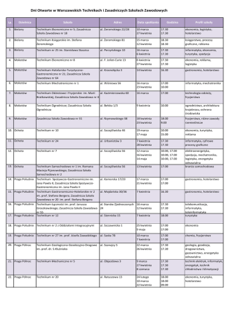 Dni Otwarte w Warszawskich Technikach i Zasadniczych Szkołach Zawodowych Lp. Dzielnica Szkoła Adres Data spotkania Godzina Profil szkoły 1. Bielany Technikum Ekonomiczne nr 5; Zasadnicza Szkoła Zawodowa nr 18 ul. Żeromskiego 22/28 10 marca 27 kwietnia 17.30 17.30 ekonomia, logistyka, hotelarstwo 2. Bielany Technikum Księgarskie im. Stefana Żeromskiego ul. Żeromskiego 81 15 marca 12 kwietnia 18.30 18.30 księgarstwo, procesy graficzne, reklama 3. Bielany Technikum nr 25 im. Stanisława Staszica ul. Perzyńskiego 10 16 marca 6 kwietnia 17.30 17.30 informatyka, ekonomia, turystyka, spedycja 4. Mokotów Technikum Ekonomiczne nr 8 ul. F. Joliot-Curie 13 6 kwietnia 27 kwietnia 17.30 17.30 ekonomia, reklama, logistyka 5. Mokotów Technikum Hotelarsko-TurystycznoGastronomiczne nr 21; Zasadnicza Szkoła Zawodowa nr 64 ul. Krasnołęcka 3 14 kwietnia 16.30 gastronomia, hotelarstwo 6. Mokotów Technikum Mechatroniczne nr 1 ul. Wiśniowa 56 16 marca 23 kwietnia 17.00 10.00 informatyka, mechatronika 7. Mokotów Technikum Odzieżowe i Fryzjerskie im. Marii ul. Kazimierzowska 60 Bratkowskiej; Zasadnicza Szkoła Zawodowa nr 4 16 marca 17.00 technologia odzieży, fryzjerstwo 8. Mokotów Technikum Ogrodnicze; Zasadnicza Szkoła Ogrodnicza ul. Bełska 1/3 9 kwietnia 10.00 ogrodnictwo, architektura krajobrazu, ochrona środowiska 9. Mokotów Zasadnicza Szkoła Zawodowa nr 31 ul. Rzymowskiego 38 18 kwietnia 23 kwietnia 18.00 9.00 fryzjerstwo, różne zawody rzemieślnicze 10. Ochota Technikum nr 10 ul. Szczęśliwicka 46 19 marca 17 maja 10.00 15.00 ekonomia, turystyka, reklama 11. Ochota Technikum nr 24 ul. Urbanistów 3 7 kwietnia 28 kwietnia 17.30 17.30 informatyka, cyfrowe procesy graficzne 12. Ochota Technikum nr 7 ul. Szczęśliwicka 56 12 marca 16 kwietnia 14 maja 10.00, 17.00 10.00, 17.00 10.00, 17.00 13. Ochota Technikum Samochodowe nr 1 im. Romana Macieja Pijanowskiego; Zasadnicza Szkoła Samochodowa nr 2 ul. Szczęśliwicka 56 13 kwietnia 17.00 elektroenergetyka, spedycja, mechatronika, logistyka, energetyka odnawialna branża samochodowa 14. Praga Południe Technikum Spożywczo-Gastronomiczne im. Jana Pawła II; Zasadnicza Szkoła SpożywczoGastronomiczna im. Jana Pawła II ul. Komorska 17/23 17 marca 21 kwietnia 17.00 17.00 gastronomia, hotelarstwo 15. Praga Południe Technikum Gastronomiczno-Hotelarskie nr 2 im. prof. Stefana Bergera; Zasadnicza Szkoła Zawodowa nr 20 im. prof. Stefana Bergera ul. Majdańska 30/36 7 kwietnia 16.30 gastronomia, hotelarstwo 16. Praga Południe Technikum Łączności im. prof. Janusza al. Stanów Zjednoczonych 16 marca Groszkowskiego; Zasadnicza Szkoła Zawodowa 24 12 kwietnia nr 55 17. Praga Południe Technikum nr 12 ul. Siennicka 15 7 kwietnia 17.30 17.30 telekomunikacja, informatyka, teleinformatyka turystyka 18. Praga Południe Technikum nr 2 z Oddziałami Integracyjnymi ul. Szczawnicka 1 25 kwietnia 9 maja 17.00 17.00 ekonomia 19. Praga Południe Technikum nr 27 im. prof. Józefa Zawadzkiego ul. Saska 78 10 marca 7 kwietnia 17.00 17.00 chemia, fryzjerstwo geologia, geodezja, drogownictwo, gazownictwo, energetyka odnawialna technik elektryk, informatyk, energetyk, technik chłodnictwa i klimatyzacji 18.00 20. Praga Północ Technikum Geologiczno-Geodezyjno-Drogowe ul. Szanajcy 5 im. prof. dr. S.Kluźniaka 22 marca 26 kwietnia 17.30 17.30 21. Praga Północ Technikum Mechaniczne nr 5 ul. Objazdowa 3 9 marca 27 kwietnia 8 czerwca 17.30 17.30 17.30 22. Praga Północ Technikum nr 20 ul. Ratuszowa 13 24 lutego 10 marca 22 kwietnia 18.00 18.00 09.00 ekonomia, turystyka, hotelarstwo 23. Praga Północ Technikum nr 6; Zasadnicza Szkoła Zawodowa nr 7 ul. Targowa 86 24. Śródmieście Technikum Architektoniczno–Budowlane im. Stanisława Noakowskiego ul. Przyrynek 9 25. Śródmieście Technikum Budowlane nr 1 im. Zdzisława Mączeńskiego 26. Śródmieście 22 lutego 30 marca 27 kwietnia 12 marca 23 kwietnia 17.30 17.30 17.30 11.00 11.00 branża samochodowa, elektryczna ul. Górnośląska 31 16 marca 13 maja 17.00 17.00 budownictwo Technikum Ekonomiczne nr 1 im. Mikołaja Kopernika ul. Stawki 10 12 marca 6 kwietnia 11 maja 10.00 18.00 18.00 ekonomia, logistyka 27. Śródmieście Technikum Elektryczno-Elektroniczne nr 1 ul. E. Konopczyńskiego 4 16 marca 23 kwietnia 17.30 11.00 technik elektronik 28. Śródmieście Technikum Gastronomiczno-Hotelarskie nr 1; Zasadnicza Szkoła Gastronomiczna ul. Poznańska 6/8 15 marca 16.30 gastronomia, hotelarstwo 29. Śródmieście Technikum Poligraficzne; Zasadnicza Szkoła Poligraficzna ul. Stawki 14 17 marca 12 kwietnia 18.00 18.00 procesy drukowania, procesy graficzne, reklama 30. Targówek Technikum nr 11 ul. Odrowąża 75 16 marca 17.00 ekonomia, turystyka, hotelarstwo, reklama, obsługa portów i terminali 31. Targówek Technikum nr 30; Zasadnicza Szkoła Zawodowa ul. Mieszka I 7 nr 41 16 marca 27 kwietnia 17.00 17.00 budownictwo, fryzjerstwo, różne zawody rzemieślnicze 32. Ursus Technikum nr 8; Zasadnicza Szkoła Zawodowa nr 37 ul. Dzieci Warszawy 42 9 marca 14 maja 18.00 11.00 informatyka, turystyka, różne zawody rzemieślnicze 33. Włochy Technikum nr 9 Lotnicze im. Bohaterów Narwiku ul. Gładka 16 Technikum Budowlane nr 5 im. prof. Stefana Bryły ul. Księcia Janusza 45/ 47 17.00 17.00 10.00 10.00 18.00 technik mechanik lotniczy, awionik, informatyk 34. Wola 16 marca 13 kwietnia 7 maja 19 marca 20 kwietnia 35. Wola Technikum Elektroniczne nr 1; Zasadnicza Szkoła Zawodowa nr 57 ul. Kasprzaka 19/21 9 marca 13 kwietnia 17.00 17.00 elektronika, informatyka 36. Wola Technikum Fototechniczne; Zasadnicza Szkoła Fototechniczna Technikum nr 23 im. Fryderyka Skarbka; Zasadnicza Szkoła Zawodowa nr 39 ul. Spokojna 13 21 kwietnia 17.00 fotografia ul. Ożarowska 71 13 kwietnia 21 kwietnia 30 kwietnia 17.30 17.30 11.30 ekonomia, turystyka, technik ortopeda, różne zawody rzemieślnicze 37. Wola budownictwo, urządzenia sanitarne budownictwo, architektura krajobrazu 38. Wola Technikum nr 26; Zasadnicza Szkoła Zawodowa 