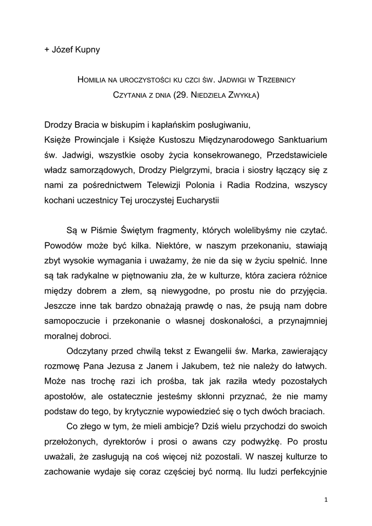 + Józef Kupny HOMILIA NA UROCZYSTOŚCI KU CZCI ŚW . JADWIGI W TRZEBNICY CZYTANIA Z DNIA (29. NIEDZIELA ZWYKŁA) Drodzy Bracia w biskupim i kapłańskim posługiwaniu, Księże Prowincjale i Księże Kustoszu Międzynarodowego Sanktuarium św. Jadwigi, wszystkie osoby życia konsekrowanego, Przedstawiciele władz samorządowych, Drodzy Pielgrzymi, bracia i siostry łączący się z nami za pośrednictwem Telewizji Polonia i Radia Rodzina, wszyscy kochani uczestnicy Tej uroczystej Eucharystii Są w Piśmie Świętym fragmenty, których wolelibyśmy nie czytać. Powodów może być kilka. Niektóre, w naszym przekonaniu, stawiają zbyt wysokie wymagania i uważamy, że nie da się w życiu spełnić. Inne są tak radykalne w piętnowaniu zła, że w kulturze, która zaciera różnice między dobrem a złem, są niewygodne, po prostu nie do przyjęcia. Jeszcze inne tak bardzo obnażają prawdę o nas, że psują nam dobre samopoczucie i przekonanie o własnej doskonałości, a przynajmniej moralnej dobroci. Odczytany przed chwilą tekst z Ewangelii św. Marka, zawierający rozmowę Pana Jezusa z Janem i Jakubem, też nie należy do łatwych. Może nas trochę razi ich prośba, tak jak raziła wtedy pozostałych apostołów, ale ostatecznie jesteśmy skłonni przyznać, że nie mamy podstaw do tego, by krytycznie wypowiedzieć się o tych dwóch braciach. Co złego w tym, że mieli ambicje? Dziś wielu przychodzi do swoich przełożonych, dyrektorów i prosi o awans czy podwyżkę. Po prostu uważali, że zasługują na coś więcej niż pozostali. W naszej kulturze to zachowanie wydaje się coraz częściej być normą. Ilu ludzi perfekcyjnie 1 planuje i realizuje ścieżkę własnej kariery, oczekując kolejnych zaszczytów czy awansów. Trudno ich potępiać za to, że mają ambicje albo za to, że chcą się rozwijać. Jednak zupełnie zmienia się nasze patrzenie na tę rozmowę kiedy uświadomimy sobie, że tuż przed nią Pan Jezus po raz trzeci zapowiedział swoją mękę. Warto to podkreślić, bo Ewangelista Marek łączy te dwa wydarzenia w jedną całość. W rzeczywistości wygląda to tak: Jezus wraz z uczniami jest w drodze do Jerozolimy. Idzie w takim tempie, że pozostali nie są w stanie za Nim nadążyć. W drodze naucza, że zostanie wydany arcykapłanom i uczonym w Piśmie, że będzie opluty, wyszydzony, odrzucony, ubiczowany i zabity i w tej właśnie chwili podchodzą Jakub i Jan prosząc o przyznanie im miejsc po Jego prawej i po lewej stronie. W Biblii Tysiąclecia mamy to ukazane przez słowo: "wtedy"... Czyli kiedy byli w drodze, kiedy nauczał, WTEDY podeszli synowie Zebedeusza. To zupełnie zmienia nasze patrzenie na ich rozmowę z Chrystusem. Są blisko Niego, słuchają o Jego męce i śmierci, ale myślą wyłącznie o sobie. Chodzi im tak naprawdę o siebie, o to by siebie wywyższyć, by dla siebie coś ugrać. Ojciec Raniero Catalamessa, kaznodzieja Domu Papieskiego mówił, komentując ten fragment, że tak się układa cała historia ludzka: są w niej ci, którzy kochają siebie, aż do odrzucenia Boga i ci, którzy kochają Boga tak mocno, że są gotowi złożyć swoje życie w ofierze. Jest to ogromna przestroga dla każdego z nas. Bo nawet człowiek przychodzący do Boga może być tak mocno zapatrzony w siebie, że zupełnie nie zwróci uwagi na Tego, dla którego tu przeszedł. To doskonale widać w naszym świecie. Nawet na Mszę św. można 2 przychodzić nie dla Boga, ale dla samego siebie. Wielu jest gotowych być blisko Kościoła, ale nie dla Chrystusa, tylko dla samego siebie. W tym kontekście może warto się zastanowić nad tym: Dla kogo przyznajemy się do wartości chrześcijańskich? Dla kogo to robimy? Dla kogo tutaj jesteśmy? Dziś te pytania stawia nam św. Jadwiga. Czcimy ją nie dlatego, że ufundowała kościół czy klasztor. W historii wielu było tych, którzy budowali kościoły, wyposażali je w piękne sprzęty, wielu było i jest opiekujących się chorymi, słabymi, biednymi. Dziś działają fundacje, organizuje się różne akcje na rzecz osób wykluczonych. To wszystko jest dobre, bo porusza naszą wrażliwość, skłania do tego, by zrezygnować chociaż trochę z własnego egoizmu, ale to automatycznie nie otwiera drogi do świętości. Czcimy św. Jadwigę dlatego, że była gotowa zrezygnować z własnych ambicji i planów. Tak mocno pokochała Boga, że była gotowa do największych poświęceń. Dla Boga to robiła. Nie dla siebie. Rozmowa Jana i Jakuba z Jezusem ma jednak ciąg dalszy. Kiedy jej słuchamy można odnieść wrażenie, że Pan Jezus sprytnie uciekł od przedłożonej prośby. Oni mówią, że chcą siedzieć po Jego prawej i lewej stronie, a Jezus pyta się: "A możecie pić kielich, który ja mam pić i przyjąć chrzest, którym ja mam być ochrzczony?". "Możemy" odpowiadają. Na co Jezus: "To i kielich wypijecie i chrzest przyjmiecie, ale nie będziecie siedzieć obok mnie. Tego wam nie obiecuję". To nie jest ucieczka od odpowiedzi, czy rodzaj targowania się z uczniami. Może się bowiem wydawać, że Jezus stawia warunek: "Jeśli wypijecie mój kielich to dostaniecie swoje miejsca". Jezus nie stawia żadnego warunku tylko podkreśla, że On nie ma władzy przyznawać miejsca w królestwie niebieskim, ale ma władzę dać im udział w swojej męce, śmierci i zmartwychwstaniu. 3 W logice Jezusa nie jest tak, że najpierw człowiek musi cierpieć, a później w nagrodę otrzyma swoje miejsce - wysokie krzesło w Królestwie Bożym. To sam udział w krzyżu Chrystusa, na miarę naszych sił, jest darem. Doskonale rozumieli to pierwsi chrześcijanie. Kiedy przyjrzymy się mozaikom starożytnym przedstawiającym męczenników zobaczymy, że większość z nich została przedstawiona z symbolami swojego męczeństwa. Np. Piotr trzyma krzyż, Szymon Gorliwy jest przedstawiany z piłą (tradycja mówi, ze został rozcięty na dwoje). Tym, co jednak uderza, to fakt, że męczennicy często trzymaj