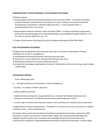 PRZEDMIOTOWY SYSTEM OCENIANIA Z WYCHOWANIA FIZYCZNEGO Podstawa prawna: 1. Rozporządzenia Ministra Edukacji Narodowej z dnia 30 kwietnia 2007 r. w sprawie warunków i sposobu oceniania, klasyfikowania i promowania uczniów i słuchaczy oraz przeprowadzania sprawdzianów i egzaminów w szkołach publicznych (Dz. U. z dnia 2 grudnia 2010 r.) wewnątrzszkolny system oceniania 2. Rozporządzenia Ministra Edukacji z dnia 23 grudnia 2008 r. w sprawie podstawy programowej wychowania przedszkolnego oraz kształcenia ogólnego w poszczególnych typach szkół (Dz. U. Nr 15 z dnia 15 stycznia 2009, Nr 4, poz. 17) 3. Program Wychowania fizycznego dla czterech etapów edukacyjnych DKW 4014-88/01 CELE WYCHOWANIA FIZYCZNEGO Przygotowanie do aktywności fizycznej przez całe życie oraz ochrona i doskonalenie zdrowia własnego oraz innych, w szczególności: 1) uświadomienie potrzeby aktywności fizycznej przez całe życie; 2) stosowanie w życiu codziennym zasad prozdrowotnego stylu życia; 3) działanie jako krytyczny konsument (odbiorca) sportu; 4) umiejętności sprzyjające zapobieganiu chorobom i doskonaleniu zdrowia fizycznego, psychicznego i społecznego. WYMAGANIA OGÓLNE Uczeń zobowiązany jest: a) posiadać estetyczny strój sportowy, na który składają się: - koszulka ( na zmianę z krótkim rękawem ) - krótkie spodenki sportowe - miękkie obuwie sportowe nie rysujące parkietu np. tenisówki lub trampki (wykluczone jest używanie w czasie lekcji w sali gimnastycznej obuwia sportowego typu „korki”) - w czasie zajęć w terenie uczeń może być ubrany w dres sportowy oraz dowolne obuwie sportowe Przygotowanie do lekcji (strój sportowy) - zezwalamy na 1-krotny brak stroju w semestrze; za drugim i kolejnym razem - ocena niedostateczna. Uczniowie, którzy zawsze ćwiczą aktywnie na lekcjach wychowania fizycznego, wykazali się 100% obecnością , oceniani są na koniec semestru bądź całego roku oceną przynajmniej dobrą, bez względu na poziom sprawności. Uczniowie nie posiadający wyraźnych przeciwwskazań do uczestniczenia w zajęciach z pływania(udokumentowanych zwolnieniem lekarskim), a opuszczający zajęcia na basenie nie mogą otrzymać najwyższych ocen semestralnych lub rocznych (celujący, bardzo dobry) z wychowania fizycznego. b) być przygotowanym do lekcji w momencie jej rozpoczęcia ( uczeń przebiera się w trakcie przerwy i czeka na nauczyciela w szatni po dzwonku na lekcję – ze względu na specyficzny charakter lekcji wychowania fizycznego uczeń, który spóźni się na lekcję nie będzie dopuszczony do ćwiczeń ) c) przestrzegać przepisów bhp, regulaminów szatni i sali gimnastycznej przed, w trakcie oraz po lekcji wychowania fizycznego d) w przypadku choroby lub niezdolności do ćwiczeń z innego powodu, posiadać zwolnienie lekarskie od odpowiedniego specjalisty lub rodziców. Zwolniony z ćwiczeń uczeń zobowiązany jest do obecności na zajęciach. e) nieobecność na lekcji nie zwalnia ucznia z obowiązku opanowania realizowanych tego dnia zadań. W przypadku usprawiedliwionej nieobecności na sprawdzianie, uczeń ma obowiązek po wcześniejszym uzgodnieniu z nauczycielem zaliczyć dany sprawdzian w terminie do dwóch tygodni. W przypadku nieobecności nieusprawiedliwionej uczeń nie ma takiej możliwości i otrzymuje ocenę niedostateczną. f) uczeń, który otrzymał ocenę niedostateczną ze sprawdzianu ma prawo do jednej poprawy tej oceny po uprzednim uzgodnieniu z nauczycielem formy i terminu poprawy w terminie do dwóch tygodni. g) w przypadku całkowitego zwolnienia z wychowania fizycznego w danym roku szkolnym, złożyć do dyrektora szkoły podanie rodziców o zwolnienie z lekcji w-f wraz z odpowiednim zaświadczeniem lekarskim potwierdzonym wcześniej przez nauczyciela w-f w terminie do 30 września. W przypadku gdy lekcja w-f jest pierwszą lub ostatnią lekcją ucznia całkowicie zwolnionego z ćwiczeń, na wniosek rodziców, uczeń taki może być zwolniony z obowiązku obecności na tych lekcjach. h) w przypadkach losowych (np. uraz, wypadek), których następstwem będzie długotrwała niezdolność do ćwiczeń, uczeń zobowiązany jest do jak najszybszego dostarczenia zwolnienia lekarskiego i) przestrzegać ogólnie przyjętych zasad dobrego wychowania, zasady fair-play – z szacunkiem zwracać się do współćwiczących i nauczyciela, unikać zwrotów i słów wulgarnych Wymagania edukacyjne i sposoby sprawdzania osiągnięć edukacyjnych z wychowania fizycznego Przy ustalaniu oceny z wychowania fizycznego należy w szczególności brać pod uwagę wysiłek wkładany przez ucznia w wywiązywanie się z obowiązków wynikających ze specyfiki tych zajęć. KOMPONENY OCENY WYSIŁEK 60% – 75 % OSIĄGNIĘCIA EDUKACYJNE 25% – 45 % OBSZARY OCENIANIA Obszary oceniania wysiłku 3/4 Obszary oceniania osiągnięć edukacyjnych1/4 - (SU) systematyczny udział w zajęciach - (UR + PSW) umiejętności ruchowe + - (A + DSR) aktywność + działalność na praktyczne stosowanie wiedzy rzesz sportowo rekreacyjną - (PS) postęp w usprawnianiu 1. (SU) systematyczny udział w zajęciach - ocenianie jest bezpośrednio uczestnictwo ucznia w zajęciach (ćwiczenie) - co miesiąc wystawiana jest jedna ocena cząstkowa, w przypadku fakultetu dwie oceny w półroczu - motywujący system „obrony oceny celującej” (gdzie 100% ćwiczenie to 6, a każdy nieusprawiedliwiony brak ćwiczenia obniża ocenę o 1) 2. (A + DSR) aktywność + działalność na rzesz sportowo rekreacyjną - oceniane są wszystkie działania i inicjatywy podejmowane przez ucznia w czasie zajęć oraz jego działalność na rzecz sportowo-rekreacyjną wykraczające poza obowiązki lekcyjne. - ocena bieżąca aktywności w skali dwustopniowej (+/–) (+) plus otrzymuje uczeń, który ćwiczy w sposób zbliżony do swoich maksymalnych możliwości: za współuczestnictwo w organizacji zajęć - samodzielne prowadzenie fragmentów lekcji (np. rozgrzewka), sędziowanie, o