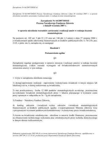 Zarządzenie Nr 64/2007/DSOZ.rtf Zarządzenie Nr 64/2007/DSOZ Prezesa Narodowego Funduszu Zdrowia z dnia 20 września 2007 r. w sprawie określenia warunków zawierania i realizacji umów w rodzaju leczenie stomatologiczne Zarządzenie Nr 64/2007/DSOZ Prezesa Narodowego Funduszu Zdrowia z dnia20 września 2007 r. w sprawie określenia warunków zawierania i realizacji umów w rodzaju leczenie stomatologiczne Na postawie art. 102 ust. 5 pkt 21 i 25 oraz art. 146 pkt 1,3 ustawy z dnia 27 sierpnia 2004 r. o świadczeniach opieki zdrowotnej finansowanych ze środków publicznych (Dz. U. Nr 210, poz. 2135, z późn. zm.1), zarządza się, co następuje: Rozdział 1 Postanowienia ogólne §1 Zarządzenie reguluje postępowanie w sprawie zawarcia i realizacji umowy w rodzaju leczenie stomatologiczne, a także warunki wymagane od świadczeniodawców zainteresowanych zawarciem umowy w tym rodzaju. §2 1. Użyte w zarządzeniu określenia oznaczają: 1) dostęp/zapewnienie realizacji – zapewnienie wykonywania świadczeń w innym miejscu lub lokalizacji niż ta, w której realizowane są świadczenia, 2) etat przeliczeniowy – liczba 12 000 punktów stomatologicznych na miesiąc, przeznaczona na wykonanie świadczeń stomatologicznych przez 1 lekarza pracującego w wymiarze czasu pracy opisanym w załączniku nr 3a – 3g do zarządzenia, 3) Fundusz – Narodowy Fundusz Zdrowia, 4) katalog zakresów i świadczeń – wykaz zakresów i świadczeń stomatologicznych finansowanych ze środków publicznych zgodny z rozporządzeniem Ministra Zdrowia wraz z przypisanymi wycenami punktowymi kontraktowany i wykonywany przez świadczeniodawcę, 5) kwota na świadczenie ortodontyczne – określone w umowie środki finansowe, przeznaczone na sfinansowanie technicznego wykonania prac ortodontycznych przez technika dentystycznego w danym okresie rozliczeniowym, Dokument wygenerowany 2007-09-24, ze strony internetowej Narodowego Funduszu Zdrowia, opublikowany w serwisie 2007-09-21 12:14:45, przekazany przez Departament Świadczeń Opieki Zdrowotnej. Zarządzenie Nr 64/2007/DSOZ.rtf 6) kwota na świadczenie protetyczne – określone w umowie środki finansowe, przeznaczone na finansowanie technicznego wykonania prac protetycznych przez technika dentystycznego w danym okresie rozliczeniowym, 7) kwota na znieczulenie ogólne – jednostkowy koszt znieczulenia ogólnego wykonywanego w ramach umowy w zakresie: świadczenia ogólnostomatologiczne udzielane w znieczuleniu ogólnym obejmujący koszt konsultacji anestezjologicznej wraz z niezbędnymi badaniami, leki do znieczulenia ogólnego, zabieg znieczulenia ogólnego oraz opiekę po wykonanym zabiegu, 8) lekarz – lekarz dentysta lub lekarz medycyny specjalista, o którym mowa w pkt 7 realizujący umowę z Funduszem w rodzaju leczenie stomatologiczne, 9) lekarz specjalista – lekarz dentysta/lekarz medycyny, który posiada właściwą dla zakresu specjalizację II stopnia lub tytuł specjalisty w określonej szczegółowej dziedzinie lekarsko – dentystycznej lub z dziedziny chirurgii szczękowo – twarzowej, 10) lekarz danej specjalności – lekarz dentysta, który posiada specjalizację I stopnia w określonej dziedzinie lekarsko – dentystycznej, 11) lokalizacja – budynek lub zespół budynków oznaczonych tym samym adresem, w którym/których zlokalizowane jest miejsce udzielania świadczeń, 12) miejsce udzielania świadczeń – pomieszczenie lub zespół pomieszczeń, w tej samej lokalizacji, powiązanych funkcjonalnie i organizacyjnie, w celu wykonywania świadczeń określonego zakresu, 13) punkt – jednostkowa miara służąca do określenia wartości świadczeń opisanych w katalogu, zawartym w załączniku nr 1 do zarządzenia, 14) rozporządzenie Ministra Zdrowia – rozporządzenie Ministra Zdrowia z dnia 24 listopada 2004 roku w sprawie wykazu gwarantowanych świadczeń lekarza dentysty i materiałów stomatologicznych oraz rodzaju dokumentu potwierdzającego uprawnienia do tych świadczeń (Dz. U. Nr 261, poz. 2601), 15) ryczałt – kwota przeznaczona na sfinansowanie świadczeń opieki zdrowotnej w rodzaju świadczenia stomatologicznej pomocy doraźnej i na sfinansowanie gotowości udzielenia tych świadczeń, w określonym czasie, 16) świadczenia – świadczenia opieki zdrowotnej w rodzaju leczenie stomatologiczne określone w rozporządzeniu Ministra Zdrowia, 17) świadczenie ortodontyczne – część składowa świadczenia stomatologicznego wykonywana przez technika dentystycznego występująca w świadczeniach, o których mowa w pkt 1 załącznika nr 4 do zarządzenia, Dokument wygenerowany 2007-09-24, ze strony internetowej Narodowego Funduszu Zdrowia, opublikowany w serwisie 2007-09-21 12:14:45, przekazany przez Departament Świadczeń Opieki Zdrowotnej. Zarządzenie Nr 64/2007/DSOZ.rtf 18) świadczenie protetyczne – część składowa świadczenia stomatologicznego wykonywana przez technika dentystycznego występująca w świadczeniach, o których mowa w pkt 2 załącznika nr 4 do zarządzenia, 19) zakres świadczeń – świadczenie lub grupa świadczeń wyodrębnionych w rodzaju leczenie stomatologiczne, dla których w umowie określa się sposób i kwotę finansowania. 2. Określenia inne niż wymienione w ust. 1, użyte w zarządzeniu, mają znaczenie nadane im w przepisach odrębnych. Rozdział 2 Przedmiot postępowania i umowy §3 Przedmiotem postępowania jest wyłonienie wykonawców świadczeń stomatologicznych spełniających kryteria określone w załącznikach nr 3a – 3h do zarządzenia i przepisach odrębnych. §4 1. Przedmiotem umowy jest realizacja świadczeń w rodzaju leczenie stomatologiczne udzielanych świadczeniobiorcom przez świadczeniodawcę, finansowane przez Fundusz. Umowa określa również zasady ich rozliczania. 2. Szczegółowy katalog zakresów i świadczeń w rodzaju leczenie stomatologiczne zawiera załącznik nr 1 do zarządzenia. 3. Wzór umowy stanowi załącznik nr 2 do zarządzenia. 