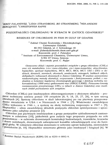 RO CZN. PZH , 2000, 51, NR 2, 119-128 'JERZY FALAND YSZ, 1LID IA STRANDBERG, BO STRANDBERG, 2PER-ANDERS BERGQVIST, 2CHRISTOFFER RAPPE P O Z O S T A Ł O Ś C I C H L O R D A N U W R Y B A C H W Z A T O C E G D A Ń S K IE J* RESID U ES O F C H LO RD A N E IN FISH IN G U LF O F GDAŃSK 1 Zakład Chemii Środowiska i Ekotoksykologii, Uniwersytet Gdański, 80-952 Gdańsk, ul. J. Sobieskiego 18 e-mail: [email protected] Kierownik: prof. J. Falandysz 2 Institute of Environmental Chemistry, Uniwersytet Umea, S-901 87 Umea, Szwecja Kierownik: prof. С. Rappe Oznaczono skład i stężenie pozostałości związków z grupy chlordanu (CHLs) oraz ich metabolitów (cis-i trans-chlordan, cis-i trans-nonachlor, oksychlordan, heptachlor, epoksyd lieptachloru, MC4, MC5, MC6, MC7, U82 i U83) w śle dziach, dorszach, storniach, okoniach, sandaczach, minogach, babkach obłych, dobijakach i tobiaszach złowionych w Zatoce Gdańskiej. W analizie zastosowano niedestrukcyjną metodę ekstrakcji, oczyszczania i frakcjonowania próbek z roz działem w kolumnie kapilarnej chromatografu gazowego i detekcją techniką niskorozdzielczej (1000 amu) spektrometrii mas (HRGCILRMS). Poruszono kwestię rozmieszczenia przestrzennego CHLs w rybach w Zatoce Gdańskiej oraz możli wych źródeł pochodzenia tych związków. C h lo rd an (C H L s) je st insektycydem chloroorganicznym o złożonym składzie - p r e p arat techniczny zaw iera p o n a d 150 zw iązków [8, 9, 18, 25, 27, 28], w tym szereg chiralnych [4]. S yntezę c h lo rd a n u w skali la b o rato ry jn ej p o raz pierw szy p rz e p ro w a dzono n iezależn ie w U S A i w N iem czech w 1944 r. [7]. W łaściw ości o w ad o b ó jcze CH Ls w ykazano w 1946 г., a syntezę na skalę te ch n ic zn ą ro z p o c zęto w 1947 r. [9]. H ep ta ch lo r - silnie ow adobójczy składnik pestycydu ch lo rd a n sy n tety zo w an o i sp rz e daw ano ja k o o d rę b n y p re p a ra t [2]. C h lo rd an je st pierw szym insektycydem z grupy pestycydów cyklodienow ych z a sto so wanym w ro lnictw ie [10], jakk o lw iek gros zużycia teg o p re p a ra tu p rzy p a d a n a cele Pozarolnicze - w o c h ro n ie d rew nianych k onstrukcji budow lan y ch , traw ników , krzew ów 1 drzew o zd obnych, drew nianych zab ezp ieczeń kanałów od w ad n iający ch o raz d o fu m i gacji gleby. W rolnictw ie ch lo rd a n stosow ano w o c h ro n ie up raw kukurydzy, ziem n iak ó w 1 P om idorów [6, 10]. H e p ta c h lo r stosow ano głów nie ja k o insektycyd i fungicyd [6]. W * Komitet Badań Naukowych (KBN) DS nr 8250-4-0092-9. 120 J. Falandysz i in. U S A o d 1946 r. o gółem w yp ro d u k o w an o 70000 to n c h lo rd a n u , z czego o k o ło 25% wy e k s p o rto w a n o [9]. O k re s w zględnie intensyw nego sto so w an ia ch lo rd a n u i h ep tac h lo ru n a św iecie p rzy p a d a n a lata 1960-te i w czesne 1970-te [10, 24]. C h lo rd a n i h ep tac h lo r sto so w an o głów nie przeciw m rów kom i term ito m . W U S A w 1986 r. przeciw term ito m zużyto 340 ton h e p ta c h lo ru [7], a w F in lan d ii w różnych celach ro k ro c zn ie zużyw ano o k o ło 60 to n [26]. W E u ro p ie i Ja p o n ii ch lo rd a n u nie p ro d u k o w a n o [1, 6]. C h lo rd an w m ałej ilości i k ró tk o sto so w an o w krajach skandynaw skich d o lat 1960-tych [23]. C h lo rd a n sto so w an o ta k ż e w P olsce [5]. N iem niej, b rak je st d o stęp n y ch danych o wiel kości zużycia i o k resie sto so w an ia C H L s w k raju. W latach 1980-tych o g raniczono w ielk o ść p ro d u k cji ch lo rd a n u w U S A [30], a p o n a d to za k az an o je g o stosow ania w N iem czech, H o la n d ii, K a n a d z ie i Ja p o n ii (tak ż e w byłym Z S R R - ch o ciaż, być może, ta k ja k to m iało m iejsce w p rzypadku D D T , zak az istniał tylko na p a p ie rz e ) [2, 10, 19]. C h lo rd a n i h e p ta c h lo r są w dalszym ciągu syntetyzow an e w U SA i ek sp o rto w an e, a A u stra lia w la tach 1987-1989 sprow adziła p o n a d 280 to n h e p ta c h lo ru i 10 ton c h lo rd a n u [22]. C h lo rd a n i h e p ta c h lo r to stosunkow o ta n ie i sk u te cz n e insektycydy 0 m ałej toksyczności ostrej o raz w zględnie b ez p ie cz n e d la p e rso n e lu w ykonującego zabiegi. Z a te m , ta k ja k m a to m iejsce w przy p ad k u tych pestycydów chloro o rg an iczn y ch , których p ro d u k cji lub sto so w an ia oficjalnie za k azan o , c h lo rd a n je st kuszącym p ro d u k tem d la n ie leg a ln e j syntezy, o b ro tu i stosow ania. S zereg sk ład n ik ó w te ch n ic zn e g o p re p a ra tu c h lo rd a n [си -i /ran s-c h lo rd a n , cis-i transn o n a c h lo r; zw iązki M C ; M C 4, M C 5, M C 6 i M C 7 (tzw. M iyazaki co m p o u n d s) oraz zw iązki U (U 8 2 i U 83 - o d o k ła d n ie n ie zn an ej stru k tu rz e )], to zw iązki trw ałe w śro dow isku. S zczególnie trw ałe są m e tab o lity c h lo rd a n u i h e p ta c h lo ru , tj. o d p o w ied n io , ok sy c h lo rd a n i epoksyd h e p ta c h lo ru . T rw ałe składniki p r e p a ra tu te ch n ic zn e g o C H L s o raz trw ałe m e tab o lity to zw iązki cech u jące się w ielo letn im o k rese m p ó łtrw an ia w różnych m atry cach środow iskow ych. C elem tej pracy je st p rze d staw ie n ie w yników b a d a ń n ad sk ład em , stę że n iem , roz m ie szczen iem p rze strzen n y m i źró d łam i p o c h o d z e n ia zw iązków z gru p y ch lo rd an u w ja d aln y c h g a tu n k a c h ryb w Z a to c e G d ań sk iej. M A TERIAŁ I M ETODYKA Ryby (tab. I) do badań złowiono w sieci stawne lub żaki w Zatoce Gdańskiej pod Gdańskiem, Gdynią lub Mikoszewem w 1992 r. Tok postępowania analitycznego obejmujący homogenizację 1 ekstrakcję próbek oraz oczyszczanie ekstraktu na drodze dializy przez półprzepuszczalną m embranę polietylenową dokładnie opisano w innej pracy [29]. Przed ekstrakcją (otwarta kolumna szklana długości 1,0-1,5 m i o średnicy wewnętrznej 4 cm), na szczy
