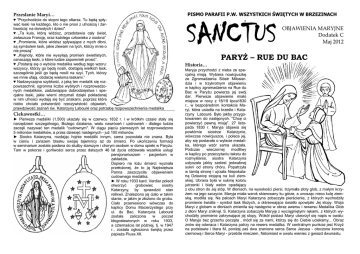 Przesłanie Maryi… ♥ "Przychodźcie do stopni tego ołtarza. Tu będą spływać łaski na każdego, kto o nie prosi z ufnością i żarliwością: na dorosłych i dzieci". ♥ „Ta kula, którą widzisz, przedstawia cały świat, zwłaszcza Francję, oraz każdego człowieka z osobna” ♥ „Promienie, które widzisz spływające z mych dłoni, są symbolem łask, jakie zlewam na tych, którzy mnie o nie proszą” ♥ „Klejnoty, które nie wysyłają promieni świetlistych, oznaczają łaski, o które ludzie zapomnieli prosić”. ♥ „Postaraj się o wybicie medalika według tego wzoru: wszyscy, którzy go będą nosili, dostąpią wielkich łask, szczególnie jeśli go będą nosili na szyi. Tych, którzy we mnie ufają, obdarzę wieloma łaskami.” ♥ Nadzwyczajna szybkość, z jaką ten medalik się rozpowszechnił, ogromna liczba wybitych i rozprowadzonych medalików, zadziwiające dobrodziejstwa i specjalne łaski, jakie wierni otrzymali dzięki pokładanej w nim ufności wydają się być znakami, poprzez które niebo chciało potwierdzić rzeczywistość objawień, prawdziwość zeznań św. Katarzyny Labouré oraz potrzebę rozpowszechnienia medalika Ciekawostki… ► Pierwsze medaliki (1.500) ukazały się w czerwcu 1832 r. i w krótkim czasie stały się narzędziem szczególnego, Bożego działania, wielu nawróceń i uzdrowień - dlatego ludzie zaczęli nazywać ten medalik "cudownym". W ciągu pięciu pierwszych lat rozprowadzono 5 milionów medalików, a przez dziesięć następnych - już 100 milionów. ► Siostra Katarzyna, rozdając hojnie medaliki innym, sama pozostała nie znana. Była w cieniu i zarazem blasku swojej tajemnicy aż do śmierci. Po ukończeniu formacji w seminarium została posłana do służby starszym i chorym osobom w domu opieki w Paryżu. Tam w pokorze i gorliwości serca przez dalszych 46 lat życia oddawała wszelkie usługi pensjonariuszom - pacjentom w zakładzie. Dopiero na łożu śmierci wyznała przełożonej, że to ją Najświętsza Panna zaszczyciła objawieniem cudownego medalika. ► W roku 1933 kard. Verdier polecił otworzyć grobowiec siostry Katarzyny, by sprawdzić stan relikwii. Znaleziono jej ciało w takim stanie, w jakim je złożono do grobu. Ciało przeniesiono wówczas do kaplicy Domu Macierzystego przy ul. du Bac. Katarzyna Labouré została zaliczona w poczet błogosławionych w roku 1933, a czternaście lat później, tj. w 1947 r., została ogłoszona świętą przez papieża Piusa XII. PISMO PARAFII P.W. WSZYSTKICH ŚWIĘTYCH W BRZEZINACH SANCTUS OBJAWIENIA MARYJNE Dodatek C Maj 2012 PARYŻ – RUE DU BAC Historia… Maryja przychodzi z nieba ze specjalną misją. Wybiera nowicjuszkę ze Zgromadzenia Sióstr Miłosierdzia i w trzykrotnym objawieniu w kaplicy zgromadzenia na Rue du Bac w Paryżu powierza jej swój dar. Pierwsze objawienie miało miejsce w nocy z 18/19 lipca1830 r., w bezpośrednim kontakcie Maryi, która usiadła na krześle i Katarzyny Labouré. Było jakby przygotowaniem do następnych. "Chcę ci powierzyć pewną misję". 27 listopada 1830 r. Maryja objawia się powtórnie siostrze Katarzynie, wówczas nowicjuszce, i poleca jej, aby się postarała o wybicie medalika, którego wzór sama ukazała. Podczas wieczornej modlitwy w kaplicy po przeczytaniu tekstu do rozmyślania, siostra Katarzyna usłyszała jakby szelest jedwabnej sukni od strony chóru. Popatrzyła w tamtą stronę i ujrzała Niepokalaną Dziewicę stojącą na kuli ziemskiej. Ubrana była w suknię koloru jutrzenki i biały welon opadający z obu stron do Jej stóp. W dłoniach, na wysokości piersi, trzymała złoty glob, z małym krzyżem na jego szczycie. Maryja miała wzrok skierowany ku górze, a unosząc nieco kulę ziemską, modliła się. Na palcach Maryi Katarzyna zobaczyła pierścienie, z których wychodziły promienie światła - symbol łask Bożych, a olśniewające światło spowijało Jej stopy. Wizja Maryi z globem w dłoniach zmieniła się następnie w obraz awersu i rewersu Medalika Glob z dłoni Maryi zniknął. S. Katarzyna zobaczyła Maryję z wyciągniętymi rękami, z których wychodziły promienie zakrywające jej stopy. Wokół postaci Maryi utworzył się napis w owalu: O Maryjo bez grzechu poczęta , módl się za nami, którzy się do Ciebie uciekamy... Obraz znów się odwraca i Katarzyna patrzy na rewers medalika. W centralnym punkcie jest Krzyż na podstawie i litera M, poniżej zaś dwa zranione serca Serce Jezusa - otoczone koroną cierniową i Serce Maryi - przebite mieczem, Natomiast w owalu wieniec z gwiazd dwunastu.