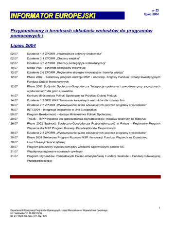 INFORMATOR EUROPEJSKI nr 53 lipiec 2004 Przypominamy o terminach składania wniosków do programów pomocowych ! Lipiec 2004 02.07 Działanie 1.2 ZPORR „Infrastruktura ochrony środowiska” 02.07 Działanie 3.1 ZPORR „Obszary wiejskie” 02.07 Działanie 3.2 ZPORR „Obszary podlegające restrukturyzacji” 10.07 Media Plus – schemat selektywny dystrybucji 12.07 Działanie 2.6 ZPORR „Regionalne strategie innowacyjne i transfer wiedzy” 12.07 Phare 2002 - Sektorowy program rozwoju MŚP i innowacji. Krajowy Fundusz Dotacji Inwestycyjnych Fundusz Dotacji Inwestycyjnych 12.07 Phare 2002 Spójność Społeczno-Gospodarcza "Integracja społeczna i zawodowa grup zagrożonych wykluczeniem" dla gmin i powiatów 14.07 Konkurs Ministerstwa Polityki Społecznej na Przykład Dobrej Praktyki 14.07 Działanie 1.3 SPO WKP Tworzenie korzystnych warunków dla rozwoju firm 16.07 Działanie 2.2 ZPORR „Wyrównywanie szans edukacyjnych poprzez programy stypendialne” 16.07 INTI 2004 – integracja imigrantów w Unii Europejskiej 20.07 Program Bezdomność – dotacje Ministerstwa Polityki Społecznej 20.07 TACIS – IBPP wsparcie dla społeczeństwa obywatelskiego i inicjatyw lokalnych na Białorusi 26.07 Phare 2002 Spójność Społeczno-Gospodarcza Przedsiębiorczość w Polsce - Regionalny Program Wsparcia dla MSP Program Rozwoju Przedsiębiorstw Eksportowych 30.07 Działanie 2.2 ZPORR „Wyrównywanie szans edukacyjnych poprzez programy stypendialne” 30.07 Phare 2002 Sektorowy Program Rozwoju MSP i Innowacji. Fundusz Wsparcia na Doradztwo 30.07 Laur Edukacji Samorządowej 30.07 Program pilotażowy wymian pomiędzy władzami sądowniczymi państw UE. 31.07 Współpraca sądowa w sprawach cywilnych 31.07 Program Stypendiów Pomostowych Polsko-Amerykańskiej Fundacji Wolności i Fundacji Edukacyjnej Przedsiębiorczości Departament Koordynacji Programów Operacyjnych, Urząd Marszałkowski Województwa Opolskiego Ul. Piastowska 12, 45-082 Opole tel. 077 4524 308, faks. 077 4524 821 1 WYDARZENIA CO BYŁO ? W dniu 21 czerwca 2004 r. w sali konferencyjnej Biura Zarządzania Funduszami Europejskimi przy Opolskim Urzędzie Wojewódzkim (ul. Piastowska 15, Opole) odbyło się posiedzenie Regionalnego Komitetu Sterującego ds. rozwoju regionu. Celem spotkania było zaopiniowanie przez członków Komitetu list rankingowych wniosków złożonych do Kontraktu dla Województwa Opolskiego na rok 2004 oraz Ramowych Planów Realizacji Działań na rok 2004 Zintegrowanego Programu Operacyjnego Rozwoju Regionalnego (dot. Działań 2.1. „Rozwój umiejętności powiązany z potrzebami regionalnego rynku pracy i możliwości kształcenia ustawicznego w regionie”; 2.2. „Wyrównywanie szans edukacyjnych poprzez programy stypendialne”; 2.3. „Reorientacja zawodowa osób odchodzących z rolnictwa”; 2.4. „Reorientacja zawodowa osób zagrożonych procesami restrukturyzacyjnymi”). W dniu 18 czerwca b.r. w Sali Herbowej (ul. Piastowska 14) odbyła się konferencja inaugurująca wdrażanie Zintegrowanego Programu Operacyjnego Rozwoju Regionalnego na lata 20042006 (ZPORR) w Województwie Opolskim. Podczas konferencji zaprezentowane zasady przygotowania i naboru projektów (terminy składania wniosków, niezbędne dokumenty, kwalifikowalność wydatków) oraz zasady korzystania z „Generatora Wniosków”. W dniu 14 czerwca 2004 r. w sali konferencyjnej Biura Zarządzania Funduszami Europejskimi przy Opolskim Urzędzie Wojewódzkim (ul. Piastowska 15, Opole) odbyło się szkolenie dla komendantów powiatowych Policji na temat możliwości wsparcia z programów europejskich i krajowych. Podczas szkolenia pracownicy DPO UMWO omówili możliwości uzyskania wsparcia z funduszy strukturalnych w ramach Zintegrowanego Programu Rozwoju Regionalnego (ZPORR), Inicjatywy Wspólnotowej INTERREG, Kontraktu Województwa Opolskiego, programów finansowanych bezpośrednio przez Komisję Europejską. Ponadto zostały zaprezentowane procedury zgłaszania projektów tj. tryb zgłaszania projektów, tryb oceny formalnej i merytorycznej wniosków, zasady opiniowania i wyboru wniosków. Na zakończenie spotkania przedstawiciel Biura Zarządzania Funduszami Europejskimi Opolskiego Urzędu Wojewódzkiego przedstawił obowiązki beneficjentów w ramach ZPORR. W dniu 8 czerwca b.r. w sali konferencyjnej Biura Zarządzania Funduszami Europejskimi przy Opolskim Urzędzie Wojewódzkim (ul. Piastowska 15, Opole).odbyło się posiedzenie Regionalnego Komitetu Sterującego ds. rozwoju. Celem spotkania było zaopiniowanie przez członków Komitetu projektu „Planu działań informacyjno – promocyjnych Województwa Opolskiego na lata 2004 – 2006” oraz Ramowego Planu Realizacji Działania 2.2 „Wyrównywanie szans edukacyjnych poprzez programy stypendialne” Zintegrowanego Programu Operacyjnego Rozwoju Regionalnego (ZPORR) i Ramowego Planu Realizacji Działania 2.6 „Regionalne Strategie Innowacyjne i transfer wiedzy” ZPORR. Ponadto na posiedzeniu przedstawiono informację na temat aktualnej sytuacji programu SAPARD w Województwie Opolskim, a także przyjęto następujące uchwały: - w sprawie rekomendacji realokacji środków Działania 2 Programu SAPARD (Roczna Umowa Finansowa 20002001) w Województwie Opolskim; - w sprawie rekomendacji realokacji środków Działania 2 Programu SAPARD (Roczna Umowa Finansowa 20022003) w Województwie Opolskim - w sprawie rekomendacji realokacji środków Działania 2 Programu SAPARD (RUF 2004 – Aneks do Planu Rozwoju Obszarów Wiejskich) w Województwie Opolskim - w sprawie upoważnienia Opolskiego Oddziału Regionalnego Agencji Restrukturyzacji i Modernizacji Rolnictwa do uzupełniania i realokacji środków Działania 4 Programu SAPARD w Województwie Opolskim. W dniu 27 maja b.r. w Sali Osmańczyka (Opole, ul. Piastowska 14) odbyło się spotkanie robocze członków Komitetu Oceny Wniosków do Kontraktu Wojewódzkiego. Celem spotkania było omówienie bieżących prac Komisji. Podczas 