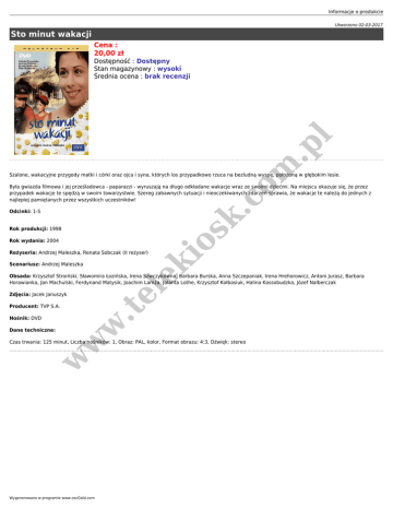 Informacje o produkcie Utworzono 02-03-2017 Sto minut wakacji Cena : 20,00 zł m .p l Dostępność : Dostępny Stan magazynowy : wysoki Średnia ocena : brak recenzji Szalone, wakacyjne przygody matki i córki oraz ojca i syna, których los przypadkowo rzuca na bezludną wyspę, położoną w głębokim lesie. .c o Była gwiazda filmowa i jej prześladowca - paparazzi - wyruszają na długo odkładane wakacje wraz ze swoimi dziećmi. Na miejscu okazuje się, że przez przypadek wakacje te spędzą w swoim towarzystwie. Szereg zabawnych sytuacji i nieoczekiwanych zdarzeń sprawia, że wakacje te należą do jednych z najlepiej pamiętanych przez wszystkich uczestników! sk Odcinki: 1-5 Rok wydania: 2004 ek Reżyseria: Andrzej Maleszka, Renata Sobczak (II reżyser) io Rok produkcji: 1998 Scenariusz: Andrzej Maleszka .t el Obsada: Krzysztof Stroiński, Sławomira Łozińska, Irena Szwczykówna, Barbara Burska, Anna Szczepaniak, Irena Hrehorowicz, Antoni Jurasz, Barbara Horawianka, Jan Machulski, Ferdynand Matysik, Joachim Lamża, Jolanta Lothe, Krzysztof Kołbasiuk, Halina Kossobudzka, Józef Nalberczak Zdjęcia: Jacek Januszyk Producent: TVP S.A. Dane techniczne: w Nośnik: DVD w w Czas trwania: 125 minut, Liczba nośników: 1, Obraz: PAL, kolor, Format obrazu: 4:3, Dźwięk: stereo Wygenerowano w programie www.oscGold.com