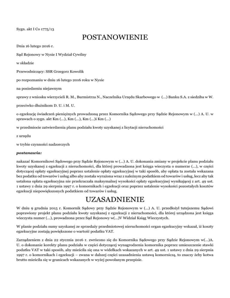 Sygn. akt I Co 1775/13 POSTANOWIENIE Dnia 16 lutego 2016 r. Sąd Rejonowy w Nysie I Wydział Cywilny w składzie Przewodniczący: SSR Grzegorz Kowolik po rozpoznaniu w dniu 16 lutego 2016 roku w Nysie na posiedzeniu niejawnym sprawy z wniosku wierzycieli R. M., Burmistrza N., Naczelnika Urzędu Skarbowego w (...) Banku S.A. z siedziba w W. przeciwko dłużnikom D. U. i M. U. o egzekucję świadczeń pieniężnych prowadzoną przez Komornika Sądowego przy Sądzie Rejonowym w (...) A. U. w sprawach o sygn. akt Km (...), Km (...), Km (...)i Km (...) w przedmiocie zatwierdzenia planu podziału kwoty uzyskanej z licytacji nieruchomości z urzędu w trybie czynności nadzorczych postanawia: nakazać Komornikowi Sądowego przy Sądzie Rejonowym w (...) A. U. dokonania zmiany w projekcie planu podziału kwoty uzyskanej z egzekucji z nieruchomości, dla której prowadzona jest księga wieczysta o numerze (...), w części dotyczącej opłaty egzekucyjnej poprzez ustalenie opłaty egzekucyjnej w taki sposób, aby opłata ta została wskazana bez podatku od towarów i usług albo aby została wyrażona wraz z należnym podatkiem od towarów i usług, lecz aby tak ustalona opłata egzekucyjna nie przekraczała maksymalnej wysokości opłaty egzekucyjnej wynikającej z art. 49 ust. 1 ustawy z dnia 29 sierpnia 1997 r. o komornikach i egzekucji oraz poprzez ustalenie wysokości pozostałych kosztów egzekucji niepowiększonych podatkiem od towarów i usług. UZASADNIENIE W dniu 9 grudnia 2015 r. Komornik Sądowy przy Sądzie Rejonowym w (...) A. U. przedłożył tutejszemu Sądowi poprawiony projekt planu podziału kwoty uzyskanej z egzekucji z nieruchomości, dla której urządzona jest księga wieczysta numer (...), prowadzona przez Sąd Rejonowy w(...)V Widział Ksiąg Wieczystych. W planie podziału sumy uzyskanej ze sprzedaży przedmiotowej nieruchomości organ egzekucyjny wskazał, iż koszty egzekucyjne zostają powiększone o wartość podatku VAT. Zarządzeniem z dnia 22 stycznia 2016 r. zwrócono się do Komornika Sądowego przy Sądzie Rejonowym w(...)A. U. o dokonanie korekty planu podziału w części dotyczącej wynagrodzenia komornika poprzez umieszczenie stawki podatku VAT w taki sposób, aby mieściła się ona w widełkach wskazanych w art. 49 ust. 1 ustawy z dnia 29 sierpnia 1997 r. o komornikach i egzekucji – zwana w dalszej części uzasadnienia ustawą komorniczą, to znaczy żeby kotwa brutto mieściła się w granicach wskazanych w wyżej powołanym przepisie. W odpowiedzi na wyżej wskazane zarządzenie organ egzekucyjny wskazał, że niemożliwym jest na tym etapie wykonanie woli Sądu, albowiem jak wynika wprost z art. 1035 Kodeksu postępowania cywilnego, który wskazuje, że niezwłocznie po złożeniu na rachunek depozytowy Ministra Finansów sumy ulegającej podziałowi komornik sporządza się projekt planu podziału sumy uzyskanej z egzekucji i przedkłada się go sądowi. Zdaniem komornika, sporządzony plan podziału w żaden sposób nie narusza dyspozycji art. 49 ust. 1 ustawy komorniczej albowiem opłaty egzekucyjne wskazane w projekcie planu podziału w żaden sposób nie naruszają wyżej wskazanej regulacji i zostały ustalone w prawidłowej wysokości. Organ egzekucyjny na uzasadnienie swego stanowiska powołał się na treść orzeczeń Sądu Najwyższego, orzeczenia innych sądów powszechnych oraz opinie prawne. Dalej komornik wywodził, że opłaty egzekucyjne stanowią wynagrodzenie komornika, to jest zapłatę jaką komornik ma otrzymać tytułem wykonywanych czynności i to właśnie ta kwota stanowi podstawę opodatkowania, co oznacza że należy ją zwiększyć o kwotę stawki podatku. W ocenie komornika, w celu umożliwienia komornikowi wykonania obowiązku podatkowego, po uprawomocnieniu się planu podziału, suma naliczonego podatku VAT winna zostać przekazana komornikowi przez Sąd wraz z należną komornikowi opłatą egzekucyjną. Sąd zważył, co następuje: Zgodnie z art. 759 in genere Kodeksu postępowania cywilnego czynności egzekucyjne są wykonywane przez komorników z wyjątkiem czynności zastrzeżonych dla sądów. Sąd może z urzędu wydawać komornikowi zarządzenia zmierzające do zapewnienia należytego wykonania egzekucji oraz usuwać spostrzeżone uchybienia. W pierwszej kolejności, dokonując oczyszczenia przedpola do dalszych rozważań podnieść należy, iż powołane przez komornika stanowisko Sądu Najwyższego zawarte w orzeczeniu z dnia 15 grudnia 2006 r., w sprawie o sygn. akt 115/06, nie może mieć zastosowania w rozpoznawanej sprawie, albowiem układ faktyczny ocenianej przez Sąd Najwyższy sprawy różni się od stanu faktycznego niniejszej sprawy. Wskazać jedynie należy, że Sąd Najwyższy w wyżej wskazanym orzeczeniem wyraził zapatrywanie uznając, że jeżeli na dłużniku spoczywa obowiązek podatkowy związany ze sprzedażą towarów, w planie podziału sumy uzyskanej z egzekucji z nieruchomości jako sumę ulegającą podziałowi (art. 1024 § 1 punkt 1 Kodeksu postępowania cywilnego) wymienia się kwotę uzyskaną z egzekucji, pomniejszoną o podatek od towarów i usług. W tym ujęciu komornik traktowany jest jako płatnik podatku VAT, zaś niniejsza sprawa odnosi się do roli komornika jako podatnika podatku VAT, stąd też wyżej wskazane zapatrywanie prawne pozostaje w stosunku irrelewantnym do przedmiotowego zagadnienia, ocenianego w niniejszej sprawie. Godzi się w tym miejscu zaakcentować, iż według art. 49 ust. 1 ustawy komorniczej wysokość opłaty stosunkowej oblicza się według stawki procentowej od wartości wyegzekwowanego świadczenia. Stawka ta wynosi w zasadzie 15% z kwotowymi ograniczeniami w postaci minimalnej i maksymalnej wysokości opłaty stosunkowej, która nie może być niższa niż 1/10 i wyższa niż trzydziestokrotna wysokość przeciętnego wynagrodzenia miesięcznego. W świetle art. 15 ust. 1 ustawy o z dnia 11 marca 2004 r. o podatku od towarów i usług, zwanej