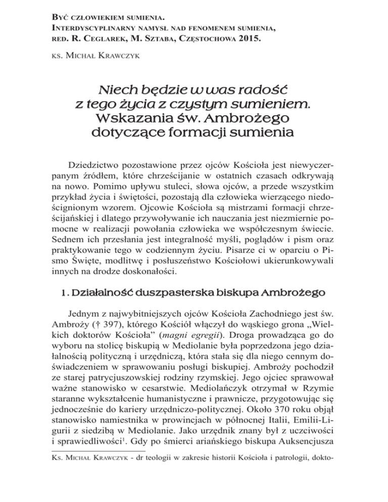 Być człowiekiem sumienia. Interdyscyplinarny namysł nad fenomenem sumienia, red. R. Ceglarek, M. Sztaba, Częstochowa 2015. ks. Michał Krawczyk Niech będzie w was radość z tego życia z czystym sumieniem. Wskazania św. Ambrożego dotyczące formacji sumienia Dziedzictwo pozostawione przez ojców Kościoła jest niewyczerpanym źródłem, które chrześcijanie w ostatnich czasach odkrywają na nowo. Pomimo upływu stuleci, słowa ojców, a przede wszystkim przykład życia i świętości, pozostają dla człowieka wierzącego niedoścignionym wzorem. Ojcowie Kościoła są mistrzami formacji chrześcijańskiej i dlatego przywoływanie ich nauczania jest niezmiernie pomocne w realizacji powołania człowieka we współczesnym świecie. Sednem ich przesłania jest integralność myśli, poglądów i pism oraz praktykowanie tego w codziennym życiu. Pisarze ci w oparciu o Pismo Święte, modlitwę i posłuszeństwo Kościołowi ukierunkowywali innych na drodze doskonałości. 1. Działalność duszpasterska biskupa Ambrożego Jednym z najwybitniejszych ojców Kościoła Zachodniego jest św. Ambroży († 397), którego Kościół włączył do wąskiego grona „Wielkich doktorów Kościoła” (magni egregii). Droga prowadząca go do wyboru na stolicę biskupią w Mediolanie była poprzedzona jego działalnością polityczną i urzędniczą, która stała się dla niego cennym doświadczeniem w sprawowaniu posługi biskupiej. Ambroży pochodził ze starej patrycjuszowskiej rodziny rzymskiej. Jego ojciec sprawował ważne stanowisko w cesarstwie. Mediolańczyk otrzymał w Rzymie staranne wykształcenie humanistyczne i prawnicze, przygotowując się jednocześnie do kariery urzędniczo-politycznej. Około 370 roku objął stanowisko namiestnika w prowincjach w północnej Italii, Emilii-Ligurii z siedzibą w Mediolanie. Jako urzędnik znany był z uczciwości i sprawiedliwości1. Gdy po śmierci ariańskiego biskupa Auksencjusza Ks. Michał Krawczyk - dr teologii w zakresie historii Kościoła i patrologii, dokto- 196 Ks. M. Krawczyk doszło do sporów pomiędzy katolikami i arianami o wybór następcy, Ambroży podjął działania zmierzające do rozwiązania sporu i zaprowadzenia porządku w mieście. Niespodziewanie został przez oba stronnictwa zgłoszony jako kandydat na nowego biskupa, pomimo tego, że był katechumenem. Kandydaturę przyjęli biskupi, zatwierdził cesarz Walentynian I. Ponad trzydziestoletni wówczas Ambroży zrezygnował z kariery urzędniczej, przyjął chrzest i po ośmiu dniach w roku 374 został konsekrowany na biskupa Mediolanu. W swojej działalności Ambroży zajmował się przede wszystkim posługą duszpasterską. Aby dobrze sprawować swój urząd, również w wymiarze nauczycielskim, Mediolańczyk dużo czasu poświęcał na lekturę Pisma Świętego. Znając język grecki, czytał także dzieła ojców greckich, szczególnie w kwestiach dotyczących interpretacji Biblii. W swojej posłudze nie zapominał o pomocy ubogim, angażował się w budowę świątyń, uroczyste translokacje relikwii2, dbał o piękno liturgii. Biskup Mediolanu skupił wokół siebie także środowisko intelektualne, złączone zamiłowaniem do Pisma Świętego. Interesowała ich także myśl neoplatońska i jej wykorzystanie do nauki chrześcijańskiej3. rant w Instytucie Historii Sztuki KUL, wykładowca historii sztuki w Wyższym Seminarium Duchownym w Radomiu, Diecezjalny Konserwator Zabytków w Radomiu, członek Sekcji Patrystycznej przy Komisji ds. Nauki Katolickiej Konferencji Episkopatu Polski. 1 A. Żurek, Wprowadzenie do Ojców Kościoła, Tarnów 2005, s. 184; J. Pałucki, Święty Ambroży jako duszpasterz w świetle ekshortacji pastoralnych, Lublin 1996, s. 17-25. 2 W ówczesnym Imperium Romanum były dwie tradycje kultu relikwii: wschodnia i zachodnia. Związane to było z odmiennym podejściem do ówczesnego prawa, które zakazywało przenoszenia ciała zmarłego. Na Wschodzie w IV w., gdy Kościół uzyskał większą swobodę, chrześcijanie pragnęli posiadać szczątki męczenników. Nie przestrzegano tam ściśle zakazu ekshumacji. Kościół w Mediolanie przejął w tym aspekcie tradycję Wschodnią. W 376 roku sprowadzono z Kapadocji relikwie św. Dionizego, który był biskupem Mediolanu w latach 351-359. Zob. R. Andrzejewski, Kult relikwii według św. Ambrożego, „Roczniki Teologiczno-Kanoniczne”, 1979, t. 26, z. 4, s. 73-77; P. Brown, Kult świętych. Narodziny i rola w chrześcijaństwie łacińskim, Kraków 2007, s. 30-31; R. Wiśniewski, Narodziny kultu relikwii i jego najwcześniejsze świadectwa, [w:] Początki kultu relikwii na Zachodzie, „Akme. Źródła Starożytne”, t. 2, red. R. Wiśniewskiego, Warszawa 2011, s. 18-19. 3 J. Naumowicz, Wstęp, [w:] Św. Ambroży z Mediolanu, Listy, t. 1, „Biblioteka Ojców Kościoła”, Kraków 1997, s. 8-9; J. Pałucki, Św. Ambroży, opatrznościowy mąż Kościoła – między starymi a nowymi czasy, „Studia Antiquitatis Christianae”, 2001, t. 15, s. 206; Zob. J. Pałucki, Nawróceni grzesznicy i ich wkład w kształtowanie obrazu świętego Kościoła na przełomie IV i V wieku, „Teologia Patrystyczna”, 2004, t. 1, s. 29-41. Wskazania św. Ambrożego... 197 Jako biskup, pomimo słabego głosu, wyróżniał się także głoszonymi homiliami, których słuchały rzesze wiernych, o czym zaświadcza w swoich Wyznaniach św. Augustyn4. 2. Epistolografia św. Ambrożego Przedmiotem niniejszego artykułu będzie omówienie ambrozjańskiej formacji sumienia w oparciu o epistolografię naszego autora. Wydaje się, że analiza listów Mediolańczyka pozwoli na lepsze zrozumienie nauczania Ambrożego w omawianej kwestii, gdyż nie są to teologiczne traktaty, ale pisma, które odnoszą się do konkretnych osób i sytuacji. Korespondencja św. Ambrożego jest jedną z bardziej interesujących części jego dorobku piśmienniczego. Biskup Mediolanu stosował w swoich listach starożytne zasady szt