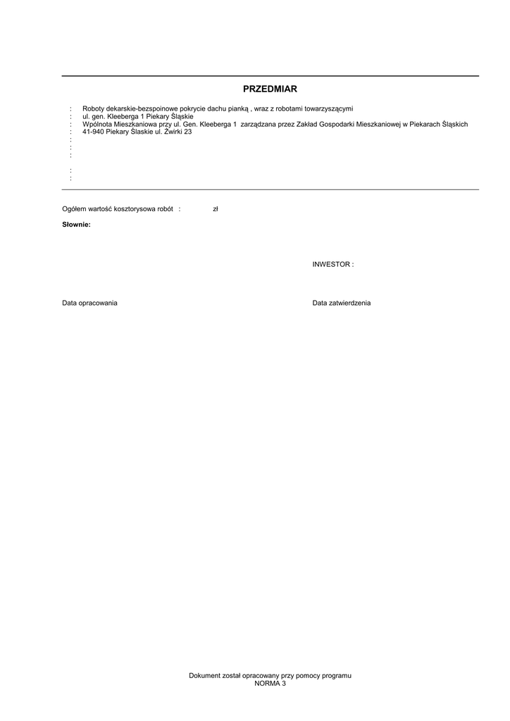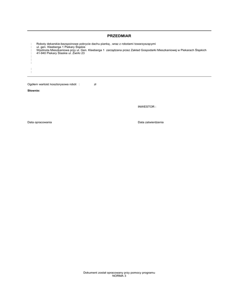 PRZEDMIAR : : : : : : : Roboty dekarskie-bezspoinowe pokrycie dachu pianką , wraz z robotami towarzyszącymi ul. gen. Kleeberga 1 Piekary Śląskie Wpólnota Mieszkaniowa przy ul. Gen. Kleeberga 1 zarządzana przez Zakład Gospodarki Mieszkaniowej w Piekarach Śląskich 41-940 Piekary Ślaskie ul. Żwirki 23 : : Ogółem wartość kosztorysowa robót : zł Słownie: INWESTOR : Data opracowania Data zatwierdzenia Dokument został opracowany przy pomocy programu NORMA 3 Pianka Kleeberga 1 .KST KSIĄŻKA PRZEDMIARÓW Lp. Podst Opis i wyliczenia j.m. 1 Krycie dachu metodą natrysku dynamicznego pianką PUR wraz z robotami towarzyszącymi 1.1 Analiza włas-Roboty przygotowawcze: oczyszczenie i odkurzenie połaci dachu z luźnych cząs- m2 na tek, likwidacja pęcherzy w pokryciu z papypolegająca na ich rozcięciu i podlkejenie oaz inne prace towarzyszące, osłony antypyłowe, przekładanie kabli antetnowych itp 600.00 m2 1.2 Analiza włas-Perforacja starego pokrycia papowego w celu eliminacji zawilgoceń wgłębnych na 600.00 m2 1.4 Analiza włas-Malowanie powierzchni pianki PUR farbą refleksyjną przeciw UV wraz z posypką m2 na fylitową przeciw ptakom 600.00 m2 2.2 KNR 2-02 0508-04 2.3 KNR 4-01 0535-06 2.4 KNR 2-02 0510-04 2.5 KNR 2-02 0508-09 m m 136.00 m Rozebranie rur spustowych z blachy nie nadającej się do użytku m 102.00 m Rury spustowe okrągłe o śr.15cm - z blachy ocynkowanej m 102.00 m Zbiorniczki przy rynnach - z blachy ocynkowanej szt. 8 szt. 600.000 600.000 RAZEM 600.000 600.000 RAZEM 600.000 600.000 RAZEM 600.000 136.000 RAZEM 136.000 136.000 RAZEM 136.000 102.000 RAZEM 102.000 102.000 RAZEM 102.000 8.000 RAZEM 8.000 136.000 RAZEM 136.000 136.000 RAZEM 136.000 26.000 RAZEM 26.000 46.000 RAZEM 46.000 218.000 RAZEM 218.000 45.000 RAZEM 45.000 26.000 RAZEM 26.000 16.000 RAZEM 16.000 102.000 RAZEM 102.000 m2 m2 3.2 KNR-W 2-02 Obróbki przy szer. w rozwinięciu ponad 25 cm - z blachy stalowej ocynkowanej i 0514-02 powlekanej - pasy okapowe 136.00 m2 m2 4 INSTALACJA ODGROMOWA 4.1 KNR-W 4-03 Wymiana wsporników naciągowych instalacji odgromowej naprężanej z jedną złą- szt. 0703-05 czką przelotową naprężajacą na dachu betonowym krytym blachą lub papą 26.00 szt. 4.2 KNR-W 4-03 Wymiana przewodów instalacji odgromowej z płaskownika lub pręta o przekroju 0706-01 do 200 mm2 na dachach płaskich na uprzednio zamocowanych wspornikach 46.00 m 4.3 KNR-W 4-03 Wymiana przewodów instalacji odgromowej z płaskownika lub pręta o przekroju 0706-01 do 200 mm2 na dachach płaskich na uprzednio zamocowanych wspornikach 218.00 m 4.4 KNR-W 4-03 Wymiana złączy uniwersalnych lub krzyżowych instalacji odgromowych 0711-09 45.00 szt. m m szt. 4.5 KNR-W 4-03 Wymiana wsporników naciągowych instalacji odgromowej naprężanej z jedną złą- szt. 0703-01 czką przelotową naprężającą na ścianie z cegły 26.00 szt. 4.6 KNR-W 4-03 Wymiana wsporników instalacji odgromowej i przewodów wyrównawczychw kana- szt. 0701-01 łach na cegle lub gazobetonie 16 szt. 4.7 KNR-W 4-03 Wymiana przewodów instalacji uziemiającej i odgromowej i przewodów wyrównaw-m 0704-08 czych z pręta o przekroju do 120 mm2 w ciągu pionowym 102 m -2- Norma 3.16 Licencja: 15014 dla ZGM 600.000 RAZEM m Rynny dachowe półokrągłe o śr.15cm - z blachy ocynkowanej 3 Obrobki blacharskie 3.1 Analiza włas-"Domocowanie' obrobek blacharskich na 136.00 Razem m2 1.3 Analiza włas-Natrysk warstwy pianki PUR gr. 3.0 cm na powierzchnię dachu wraz z wywwinię- m2 na ciem na ścianki murków ogniowych , attykowych i kominów 600.00 m2 2 Rynny dachowe 2.1 KNR 4-01 Rozebranie rynien z blachy nie nadającej się do użytku 0535-04 136.00 Poszcz Pianka Kleeberga 1 .KST KSIĄŻKA PRZEDMIARÓW Lp. Podst Opis i wyliczenia j.m. 4.8 KNR-W 4-03 Wymiana wsporników instalacji odgromowej i przewodów wyrównawczychna ścia- szt. 0701-04 nie z cegły lub gazobetonu 16 szt. 4.9 KNR-W 4-03 Wymiana wsporników instalacji odgromowej i przewodów wyrównawczychna kons-szt. 0701-07 trukcji stalowej mocowanych przez spawanie 16 szt. 4.10 KNR-W 4-03 Wymiana złączy kontrolnych instalacji odgromowych z połączeniem pręt-płaskow- szt. 0711-06 nik 21 szt. 4.11 KNR-W 4-03 Pierwszy pomiar instalacji odgromowej 1205-03 1 pomiar. 4.12 KNR-W 4-03 Następny pomiar instalacji odgromowej 1205-04 1 pomiar. pomiar. pomiar. -3- Norma 3.16 Licencja: 15014 dla ZGM Poszcz Razem 16.000 RAZEM 16.000 16.000 RAZEM 16.000 21.000 RAZEM 21.000 1.000 RAZEM 1.000 1.000 RAZEM 1.000