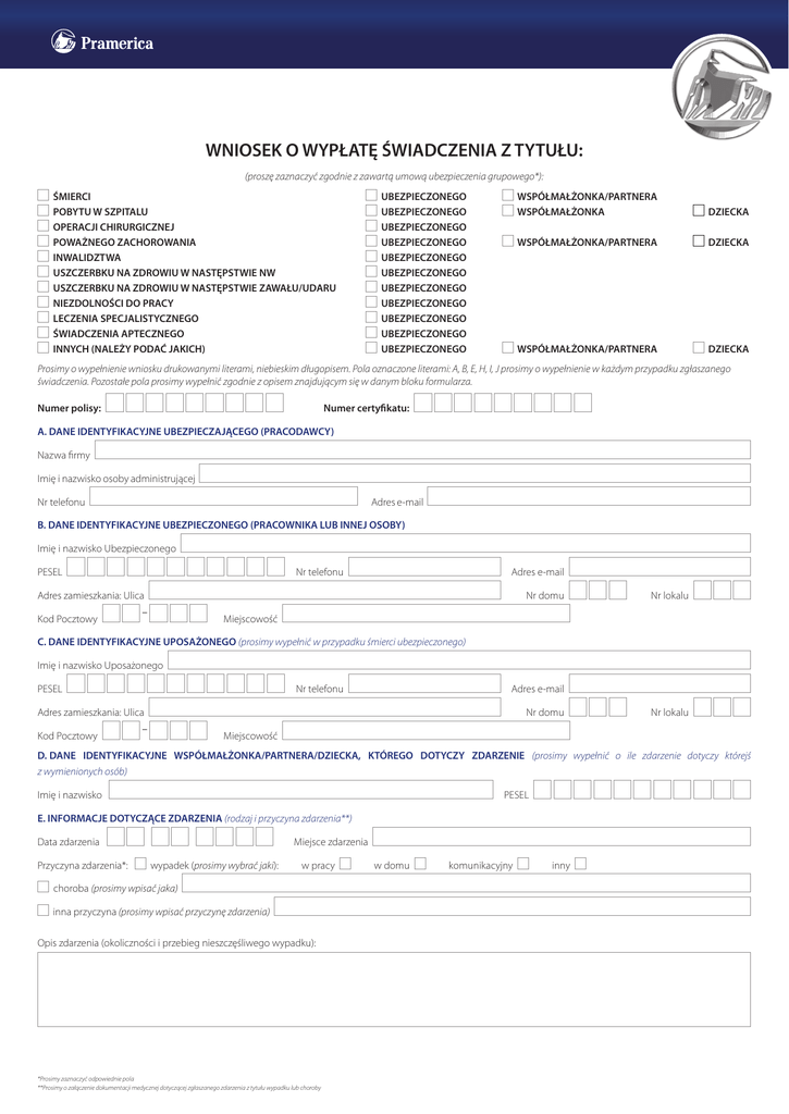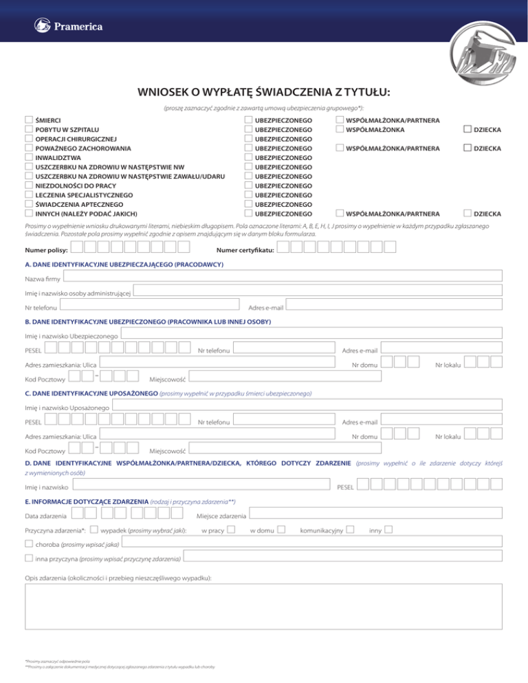 WNIOSEK O WYPŁATĘ ŚWIADCZENIA Z TYTUŁU: (proszę zaznaczyć zgodnie z zawartą umową ubezpieczenia grupowego*): ŚMIERCI POBYTU W SZPITALU OPERACJI CHIRURGICZNEJ POWAŻNEGO ZACHOROWANIA INWALIDZTWA USZCZERBKU NA ZDROWIU W NASTĘPSTWIE NW USZCZERBKU NA ZDROWIU W NASTĘPSTWIE ZAWAŁU/UDARU NIEZDOLNOŚCI DO PRACY LECZENIA SPECJALISTYCZNEGO ŚWIADCZENIA APTECZNEGO INNYCH (NALEŻY PODAĆ JAKICH) UBEZPIECZONEGO UBEZPIECZONEGO UBEZPIECZONEGO UBEZPIECZONEGO UBEZPIECZONEGO UBEZPIECZONEGO UBEZPIECZONEGO UBEZPIECZONEGO UBEZPIECZONEGO UBEZPIECZONEGO UBEZPIECZONEGO WSPÓŁMAŁŻONKA/PARTNERA WSPÓŁMAŁŻONKA DZIECKA WSPÓŁMAŁŻONKA/PARTNERA DZIECKA WSPÓŁMAŁŻONKA/PARTNERA DZIECKA Prosimy o wypełnienie wniosku drukowanymi literami, niebieskim długopisem. Pola oznaczone literami: A, B, E, H, I, J prosimy o wypełnienie w każdym przypadku zgłaszanego świadczenia. Pozostałe pola prosimy wypełnić zgodnie z opisem znajdującym się w danym bloku formularza. Numer polisy: Numer certyfikatu: A. DANE IDENTYFIKACYJNE UBEZPIECZAJĄCEGO (PRACODAWCY) Nazwa firmy Imię i nazwisko osoby administrującej Nr telefonu Adres e-mail B. DANE IDENTYFIKACYJNE UBEZPIECZONEGO (PRACOWNIKA LUB INNEJ OSOBY) Imię i nazwisko Ubezpieczonego Nr telefonu PESEL Adres e-mail Adres zamieszkania: Ulica Kod Pocztowy Nr domu – Nr lokalu Nr lokalu Miejscowość C. DANE IDENTYFIKACYJNE UPOSAŻONEGO (prosimy wypełnić w przypadku śmierci ubezpieczonego) Imię i nazwisko Uposażonego Nr telefonu PESEL Adres e-mail Adres zamieszkania: Ulica Kod Pocztowy Nr domu – Miejscowość D. DANE IDENTYFIKACYJNE WSPÓŁMAŁŻONKA/PARTNERA/DZIECKA, KTÓREGO DOTYCZY ZDARZENIE (prosimy wypełnić o ile zdarzenie dotyczy którejś z wymienionych osób) PESEL Imię i nazwisko E. INFORMACJE DOTYCZĄCE ZDARZENIA (rodzaj i przyczyna zdarzenia**) Data zdarzenia Przyczyna zdarzenia*: wypadek (prosimy wybrać jaki): Miejsce zdarzenia w pracy choroba (prosimy wpisać jaka) inna przyczyna (prosimy wpisać przyczynę zdarzenia) Opis zdarzenia (okoliczności i przebieg nieszczęśliwego wypadku): *Prosimy zaznaczyć odpowiednie pola **Prosimy o załączenie dokumentacji medycznej dotyczącej zgłaszanego zdarzenia z tytułu wypadku lub choroby w domu komunikacyjny inny F. INFORMACJE DOTYCZĄCE WYPADKU (prosimy wypełnić w przypadku zdarzenia spowodowanego nieszczęśliwym wypadkiem) Kto i gdzie udzielił pierwszej pomocy lekarskiej bezpośrednio po wypadku: Czy został sporządzony protokół BHP? Tak Nie Czy leczenie zostało zakończone? Tak Nie Czy rehabilitacja została zakończona? Tak Nie Tak Nie Okres zwolnienia lekarskiego: od do Czy Ubezpieczony w trakcie wypadku był pod wpływem alkoholu, środków odurzających lub innych substancji toksycznych? G. INFORMACJE DOTYCZĄCE CHOROBY (prosimy wypełnić w przypadku zdarzenia spowodowanego chorobą) Data rozpoznania stanu chorobowego będącego przyczyną zgłaszanego zdarzenia: Krótki opis przebiegu dotychczasowego leczenia: H. INFORMACJE DOTYCZĄCE LECZENIA I HOSPITALIZACJI (dotyczy wypadku i choroby) Lekarze prowadzący leczenie oraz placówki medyczne, w których Ubezpieczony/współmałżonek/dziecko byli badani lub leczeni w związku ze zgłaszanym wypadkiem/chorobą. Prosimy podać nazwiska lekarzy oraz pełne nazwy i adresy placówek. Pobyty na przepustkach (jeżeli Ubezpieczony podczas pobytu w szpitalu korzystał z przepustek, prosimy wpisać okresy wszystkich przepustek – należy wypełnić w przypadku pobytu w szpitalu): Czy w sprawie zdarzenia toczy się postępowanie wyjaśniające, prowadzone przez policję, prokuraturę, sąd? Tak Nie Jeśli tak, proszę podać adresy jednostek policji/prokuratury/sądu prowadzących sprawę, a także dołączyć posiadane dokumenty dotyczące sprawy oraz numer sprawy (zgodnie z wykazem dokumentów określonych w punkcie K). Jeśli zdarzeniem jest śmierć Ubezpieczonego/małżonka/partnera, czy wykonano sekcję zwłok ? Jeśli tak, proszę dołączyć jej wynik (zgodnie z wykazem dokumentów określonych w punkcie K). Tak Nie I. DANE DOTYCZĄCE SPOSOBU WYPŁATY ŚWIADCZENIA (prosimy o wpisanie sposobu wypłaty świadczenia) Przelew na rachunek bankowy Właściciel rachunku Numer rachunku Adres zamieszkania właściciela rachunku (jeśli jest inny niż Ubezpieczony lub Uposażony): Ulica Kod Pocztowy – Nr domu Nr lokalu Nr domu Nr lokalu Miejscowość Przekaz pocztowy Imię i nazwisko adresata Adres: Ulica Kod Pocztowy – Miejscowość J. OŚWIADCZENIA Oświadczam, zgodnie z moją najlepszą wiedzą i przekonaniem, że wszystkie odpowiedzi oraz informacje zawarte we wniosku są wyczerpujące, prawdziwe i prawidłowo zapisane. Wyrażam zgodę na to, aby w celach związanych z prowadzeniem działalności ubezpieczeniowej Pramerica Życie Towarzystwo Ubezpieczeń i Reasekuracji SA (Pramerica Życie TUiR SA) z siedzibą w Warszawie, al. Jana Pawła II 17 dokonywało przetwarzania moich danych osobowych. Zgadzam się, aby Pramerica Życie TUiR SA przekazało te dane za granicę firmie reasekuracyjnej, jeśli będzie to wymagane w związku z warunkami reasekuracji ryzyk ubezpieczeniowych Pramerica Życie TUiR SA. Oświadczam, że zostałem poinformowany, że administratorem moich danych osobowych jest Pramerica Życie TUiR SA z siedzibą w Warszawie, przy al. Jana Pawła II 17, 00-854 Warszawa, o prawie dostępu do treści moich danych oraz ich poprawiania, a także o dobrowolności ich podania. Oświadczam, że zostałem poinformowany, iż dane osobowe podane w niniejszym wniosku są zbierane i przetwarzane w związku z obowiązkami nałożonymi na zakłady ubezpieczeń w rozdziale 3 ustawy z dnia 16 listopada 2000 r. o przeciwdziałaniu praniu pieniędzy oraz finansowaniu terroryzmu (Dz.U. z 2010 r., poz. 46, nr 276 j.t.). Dotyczy Ubezpieczonego/Współmałżonka/Partnera/Dziecka: Wyrażam zgodę na to, aby w celach związanych z prowadzeniem działalności ubezpieczeniowej Pramerica Życie TUiR SA dokonywała przetwarzania danych o stan