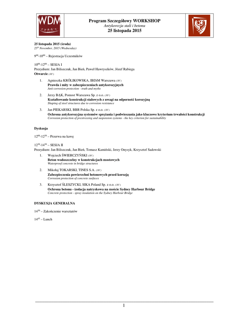 Program Szczegółowy WORKSHOP Antykorozja stali i betonu 25 listopada 2015 25 listopada 2015 (środa) 25th November, 2015 (Wednesday) 900-1000 – Rejestracja Uczestników 1000-1200 – SESJA I Prezydium: Jan Biliszczuk, Jan Bień, Paweł Hawryszków, Józef Rabiega Otwarcie (10’) 1. Agnieszka KRÓLIKOWSKA, IBDiM Warszawa (30’) Prawda i mity w zabezpieczeniach antykorozyjnych Anti-corrosion protection - truth and myths 2. Jerzy BĄK, Pomost Warszawa Sp. z o.o. (30’) Kształtowanie konstrukcji stalowych z uwagi na odporność korozyjną Shaping of steel structures due to corrosion resistance 3. Jan PIEKARSKI, BBR Polska Sp. z o.o. (30’) Ochrona antykorozyjna systemów sprężania i podwieszania jako kluczowe kryterium trwałości konstrukcji Corrosion protection of prestressing and suspension systems - the key criterion for sustainability Dyskusja 1200-1230 – Przerwa na kawę 1230-1430 – SESJA II Prezydium: Jan Biliszczuk, Jan Bień, Tomasz Kamiński, Jerzy Onysyk, Krzysztof Sadowski 1. Wojciech ŚWIERCZYŃSKI (30’) Beton wodoszczelny w konstrukcjach mostowych Waterproof concrete in bridge structures 2. Mikołaj TOKARSKI, TINES S.A. (30’) Zabezpieczenia powierzchni betonowych przed korozją Corrosion protection of concrete surfaces 3. Krzysztof ŚLESZYCKI, SIKA Poland Sp. z o.o. (30’) Ochrona betonu - izolacja natryskowa na moście Sydney Harbour Bridge Concrete protection - spray insulation on the Sydney Harbour Bridge DYSKUSJA GENERALNA 1430 – Zakończenie warsztatów 1445 – Lunch ______________________________________________________________________________ 1 Program Szczegółowy Seminarium Naukowo-Technicznego Wrocławskie Dni Mostowe Mosty łukowe – dzieła kultury. Projektowanie, budowa, utrzymanie 26 – 27 listopada 2015 25 listopada 2015 (środa) 25th November, 2015 (Wednesday) 2000-2300 – Powitanie Uczestników Seminarium Naukowo-Technicznego Wrocławskie Dni Mostowe Hotel Park Plaza, ul. Drobnera 11-13, 50-257 Wrocław, www.wroclaw.hotelepark.pl 26 listopada 2015 (czwartek) 26th November, 2015 (Thursday) 730-830 – Rejestracja Uczestników 830-930 – SESJA OTWARCIA OPENING SESSION Prezydium: Jan Biliszczuk, Jan Bień, Edmund Budka, Karol Heidrich, Jerzy Hoła, Eugeniusz Hotała, Czesław Machelski Janusz Szelka, Tadeusz Więckowski 1. Józef RABIEGA (10’) Leon Danielski (1911–1984) – nauczyciel akademicki, projektant mostów Leon Danielski (1911–1984) – lecturer, bridge designer 2. Jerzy BĄK (10’) Śp. mgr inż. Witold Witkowski (1924–2015) MSc. Civ. Eng. Witold Witkowski (1924–2015) 3. Jan BILISZCZUK (5’) Mosty łukowe. Historia, współczesność, przyszłość Arch bridges. History, present day, future 4. Czesław MACHELSKI (5’) Ruchome obciążenia obiektów mostowych Moving loads on bridges 5. Anna GOCEK, Dagmara LERCH, Marlena MACHURA, Ewelina NOGACKA (20’) Ogłoszenie wyników konkursu czasopisma „MOSTY” i wręczenie nagród im. Maksymiliana Wolfa Announcement of the results of "MOSTY" journal contest. Award of the Maximilian Wolf Prizes 930-1000 – Przerwa na kawę 1000-1200 – SESJA I. OBIEKTY HISTORYCZNE I ICH UTRZYMANIE SESSION I. HISTORICAL STRUCTURES AND THEIR MAINTENANCE Prezydium: Jerzy Bąk, Kazimierz Flaga, Marek Gotowski 1. Janusz RYMSZA (15’) Polska koncepcja rewaloryzacji Mostu Zamkowego w Kamieńcu Podolskim The Polish concept of revitalization of Kamenets Podolskiy’s Castle Bridge 2. Andrzej NIEMIERKO (*) Mosty łukowe na medalach, monetach i znaczkach pocztowych Arch bridges on medals, coins and postage stamps 3. Katarzyna JANIKOWSKA, Michał DELMACZYŃSKI (*) Zapomniane mosty łukowe Disremembered Arch Bridges 4. Józef Tomasz JUROS (15’) Żelazne mosty łukowe z Pruskiej Królewskiej huty Malapane w Ozimku Iron arch bridges from the Royal Prussian Malapane Steelworks in Ozimek 5. Arkadiusz MADAJ, Krzysztof POKORSKI, Łukasz SZUBA (15’) Zabytkowy sklepiony most łukowy w Prudniku. Studium projektu modernizacji A historic domed arch bridge in Prudnik. Modernization design study ______________________________________________________________________________ 2 Program Szczegółowy Seminarium Naukowo-Technicznego Wrocławskie Dni Mostowe Mosty łukowe – dzieła kultury. Projektowanie, budowa, utrzymanie 26 – 27 listopada 2015 6. Józef RABIEGA, Maciej KOŻUCH, Wojciech LORENC, Dariusz ŚMIERTKA, Paweł WĄTROBA, Ryszard WODYŃSKI (15’) Przebudowa łukowego Mostu Jagiellońskiego Południowego Starego przez Kanał rzeki Odry Reconstruction of Jagielloński South Old Bridge over the flood Canal of Odra River 7. Mariusz PUSTELNIK (*) Rewitalizacja Wiaduktu Żdanowskiego. Działania zmierzające do ratowania zabytkowego, trójprzęsłowego wiaduktu kolejowego o konstrukcji murowej z przeznaczeniem na cele turystyczne Revitalisation of the railway bridge in Żdanów (the owl mountains). Works aiming towards rescue of scheduled three spans brick-arch disused railway viaduct and its adaptation for tourist objectives 8. Karol RYŻ (15’) Modernizacja zabytkowego mostu łukowego z szerokim uwzględnieniem dziedzictwa konstrukcyjnoarchitektonicznego Modernization of historic arch bridge with respect to wide structural and architectural heritage 9. Adam WYSOKOWSKI, Jerzy HOWIS, Krzysztof GAŁKA (15’) Odbudowa i renowacja zabytkowego łukowego „mostu kamiennego” w Kaliszu Rebuilding and restoration of historical arch “stone bridge” in Kalisz 10. Janusz HOŁOWATY (15’) Modernizacja drogowego dwuprzęsłowego mostu łukowego Upgrading of a two-span arch bridge 1200-1230 – Przerwa na kawę 1230-1400 – SESJA II. REFERATY KLUCZOWE SESSION II. KEY NOTES Prezydium: Paweł Hawryszków, Jan Piekarski, Krzysztof Żółtowski 1. Jan BILISZCZUK, Marco TEICHGRAEBER, Volodymyr VOLOTSIUGA (*) Największe mosty łukowe świata Largest arch bridges in the wolrd 2. Krzysztof WĄCHALSKI (20’) Most przez Wisłę w Toruniu The bridge over Vistula River in Toruń 3. Rolf MEICHTRY, Rafael KÜHNE (20’