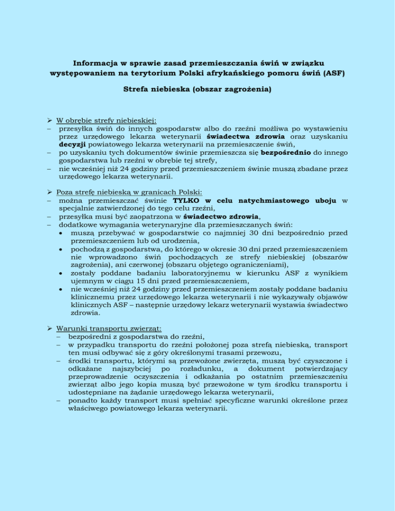 Informacja w sprawie zasad przemieszczania świń w związku występowaniem na terytorium Polski afrykańskiego pomoru świń (ASF) Strefa niebieska (obszar zagrożenia) W obrębie strefy niebieskiej: przesyłka świń do innych gospodarstw albo do rzeźni możliwa po wystawieniu przez urzędowego lekarza weterynarii świadectwa zdrowia oraz uzyskaniu decyzji powiatowego lekarza weterynarii na przemieszczenie świń, po uzyskaniu tych dokumentów świnie przemieszcza się bezpośrednio do innego gospodarstwa lub rzeźni w obrębie tej strefy, nie wcześniej niż 24 godziny przed przemieszczeniem świnie muszą zbadane przez urzędowego lekarza weterynarii. Poza strefę niebieską w granicach Polski: można przemieszczać świnie TYLKO w celu natychmiastowego uboju w specjalnie zatwierdzonej do tego celu rzeźni, przesyłka musi być zaopatrzona w świadectwo zdrowia, dodatkowe wymagania weterynaryjne dla przemieszczanych świń: muszą przebywać w gospodarstwie co najmniej 30 dni bezpośrednio przed przemieszczeniem lub od urodzenia, pochodzą z gospodarstwa, do którego w okresie 30 dni przed przemieszczeniem nie wprowadzono świń pochodzących ze strefy niebieskiej (obszarów zagrożenia), ani czerwonej (obszaru objętego ograniczeniami), zostały poddane badaniu laboratoryjnemu w kierunku ASF z wynikiem ujemnym w ciągu 15 dni przed przemieszczeniem, nie wcześniej niż 24 godziny przed przemieszczeniem zostały poddane badaniu klinicznemu przez urzędowego lekarza weterynarii i nie wykazywały objawów klinicznych ASF – następnie urzędowy lekarz weterynarii wystawia świadectwo zdrowia. Warunki transportu zwierząt: bezpośredni z gospodarstwa do rzeźni, w przypadku transportu do rzeźni położonej poza strefą niebieską, transport ten musi odbywać się z góry określonymi trasami przewozu, środki transportu, którymi są przewożone zwierzęta, muszą być czyszczone i odkażane najszybciej po rozładunku, a dokument potwierdzający przeprowadzenie oczyszczenia i odkażania po ostatnim przemieszczeniu zwierząt albo jego kopia muszą być przewożone w tym środku transportu i udostępniane na żądanie urzędowego lekarza weterynarii, ponadto każdy transport musi spełniać specyficzne warunki określone przez właściwego powiatowego lekarza weterynarii. Informacja w sprawie zasad przemieszczania świń na obszarach zapowietrzonym i zagrożonym, wyznaczonych w związku wystąpieniem ogniska afrykańskiego pomoru świń (ASF) Jeżeli gospodarstwo utrzymujące świnie położone jest w obszarze zapowietrzonym lub zagrożonym, wyznaczonym w związku z wystąpieniem ogniska ASF (obszary wymienione w rozporządzeniach powiatowego lekarza weterynarii lub Wojewody), obowiązuje bezwzględny zakaz wyprowadzania świń z tego gospodarstwa przez okres: - 40 dni – w obszarze zapowietrzonym, - 30 dni – w obszarze zagrożonym. Po odpowiednio 40 i 30 dniach należy zgłosić się do powiatowego lekarza weterynarii w celu uzyskania pozwolenia na przemieszczenie zwierząt z gospodarstwa, Szczegółowe informacje o możliwości przemieszczenia świń z gospodarstw położonych na obszarze zapowietrzonym i zagrożonym można uzyskać u powiatowego lekarza weterynarii – organ ten jest uprawniony do skrócenia powyższych okresów odpowiednio do 30 dni dla obszaru zapowietrzonego i 20 dni dla obszaru zagrożonego.