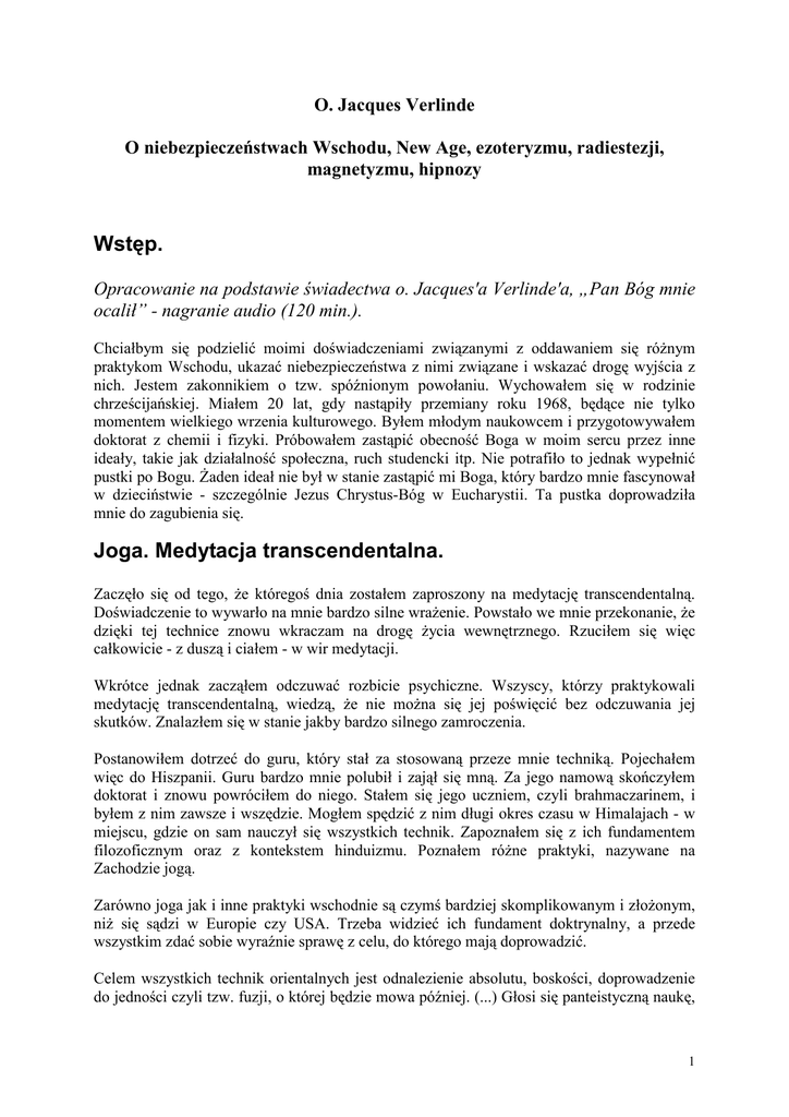 O. Jacques Verlinde O niebezpieczeństwach Wschodu, New Age, ezoteryzmu, radiestezji, magnetyzmu, hipnozy Wstęp. Opracowanie na podstawie świadectwa o. Jacques'a Verlinde'a, „Pan Bóg mnie ocalił” - nagranie audio (120 min.). Chciałbym się podzielić moimi doświadczeniami związanymi z oddawaniem się różnym praktykom Wschodu, ukazać niebezpieczeństwa z nimi związane i wskazać drogę wyjścia z nich. Jestem zakonnikiem o tzw. spóźnionym powołaniu. Wychowałem się w rodzinie chrześcijańskiej. Miałem 20 lat, gdy nastąpiły przemiany roku 1968, będące nie tylko momentem wielkiego wrzenia kulturowego. Byłem młodym naukowcem i przygotowywałem doktorat z chemii i fizyki. Próbowałem zastąpić obecność Boga w moim sercu przez inne ideały, takie jak działalność społeczna, ruch studencki itp. Nie potrafiło to jednak wypełnić pustki po Bogu. Żaden ideał nie był w stanie zastąpić mi Boga, który bardzo mnie fascynował w dzieciństwie - szczególnie Jezus Chrystus-Bóg w Eucharystii. Ta pustka doprowadziła mnie do zagubienia się. Joga. Medytacja transcendentalna. Zaczęło się od tego, że któregoś dnia zostałem zaproszony na medytację transcendentalną. Doświadczenie to wywarło na mnie bardzo silne wrażenie. Powstało we mnie przekonanie, że dzięki tej technice znowu wkraczam na drogę życia wewnętrznego. Rzuciłem się więc całkowicie - z duszą i ciałem - w wir medytacji. Wkrótce jednak zacząłem odczuwać rozbicie psychiczne. Wszyscy, którzy praktykowali medytację transcendentalną, wiedzą, że nie można się jej poświęcić bez odczuwania jej skutków. Znalazłem się w stanie jakby bardzo silnego zamroczenia. Postanowiłem dotrzeć do guru, który stał za stosowaną przeze mnie techniką. Pojechałem więc do Hiszpanii. Guru bardzo mnie polubił i zajął się mną. Za jego namową skończyłem doktorat i znowu powróciłem do niego. Stałem się jego uczniem, czyli brahmaczarinem, i byłem z nim zawsze i wszędzie. Mogłem spędzić z nim długi okres czasu w Himalajach - w miejscu, gdzie on sam nauczył się wszystkich technik. Zapoznałem się z ich fundamentem filozoficznym oraz z kontekstem hinduizmu. Poznałem różne praktyki, nazywane na Zachodzie jogą. Zarówno joga jak i inne praktyki wschodnie są czymś bardziej skomplikowanym i złożonym, niż się sądzi w Europie czy USA. Trzeba widzieć ich fundament doktrynalny, a przede wszystkim zdać sobie wyraźnie sprawę z celu, do którego mają doprowadzić. Celem wszystkich technik orientalnych jest odnalezienie absolutu, boskości, doprowadzenie do jedności czyli tzw. fuzji, o której będzie mowa później. (...) Głosi się panteistyczną naukę, 1 że wszystko jest Bogiem. Zaciera się granicę między samym Bogiem a stworzeniem. Tak więc wszystko jest przejawem Boga: roślina, krzesło. Nie można zeń wyjść, gdyż jest to sfera zamknięta. Możliwa jest natomiast swoista ewolucja wewnątrz tego jestestwa, w którym tkwimy. W człowieku sprawa wygląda następująco: również ja jestem bogiem, co mam sobie stopniowo uświadomić. Bóg - według tych poglądów - nie jest osobą, lecz zasadą, mocą, siłą kosmiczną. I ja muszę zatem przebić się przez złudzenie odrębności mojej osobowości i wtopić się w całość otaczającego mnie świata - zespolić się, zjednoczyć z nim. Tak więc ceną - jaką należy zapłacić za dotarcie do tak rozumianego boga - jest wyrzeczenie się swojej osobowości, swojego „ja” i wtopienie się w „bożą", otaczającą nas energię. Trzeba sobie dobrze uświadomić, że u podstaw praktyk orientalnych leży odrzucenie Boga osobowego. Wymieniane w hinduizmie bóstwa - np. triada: Wisznu, Brahma, Sziwa - są w gruncie rzeczy zasadami. Nie ma tu mowy o istotach-osobach. Akcentuje się jedność. Ona jest najważniejsza: stoi ponad wszelkim zróżnicowaniem. (...) Jak już zaznaczyliśmy, bazą teoretyczną praktyk wschodnich jest panteizm, czyli pogląd, że wszystko jest bezosobowym bogiem. To zaś prowadzi do wyzbycia się własnej osobowości. Jeżeli bowiem bóg ma być jedną całością, muszę się wyzbyć swego wymiaru osobowego, własnej odrębności, inności i wtopić się w energię kosmiczną, która objawia się w wielości otaczających nas bytów. Wyzbycie się własnej osobowości i wtopienie w energie kosmiczne, czyli fuzja z nimi, jest celem technik orientalnych. Są one zespołem ćwiczeń fizycznych, zmierzających do opanowania energii fizycznej i umysłowej. Techniki te doprowadzają do czegoś w rodzaju utraty świadomości, do wtopienia się w energie kosmiczne, do zespolenia się, fuzji z „całością". Jest to zatem doświadczenie o charakterze bezosobowym: wtapiam się i gubię w świecie, który nie ma nazwy. Chodzi jednak nie tylko o zjednoczenie się z otaczającym światem i jego siłami. Trzeba ponadto zespolić się ściśle ze swoim mistrzem, gdyż osobowa relacja między uczniem i nauczycielem również uważana jest za dualizm domagający się ostatecznego przezwyciężenia. Prawda ostateczna jest ponad relacją osobową. Widać zatem, że cechą charakterystyczną tego systemu jest depersonalizacja, czyli dążenie do wyzbycia się odmienności, tożsamości - własnej odrębnej osobowości. Bóg nie jest uważany za osobę, a droga do niego prowadzi przez depersonalizację. Drogi proponowanej przez techniki orientalne nie można pogodzić z drogą dochodzenia do Boga, ukazywaną przez judaizm i chrześcijaństwo. Objawienie Starego i Nowego Testamentu mówi o Bogu, który różni się od otaczającego nas świata, od natury, od kosmosu, o BoguStwórcy tego wszystkiego. Ten właśnie Bóg, różniący się od stworzeń, objawił się nam. Objawienie ukazuje wyraźną różnicę między Bogiem, a stworzeniem, które przez Niego zostało powołane do istnienia. Ten Bóg, który wybrał Abrahama, objawił, że jest BogiemStwórcą. Ukazał również, czym jest stworzenie. 