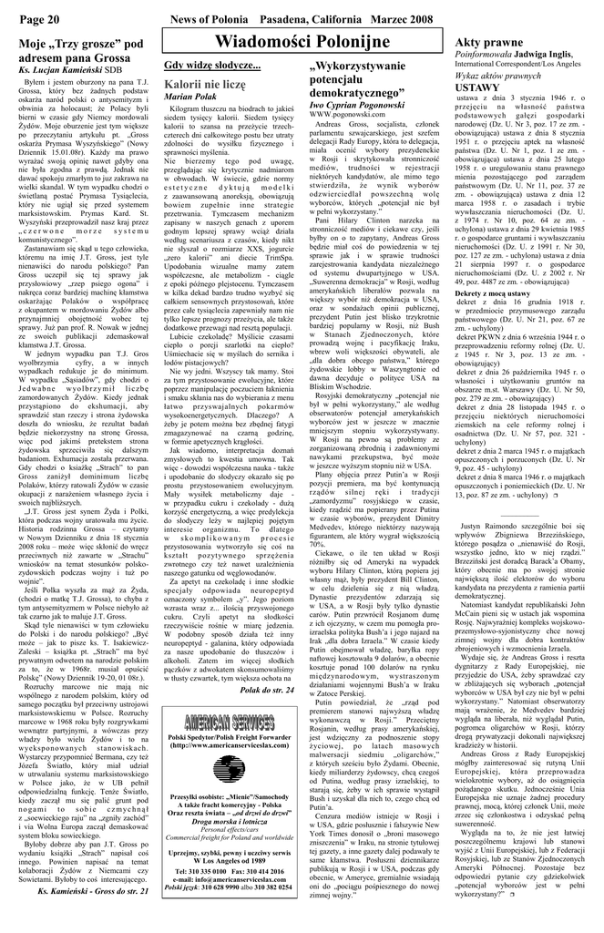 Page 20 Moje „Trzy grosze” pod adresem pana Grossa Ks. Lucjan Kamieński SDB Byłem i jestem oburzony na pana T.J. Grossa, który bez żadnych podstaw oskarża naród polski o antysemityzm i obwinia za holocaust; że Polacy byli bierni w czasie gdy Niemcy mordowali Żydów. Moje oburzenie jest tym większe po przeczytaniu artykułu pt. „Gross oskarża Prymasa Wyszyńskiego” (Nowy Dziennik 15.01.08r). Każdy ma prawo wyrażać swoją opinię nawet gdyby ona nie była zgodna z prawdą. Jednak nie dawać spokoju zmarłym to juz zakrawa na wielki skandal. W tym wypadku chodzi o świetlaną postać Prymasa Tysiąclecia, który nie ugiął się przed systemem marksistowskim. Prymas Kard. St. Wyszyński przeprowadził nasz kraj przez „czerwone morze systemu komunistycznego”. Zastanawiam się skąd u tego człowieka, któremu na imię J.T. Gross, jest tyle nienawiści do narodu polskiego? Pan Gross uczepił się tej sprawy jak przysłowiowy „rzep psiego ogona” i nakręca coraz bardziej machinę kłamstwa oskarżając Polaków o współpracę z okupantem w mordowaniu Żydów albo przynajmniej obojętność wobec tej sprawy. Już pan prof. R. Nowak w jednej ze swoich publikacji zdemaskował kłamstwa J.T. Grossa. W jednym wypadku pan T.J. Gros wyolbrzymia cyfry, a w innych wypadkach redukuje je do minimum. W wypadku „Sąsiadów”, gdy chodzi o Jedwabne wyolbrzymił liczbę zamordowanych Żydów. Kiedy jednak przystąpiono do ekshumacji, aby sprawdzić stan rzeczy i strona żydowska doszła do wniosku, że rezultat badań będzie niekorzystny na stronę Grossa, więc pod jakimś pretekstem strona żydowska sprzeciwiła się dalszym badaniom. Exhumacja została przerwana. Gdy chodzi o ksiażkę „Strach” to pan Gross zaniżył dominimum liczbę Polaków, którzy ratowali Żydów w czasie okupacji z narażeniem własnego życia i swoich najbliższych. „J.T. Gross jest synem Żyda i Polki, która podczas wojny uratowała mu życie. Historia rodzinna Grossa – czytamy w Nowym Dzienniku z dnia 18 stycznia 2008 roku – może więc skłonić do wręcz przeciwnych niż zawarte w „Strachu” wniosków na temat stosunków polskozydowskich podczas wojny i tuż po wojnie”. Jeśli Polka wyszła za mąż za Żyda, (chodzi o matkę T.J. Grossa), to chyba z tym antysemityzmem w Polsce niebyło aż tak czarno jak to maluje J.T. Gross. Skąd tyle nienawiści w tym człowieku do Polski i do narodu polskiego? „Być może – jak to pisze ks. T. IsakiewiczZaleski – książka pt. „Strach” ma być prywatnym odwetem na narodzie polskim za to, że w 1968r. musiał opuścić Polskę” (Nowy Dziennik 19-20, 01 08r.). Rozruchy marcowe nie mają nic wspólnego z narodem polskim, który od samego początku był przeciwny ustrojowi marksistowskiemu w Polsce. Rozruchy marcowe w 1968 roku były rozgrywkami wewnątrz partyjnymi, a wówczas przy władzy było wielu Żydów i to na wyeksp o no wan ych stano wiskach. Wystarczy przypomnieć Bermana, czy też Józefa Światło, który miał udział w utrwalaniu systemu marksistowskiego w Polsce jako, że w UB pełnił odpowiedzialną funkcję. Tenże Światło, kiedy zaczął mu się palić grunt pod nogami to sobie czmychnął z „soewieckiego raju” na „zgniły zachód” i via Wolna Europa zaczął demaskować system bloku sowieckiego. Byłoby dobrze aby pan J.T. Gross po wydaniu książki „Strach” napisał coś innego. Powinien napisać na temat kolaboracji Żydów z Niemcami czy Sowietami. Byłoby to coś interesującego. Ks. Kamieński - Gross do str. 21 News of Polonia Pasadena, California Marzec 2008 Wiadomości Polonijne Gdy widzę słodycze... Kalorii nie liczę Marian Polak Kilogram tłuszczu na biodrach to jakieś siedem tysięcy kalorii. Siedem tysięcy kalorii to szansa na przeżycie trzechczterech dni całkowitego postu bez utraty zdolności do wysiłku fizycznego i sprawności myślenia. Nie bierzemy tego pod uwagę, przeglądając się krytycznie nadmiarom w obwodach. W świecie, gdzie normy estetyczne dyktują modelki z zaawansowaną anoreksją, obowiązują bowiem zupełnie inne strategie przetrwania. Tymczasem mechanizm zapisany w naszych genach z uporem godnym lepszej sprawy wciąż działa według scenariusza z czasów, kiedy nikt nie słyszał o rozmiarze XXS, jogurcie „zero kalorii” ani diecie TrimSpa. Upodobania wizualne mamy zatem współczesne, ale metabolizm - ciągle z epoki późnego plejstocenu. Tymczasem w kilka dekad bardzo trudno wyzbyć się całkiem sensownych przystosowań, które przez całe tysiąclecia zapewniały nam nie tylko lepsze prognozy przeżycia, ale także dodatkowe przewagi nad resztą populacji. Lubicie czekoladę? Myślicie czasami ciepło o porcji szarlotki na ciepło? Uśmiechacie się w myślach do sernika i lodów pistacjowych? Nie wy jedni. Wszyscy tak mamy. Stoi za tym przystosowanie ewolucyjne, które poprzez manipulację poczuciem łaknienia i smaku skłania nas do wybierania z menu łatwo przyswajalnych pokarmów wysokoenergetycznych. Dlaczego? A żeby je potem można bez zbędnej fatygi zmagazynować na czarną godzinę, w formie apetycznych krągłości. Jak wiadomo, interpretacja doznań zmysłowych to kwestia umowna. Tak więc - dowodzi współczesna nauka - także i upodobanie do słodyczy okazało się po prostu przystosowaniem ewolucyjnym. Mały wysiłek metaboliczny daje w przypadku cukru i czekolady - dużą korzyść energetyczną, a więc predylekcja do słodyczy leży w najlepiej pojętym interesie organizmu. To dlatego w skomplikowanym procesie przystosowania wytworzyło się coś na kształt pozytywnego sprzężenia zwrotnego czy też nawet uzależnienia naszego gatunku od węglowodanów. Za apetyt na czekoladę i inne słodkie specjały odpowiada neuropeptyd oznaczony symbolem „y”. Jego poziom wzrasta wraz z... ilością przyswojonego cukru. Czyli apetyt na słodkości rzeczywiście rośnie w miarę jedzenia. W podobny sposób działa też inny neuropeptyd 
