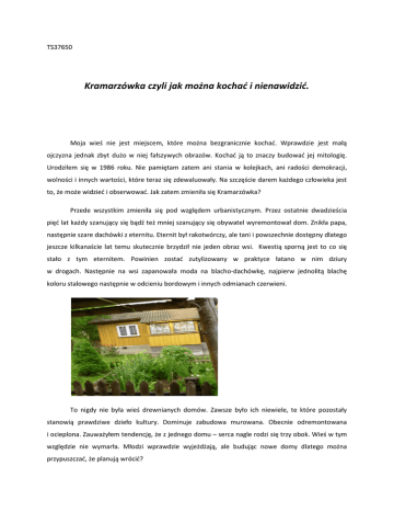 TS37650 Kramarzówka czyli jak można kochać i nienawidzić. Moja wieś nie jest miejscem, które można bezgranicznie kochać. Wprawdzie jest małą ojczyzna jednak zbyt dużo w niej fałszywych obrazów. Kochać ją to znaczy budować jej mitologię. Urodziłem się w 1986 roku. Nie pamiętam zatem ani stania w kolejkach, ani radości demokracji, wolności i innych wartości, które teraz się zdewaluowały. Na szczęście darem każdego człowieka jest to, że może widzieć i obserwować. Jak zatem zmieniła się Kramarzówka? Przede wszystkim zmieniła się pod względem urbanistycznym. Przez ostatnie dwadzieścia pięć lat każdy szanujący się bądź też mniej szanujący się obywatel wyremontował dom. Znikła papa, następnie szare dachówki z eternitu. Eternit był rakotwórczy, ale tani i powszechnie dostępny dlatego jeszcze kilkanaście lat temu skutecznie brzydził nie jeden obraz wsi. Kwestią sporną jest to co się stało z tym eternitem. Powinien zostać zutylizowany w praktyce łatano w nim dziury w drogach. Następnie na wsi zapanowała moda na blacho-dachówkę, najpierw jednolitą blachę koloru stalowego następnie w odcieniu bordowym i innych odmianach czerwieni. To nigdy nie była wieś drewnianych domów. Zawsze było ich niewiele, te które pozostały stanowią prawdziwe dzieło kultury. Dominuje zabudowa murowana. Obecnie odremontowana i ocieplona. Zauważyłem tendencję, że z jednego domu – serca nagle rodzi się trzy obok. Wieś w tym względzie nie wymarła. Młodzi wprawdzie wyjeżdżają, ale budując nowe domy dlatego można przypuszczać, że planują wrócić? Czy coś jeszcze się zmieniło w architekturze wsi oprócz nowych dachów i wymurowanych mieszkań. Zbudowano nowy kościół. Gdy go budowano byłem jeszcze dzieckiem. Teraz bardzo żałuje, że piękny drewniany kościół został zburzony, aby w jego miejscu postawić wielki, biały, niewyróżniający się niczym biały gmach. Kościół jak to bywa we wsi jest centralnym miejscem. Sercem wsi? Budowa kościoła to jeden z nielicznych aktów czynów społecznych w których uczestniczyłem. Źródło: http://kosciolydrewniane.pl/pages/drewniane/kramarz.html Za sprawą unijnych dotacji wyremontowano kawałek drogi. Lokalny samorząd nie jest chętny do korzystania z środków unijnych więc proces ten idzie bardzo opornie. W ogóle w przekonaniu większości Unia to wielkie zło, które robi tylko krzywdę i więcej zabiera niż daje. Droga cieszy, brakuje jeszcze chodników, ale trzeba się cieszyć z tego, co jest. W wieku szesnastu lat, aby dojechać do liceum w Jarosławiu musiałem nosić ze sobą, albo dwie paczki chusteczek higienicznych albo buty na zmianę, ponieważ brak lokalnej drogi sprawiał, że człowiek wyglądał jak zwierze z lasu po przegranej gonitwie z myśliwym. Skoro mowa o transporcie. To PKS przez dwadzieścia lat pozostawał taki sam, dlatego też jest na skraju bankructwa. Mentalność i obcasowe traktowanie klientów sprawia, że każdy normalny człowiek z poczuciem godności zmienił przewoźnika. Biczowanie mentalne przestało być modne. Ludzie uświadomili sobie, że pieniądze są wartością. Chociaż może nie jest tak do końca. Ale to raczej temat na osobną rozprawę. Z drugiej strony obiektem kultu stały się samochody. Auto to na podkarpackiej wsi ciągle oznaka statusu społecznego. Panuje przekonanie, że im lepszy model tym rodzina zamożniejsza. To nic, że większość ma po kilkanaście lat. Najbardziej zmieniała się mentalność. Na szczęście ona ciągle się zmienia. A może się nie zmienia tylko ja spoglądam na wszystko inaczej? Pamiętam, jako dziecko, że wraz ze zmianą Polski zmieniała się też wieś. Stawała się coraz bardziej otwarta na to, co nowe. Niekoniecznie lepsze. Początki lat dziewięćdziesiątych era plastiku. Wszystko w każdym domu stawało się plastikowe, miało być trwałe w praktyce stawało się jednorazowe. Ten plastik niestety został w świadomości. Wieś zjednoczyła się naprawdę tylko raz w czasie powodzi w 1997 roku. Wtedy wszyscy jak jeden brat wzajemnie sobie pomagali. Nie widziałem już nigdy później takiego obrazu. Kramarzówka wprawdzie bardzo nie ucierpiała, ale woda wielu mieszkańcom zalała uprawy rolne, zabrała drzewo, zniszczyła kawałek domu czy też ogrodzenia. Nawet akcje pomocowe, gdy umiera główny żywiciel rodzinny nie spotkały się z takim czynem społecznym. Z małym odzewem spotykają się natomiast akcje takie jak WOŚP. Brak struktur, które pozwoliłyby rozwijać taką działalność sprawia, że mieszkańcy słyszą o nich jedynie z telewizji. Przed przystąpieniem do Unii w całym powiecie jarosławskim przeprowadzona została akcja mająca na celu oczernienie Unii. W kościołach babcie przekazywały sobie karteczki informujące o tym jak będzie wyglądać Polska za dziesięć lat. Z tej propagandy wynikało, że lepiej będzie na Białorusi. Dzisiaj większość skrycie cieszy się z Unii, ale nie okazuje tego, bo okazywać nie wypada. Przecież Unia to zło. Moja młodość to kilka rewolucji przemysłowych w Kramarzówce. Pierwszą z nich telefony. Tak stacjonarna sieć telefoniczna. Kolejną gaz – cała wioska rozkopana. Ostatnią, którą znam jedynie z opowieści była sieć wodno-kanalizacyjna. Za to wielkie brawa. Ubolewam jedynie nad tym, że ciągle kable elektryczne wiszą i szpecą niebo. Telefon i gaz był symbolem statusu. Później pojawiły się komórki i inne możliwości opalania domów niż gaz czy prąd. Życie na wsi wymaga pomysłowości. To tacy mali innowatorzy. Zmieniają i ulepszają sami nie wiedząc nawet jak, co i kiedy. Nie nastąpiła jednak „rewolucja w zagrodzie”. Standardowe gospodarstwo jest wyposażone w jeden lub dwa samochody, prąd, telefon komórkowy jeden na zameldowanego. Dom jest ogrodzony, z kostką brukową, przyciętą trawą. Mały ogródek albo sad owocowy. Sprzęt rolniczy pamięta raczej poprzednią e
