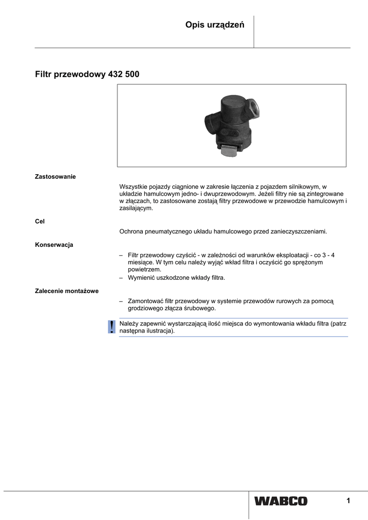 Opis urządzeń Filtr przewodowy 432 500 Zastosowanie Wszystkie pojazdy ciągnione w zakresie łączenia z pojazdem silnikowym, w układzie hamulcowym jedno- i dwuprzewodowym. Jeżeli filtry nie są zintegrowane w złączach, to zastosowane zostają filtry przewodowe w przewodzie hamulcowym i zasilającym. Cel Ochrona pneumatycznego układu hamulcowego przed zanieczyszczeniami. Konserwacja – Filtr przewodowy czyścić - w zależności od warunków eksploatacji - co 3 - 4 miesiące. W tym celu należy wyjąć wkład filtra i oczyścić go sprężonym powietrzem. – Wymienić uszkodzone wkłady filtra. Zalecenie montażowe – Zamontować filtr przewodowy w systemie przewodów rurowych za pomocą grodziowego złącza śrubowego. Należy zapewnić wystarczającą ilość miejsca do wymontowania wkładu filtra (patrz następna ilustracja). 1 Opis urządzeń Wymiary montażowe 432 500 020 0 Przyłącza Legenda 1 Dopływ energii 2 Odpływ energii *) Miejsce wymagane w celu wyjęcia wkładki filtra Dane techniczne Numer katalogowy 432 500 020 0 Maks. ciśnienie robocze Wolny przelot Przyłącze gwintowane Średnica porów filtra Dopuszczalne medium Zakres temperatur 2 432 500 021 0 20 bar Ø 12 mm = 1,13 cm2 M 22x1,5 M 16x1,5 80 do 140 μm powietrze -40 °C do +80 °C Ciężar 0,29 kg Uwaga: – Opis urządzeń Zasada działania Pozycja montażowa +/- 45° Przyłącza 1 Dopływ energii 2 Odpływ energii Sprężone powietrze doprowadzone za pośrednictwem przyłącza 1 przepływa przez wkład filtra. Umożliwia to wychwytywanie cząsteczek zanieczyszczeń, a oczyszczone powietrze przedostaje się z przyłącza 2 do kolejnych urządzeń hamujących. W przypadku niewystarczającego przepustu (zablokowania), wkład filtra jest popychany do góry w kierunku odwrotnym do działania siły sprężyny naciskowej. Następnie nieoczyszczone sprężone powietrze przepływa przez filtr przewodowy. Jeżeli przy zapchanych filtrach odpowietrzone zostaje przyłącze 1, ciśnienie w przyłączu 2 może naciskać filtr w dół w kierunku przeciwnym do siły działania sprężyny naciskowej. Gwarantuje to przepływ zwrotny z przyłącza 2 do przyłącza 1. 3