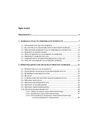 Spis treści PRZEDMOWA ................................................................................................. 5 1. KOROZJA STALI W OŚRODKACH WODNYCH ............................... 7 1.1. 1.2. 1.3. 1.4. 1.5. 1.6. 1.7. 1.8. EKONOMICZNE SKUTKI KOROZJI ............................................................ 7 KLASYFIKACJA EKONOMICZNYCH SKUTKÓW KOROZJI .................. 9 MECHANIZM KOROZJI STALI W OŚRODKACH WODNYCH ............. 10 KOROZJA W KROPLI WODY .................................................................... 11 WPŁYW RÓśNYCH CZYNNIKÓW NA KOROZJĘ .. ................................ 12 PRODUKTY KOROZJI śELAZA ................................................................. 16 UPROSZCZONY WYKRES POURBAIX DLA śELAZA ........................... 17 WPŁYW CHLORKÓW NA SZYBKOŚĆ KOROZJI ................................... 19 2. OPRZYRZĄDOWANIE DO BADAŃ PROCESU KOROZJI .............. 21 2.1. POTENCJOSTAT-GALWANOSTAT .......................................................... 21 2.2. ELEKTRODY DO BADAŃ ELEKTROCHEMICZNYCH .......................... 26 2.3. KOMÓRKI ELEKTROLITYCZNE .............................................................. 27 2.4. BŁĄD IR ........................................................................................................ 29 2.5. LABORATORYJNE METODY BADAŃ KOROZJI STALI ....................... 33 2.6. METODA WIZUALNA ................................................................................ 34 2.7. METODA GRAWIMETRYCZNA ............................................................... 35 2.8. METODY STAŁOPRĄDOWE ..................................................................... 38 2.9. METODY ZMIENNOPRĄDOWE ................................................................ 40 2.10. SZUM ELEKTROCHEMICZNY ................................................................. 44 2.10.1. Układy do badania szumu elektrochemicznego ................................ 44 2.10.2. Interpretacja szumu elektrochemicznego ......................................... 47 2.10.3. Nowa propozycja interpretacji szumu elektrochemicznego – za pomocą parametrów chropowatości .......................................... 49 3. ZAGADNIENIA KOROZJI W INTERNECIE ...................................... 50 4. OCHRONA ELEKTROCHEMICZNA KONSTRUKCJI PODZIEMNYCH ....................................................................................... 60 4.1. ZASADY OCHRONY ZBIORNIKÓW PALIWA ........................................ 60 4.2. OCHRONA KATODOWA KONSTRUKCJI STALOWYCH ...................... 61 4.3. OGÓLNE ZASADY OCHRONY PROTEKTOROWEJ ............................... 63 4.4. KINETYKA PROCESÓW KOROZYJNYCH śELAZA .............................. 64 4.5. UKŁAD GALWANICZNY ........................................................................... 66 4.6. OCHRONA ZBIORNIKÓW I OCHRONA ŚRODOWISKA ....................... 67 4.7. PRAKTYCZNE KRYTERIA OCHRONY KATODOWEJ .......................... 68 4.8. ZAWARTOŚĆ ENERGETYCZNA I WYDAJNOŚĆ ANODOWA ............. 69 4.9. NORMATYWNE ZALECENIA W OCHRONIE KATODOWEJ ................ 70 4.10. UWAGI KOŃCOWE ................................................................................... 71 5. WYBRANE TABLICE, RYSUNKI I PRZYKŁADY KOROZJI ......... 73 5.1. WYBRANE TABLICE ................................................................................. 73 5.2. WYBRANE ILUSTRACJE ........................................................................... 82 LITERATURA ............................................................................................... 97 WYKAZ SKRÓTÓW .................................................................................. 102 WYKAZ WAśNIEJSZYCH OZNACZEŃ ............................................... 103 SPIS RYSUNKÓW ...................................................................................... 104 WYKAZ TABLIC ........................................................................................ 111