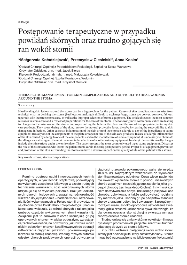 © Borgis Postępowanie terapeutyczne w przypadku powikłań skórnych oraz trudno gojących się ran wokół stomii *Małgorzata Kołodziejczak1, Przemysław Ciesielski2, Anna Kosim1 Oddział Chirurgii Ogólnej z Pododdziałem Proktologii, Szpital na Solcu, Warszawa Ordynator Oddziału: dr n. med. Jacek Bierca Kierownik Pododdziału: dr hab. n. med. Małgorzata Kołodziejczak 2 Oddział Chirurgii Ogólnej, Szpital Powiatowy, Wołomin Ordynator Oddziału: dr n. med. Krzysztof Górnicki 1 Therapeutic management for skin complications and difficult to heal wounds around the stoma Summary Hard healing skin lesions around the stoma can be a big problem for the patient. Causes of skin complications can arise from technical error in deriving the stoma (bad location making it difficult to exchange bags, stoma too convex, concave, fall out, tapered), with incorrect stoma care, as well as the improper selection of stoma equipment. The article discusses the most common mistakes in stoma care and a review of preparations for the care of the stoma. The following most common mistakes are leading to changes in the skin around the stoma: improper cutting the hole in the plate and the use of inappropriate, irritating skin care products. They cause drying of the skin, remove the natural protective layer, thereby increasing the susceptibility to skin damageand infections. Other causesof inflammation of the skin around the stoma is allergic to any of the ingredients of stoma equipment (usually one of the components of the plate or tape) or one of the skin care products. In case of allergic inflammation of the skin caused by allergy to one of the components used in the manufacture of stoma equipment, it is necessary to eliminate the allergic causative agent, the most common is the selection of another ostomy equipment. In allergic dermatitis usually changes include the skin surface under the entire plate. The paper presents the most commonly used types stomy equipment. Discusses the role of the stoma nurse, who learns the patient stoma carein the early postoperative period. Proper fit of equipment, prevention and protection of the skin surrounding the stoma can have a decisive impact on the quality of life of the patient with a stoma. Key words: stoma, stoma complications Epidemiologia Pomimo postępu nauki i nowoczesnych technik operacyjnych, w tym techniki staplerowej pozwalającej na wykonanie zespolenia jelitowego w często trudnych technicznie warunkach, ilość wykonywanych stomii utrzymuje się na wysokim poziomie. Brak jest dokładnych danych liczbowych z uwagi na różnorodność wskazań do jej wykonania – badania w celu oszacowania ilości wykonywanych w Polsce stomii prowadzone są obecnie przez Polski Klub Koloproktologii. Szacunkowe dane wskazują, że wśród chorych z rakiem jelita grubego częstość wykonywanych stomii wzrasta (1). Związane jest to zarówno z coraz liczniejszą grupą operowanych chorych w wieku podeszłym, wzrastającą zachorowalnością na nowotwory, jak również wciąż niskim odsetkiem chorych kwalifikowanych do operacji odtworzenia ciągłości przewodu pokarmowego po leczeniu ze stomią czasową. Według różnych autorów odsetek chorych poddawanych operacji odtworzenia 52 ciągłości przewodu pokarmowego waha się między 10-80% (2). Najczęstszym wskazaniem do wyłonienia stomii są nowotwory odbytnicy. Coraz więcej pacjentów ma również wyłaniane stomie z powodu nieswoistych chorób zapalnych (wrzodziejącego zapalenia jelita grubego i choroby Leśniowskiego-Crohna). Innym wskazaniem do wytworzenia odbytu brzusznego jest powikłana choroba uchyłkowa, a także polipowatość rodzinna czy martwica jelita. Osobną grupę pacjentów stanowią chorzy z urazami odbytnicy i zwieraczy. Szczególnym rodzajem urazu jest okołoporodowe uszkodzenie zwieraczy, gdzie czasami uszkodzenie bywa tak rozległe, że planowana operacja rekonstrukcyjna zwieraczy wymaga zabezpieczenia stomią czasową. Trudno gojące się zmiany skórne wokół stomii mogą być dużym problemem dla pacjenta i znacznie utrudniać adaptację do życia ze stomią jelitową. Z punktu widzenia pielęgnacji skóry wokół stomii istotny jest odcinek jelita, który został wyłoniony. Stomie mogą być wyprowadzone na jelicie grubym (kolostomie) 2/2013 Nowa Medycyna Postępowanie terapeutyczne w przypadku powikłań skórnych oraz trudno gojących się ran wokół stomii oraz na jelicie cienkim (ileostomie). Najczęściej wykonywane stomie na jelicie grubym to transwersostomia (stomia wykonana na poprzecznicy) i sigmoideostomia (stomia wykonana na esicy). Innym kryterium podziału jest podział na stomie jedno- i dwulufowe. Stomie jednolufowe mają mniejszą średnicę i są łatwiejsze do pielęgnacji, stomie dwulufowe wymagają worków stomijnych o większej średnicy. Kolejna klasyfikacja to podział stomii na czasowe i definitywne. Chirurg wyprowadzając stomię czasową, planuje w niedalekiej przyszłości operację odtworzenia ciągłości przewodu pokarmowego, w związku z tym przy wyprowadzaniu stomii czasowej jelito podszyte jest z reguły jedynie do skóry i częściej może wystąpić objaw wypadania (3). Powikłania stomii dzieli się na ogólnoustrojowe i miejscowe (4). Wśród powikłań ogólnoustrojowych do najważniejszych należą psychosocjalne, seksualne i metaboliczne, które nie są tematem niniejszej pracy. Powikłania miejscowe to najczęściej zmiany zapalne na skórze wokół odbytu brzusznego, rzadziej powikłania chirurgiczne w postaci ropni i przetok. U pacjentów z ileostomią skóra ulega częściej podrażnieniu niż u pacjentów z kolostomią. Stomie wyłonione na okrężnicy odbierają stolec zagęszczony, natomiast treść z jelita cienkiego jest rzadsza, o odczynie kwaśnym, zawiera sok trzustkowy i kwasy żółciowe i działa drażniąco na skórę. Przedłużony kontakt skóry z enzymami prowadzi do powstania nadżerek i maceracji skóry, co powoduje pieczenie