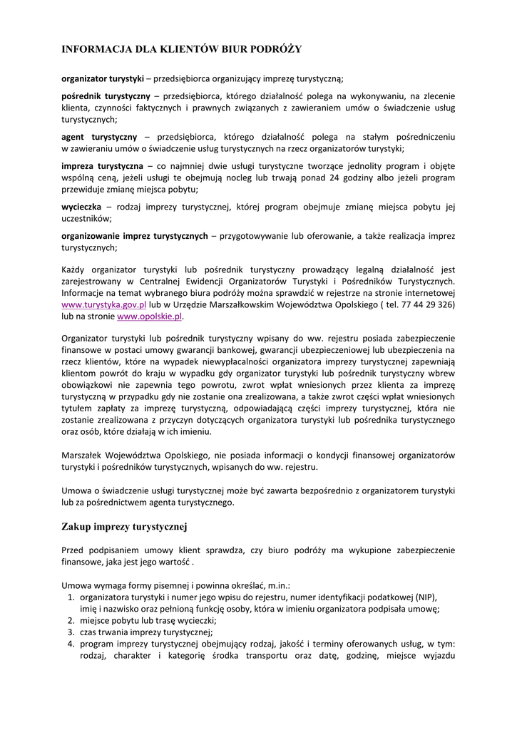 INFORMACJA DLA KLIENTÓW BIUR PODRÓŻY organizator turystyki – przedsiębiorca organizujący imprezę turystyczną; pośrednik turystyczny – przedsiębiorca, którego działalność polega na wykonywaniu, na zlecenie klienta, czynności faktycznych i prawnych związanych z zawieraniem umów o świadczenie usług turystycznych; agent turystyczny – przedsiębiorca, którego działalność polega na stałym pośredniczeniu w zawieraniu umów o świadczenie usług turystycznych na rzecz organizatorów turystyki; impreza turystyczna – co najmniej dwie usługi turystyczne tworzące jednolity program i objęte wspólną ceną, jeżeli usługi te obejmują nocleg lub trwają ponad 24 godziny albo jeżeli program przewiduje zmianę miejsca pobytu; wycieczka – rodzaj imprezy turystycznej, której program obejmuje zmianę miejsca pobytu jej uczestników; organizowanie imprez turystycznych – przygotowywanie lub oferowanie, a także realizacja imprez turystycznych; Każdy organizator turystyki lub pośrednik turystyczny prowadzący legalną działalność jest zarejestrowany w Centralnej Ewidencji Organizatorów Turystyki i Pośredników Turystycznych. Informacje na temat wybranego biura podróży można sprawdzić w rejestrze na stronie internetowej www.turystyka.gov.pl lub w Urzędzie Marszałkowskim Województwa Opolskiego ( tel. 77 44 29 326) lub na stronie www.opolskie.pl. Organizator turystyki lub pośrednik turystyczny wpisany do ww. rejestru posiada zabezpieczenie finansowe w postaci umowy gwarancji bankowej, gwarancji ubezpieczeniowej lub ubezpieczenia na rzecz klientów, które na wypadek niewypłacalności organizatora imprezy turystycznej zapewniają klientom powrót do kraju w wypadku gdy organizator turystyki lub pośrednik turystyczny wbrew obowiązkowi nie zapewnia tego powrotu, zwrot wpłat wniesionych przez klienta za imprezę turystyczną w przypadku gdy nie zostanie ona zrealizowana, a także zwrot części wpłat wniesionych tytułem zapłaty za imprezę turystyczną, odpowiadającą części imprezy turystycznej, która nie zostanie zrealizowana z przyczyn dotyczących organizatora turystyki lub pośrednika turystycznego oraz osób, które działają w ich imieniu. Marszałek Województwa Opolskiego, nie posiada informacji o kondycji finansowej organizatorów turystyki i pośredników turystycznych, wpisanych do ww. rejestru. Umowa o świadczenie usługi turystycznej może być zawarta bezpośrednio z organizatorem turystyki lub za pośrednictwem agenta turystycznego. Zakup imprezy turystycznej Przed podpisaniem umowy klient sprawdza, czy biuro podróży ma wykupione zabezpieczenie finansowe, jaka jest jego wartość . Umowa wymaga formy pisemnej i powinna określać, m.in.: 1. organizatora turystyki i numer jego wpisu do rejestru, numer identyfikacji podatkowej (NIP), imię i nazwisko oraz pełnioną funkcję osoby, która w imieniu organizatora podpisała umowę; 2. miejsce pobytu lub trasę wycieczki; 3. czas trwania imprezy turystycznej; 4. program imprezy turystycznej obejmujący rodzaj, jakość i terminy oferowanych usług, w tym: rodzaj, charakter i kategorię środka transportu oraz datę, godzinę, miejsce wyjazdu i planowanego powrotu, położenie, rodzaj i kategorię obiektu hotelarskiego zgodnie z przepisami kraju pobytu lub opis wyposażenia obiektów niezaliczanych do rodzajów i kategorii, ilość i rodzaj posiłków, program zwiedzania i inne usługi wliczone w cenę imprezy turystycznej; 5. cenę imprezy turystycznej, wraz z wyszczególnieniem wszelkich koniecznych należności, podatków i opłat, jeżeli nie są one zawarte w cenie, oraz wyraźne sformułowanie okoliczności, które mogą spowodować podwyższenie ceny; 6. sposób zapłaty; 7. rodzaj i zakres ubezpieczenia turystów oraz nazwę i adres ubezpieczyciela; 8. termin powiadomienia klienta na piśmie o ewentualnym odwołaniu imprezy turystycznej lub usługi turystycznej z powodu niewystarczającej liczby zgłoszeń, jeżeli realizacja usług jest uzależniona od liczby zgłoszeń; 9. termin zawiadomienia o przeniesieniu uprawnień na osobę i przejęciu przez tę osobę obowiązków wynikających z umowy; 10.sposób zgłaszania reklamacji związanych z wykonywaniem usług przez organizatora turystyki lub osobę z nim współpracującą wraz z podaniem terminu zgłaszania takich reklamacji; 11.wymagania specjalne, o których klient powiadomił organizatora turystyki lub pośrednika turystycznego i na które strony umowy wyraziły zgodę; 12.podstawy prawne umowy i konsekwencje prawne wynikające z umowy. Przed zawarciem umowy organizator imprezy ma obowiązek podać: 1. ogólne informacje o obowiązujących przepisach paszportowych, wizowych i sanitarnych, w szczególności o terminach oczekiwania na wydanie paszportu i wizy oraz o wymaganiach zdrowotnych dotyczących udziału w imprezie turystycznej, 2. informację o możliwości zawarcia umowy ubezpieczenia od kosztów rezygnacji z udziału w imprezie turystycznej oraz o zakresie ubezpieczenia od następstw nieszczęśliwych wypadków i kosztów leczenia (przy imprezach organizowanych zagranicą), 3. informację o szczególnych zagrożeniach życia i zdrowia na odwiedzanych obszarach oraz o możliwości ubezpieczenia z tym związanego. Dotyczy to także zagrożeń powstałych po zawarciu umowy. Ponadto przed rozpoczęciem imprezy turystycznej organizator turystyki powinien podać nazwisko lub nazwę lokalnego przedstawiciela organizatora turystyki (lub innej instytucji), do którego klient może zwracać się w razie trudności, a także jego adres i numer telefonu, Organizatorzy turystyki, organizujący imprezy turystyczne za granicą, mają obowiązek zawarcia na rzecz osób uczestniczących w tych imprezach umów ubezpieczenia od następstw nieszczęśliwych wypadków i kosztów leczenia. Organizator, który przed rozpoczęciem imprezy turystycznej jest zmuszony z przyczyn od niego niezależnych zmienić istotne warunki umowy z kli