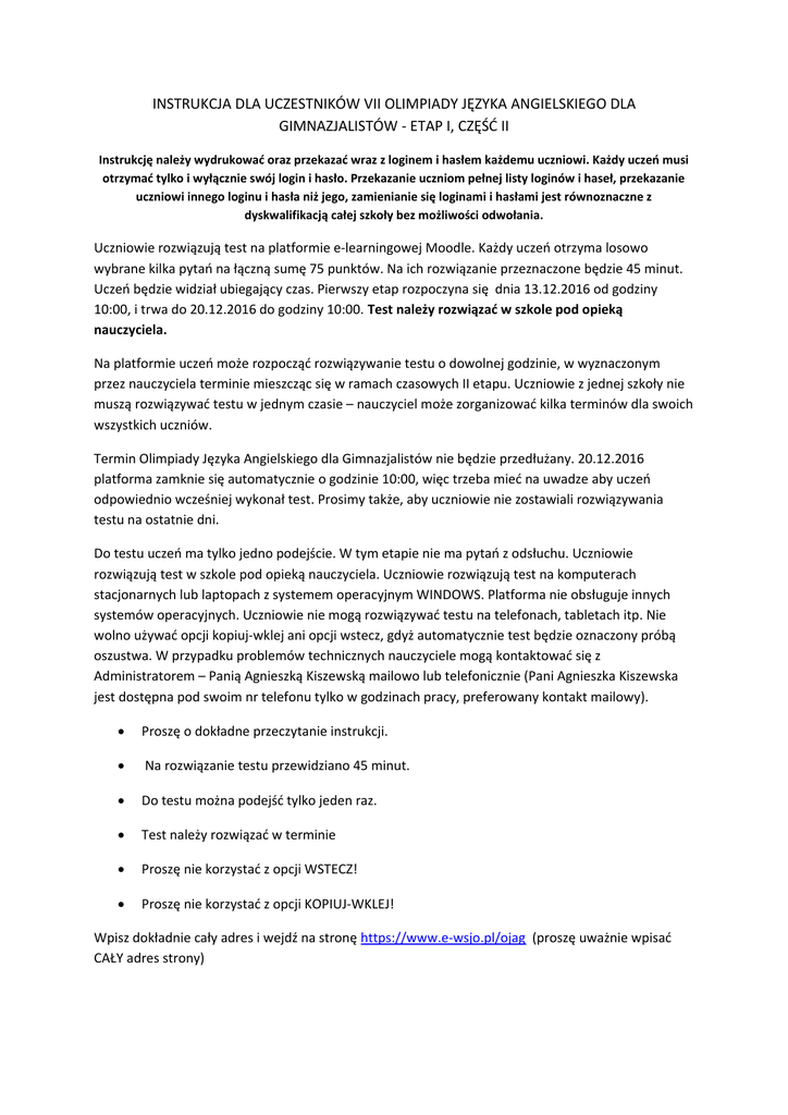 INSTRUKCJA DLA UCZESTNIKÓW VII OLIMPIADY JĘZYKA ANGIELSKIEGO DLA GIMNAZJALISTÓW - ETAP I, CZĘŚĆ II Instrukcję należy wydrukować oraz przekazać wraz z loginem i hasłem każdemu uczniowi. Każdy uczeń musi otrzymać tylko i wyłącznie swój login i hasło. Przekazanie uczniom pełnej listy loginów i haseł, przekazanie uczniowi innego loginu i hasła niż jego, zamienianie się loginami i hasłami jest równoznaczne z dyskwalifikacją całej szkoły bez możliwości odwołania. Uczniowie rozwiązują test na platformie e-learningowej Moodle. Każdy uczeń otrzyma losowo wybrane kilka pytań na łączną sumę 75 punktów. Na ich rozwiązanie przeznaczone będzie 45 minut. Uczeń będzie widział ubiegający czas. Pierwszy etap rozpoczyna się dnia 13.12.2016 od godziny 10:00, i trwa do 20.12.2016 do godziny 10:00. Test należy rozwiązać w szkole pod opieką nauczyciela. Na platformie uczeń może rozpocząć rozwiązywanie testu o dowolnej godzinie, w wyznaczonym przez nauczyciela terminie mieszcząc się w ramach czasowych II etapu. Uczniowie z jednej szkoły nie muszą rozwiązywać testu w jednym czasie – nauczyciel może zorganizować kilka terminów dla swoich wszystkich uczniów. Termin Olimpiady Języka Angielskiego dla Gimnazjalistów nie będzie przedłużany. 20.12.2016 platforma zamknie się automatycznie o godzinie 10:00, więc trzeba mieć na uwadze aby uczeń odpowiednio wcześniej wykonał test. Prosimy także, aby uczniowie nie zostawiali rozwiązywania testu na ostatnie dni. Do testu uczeń ma tylko jedno podejście. W tym etapie nie ma pytań z odsłuchu. Uczniowie rozwiązują test w szkole pod opieką nauczyciela. Uczniowie rozwiązują test na komputerach stacjonarnych lub laptopach z systemem operacyjnym WINDOWS. Platforma nie obsługuje innych systemów operacyjnych. Uczniowie nie mogą rozwiązywać testu na telefonach, tabletach itp. Nie wolno używać opcji kopiuj-wklej ani opcji wstecz, gdyż automatycznie test będzie oznaczony próbą oszustwa. W przypadku problemów technicznych nauczyciele mogą kontaktować się z Administratorem – Panią Agnieszką Kiszewską mailowo lub telefonicznie (Pani Agnieszka Kiszewska jest dostępna pod swoim nr telefonu tylko w godzinach pracy, preferowany kontakt mailowy). Proszę o dokładne przeczytanie instrukcji. Na rozwiązanie testu przewidziano 45 minut. Do testu można podejść tylko jeden raz. Test należy rozwiązać w terminie Proszę nie korzystać z opcji WSTECZ! Proszę nie korzystać z opcji KOPIUJ-WKLEJ! Wpisz dokładnie cały adres i wejdź na stronę https://www.e-wsjo.pl/ojag (proszę uważnie wpisać CAŁY adres strony) Kliknij „zaloguj się” (w prawym górnym rogu). W miejscu na nazwę użytkownika i hasło wpisz dane, które otrzymałeś od nauczyciela. Po chwili ukaże się strona z nazwą kursu – Olimpiada Języka Angielskiego dla Gimnazjalistów – CZĘŚĆ II – ETAP I Kliknij w nazwę kursu znajdująca się pod napisem „MOJE KURSY” - Olimpiada Języka Angielskiego dla Gimnazjalistów – TEST I Kolejno kliknij „Spróbuj teraz rozwiązać quiz”. System poinformuje o limicie czasowym na rozwiązanie testu (45 minut). OD TEGO MOMENTU ZACZYNA SIĘ LICZYĆ CZAS. Jeżeli uczeń nie zmieści się w czasie, test nie zostanie zapisany, a szansa na jego rozwiązanie przepadnie. System poinformuje nas: „Ten quiz ma limit czasowy i jest ograniczony do 1 podejścia. Chcesz kontynuować?” PROSZĘ KLIKNĄĆ TAK. Rozwiąż test. Aby przejść do następnego pytania kliknij „Następne”. Po lewej stronie możesz monitorować upływający czas. Po ostatnim pytaniu otrzymasz informację o zakończeniu oraz o czasie, w jakim rozwiązałeś test. Proszę koniecznie kliknąć „ZATWIERDŹ WSZYSTKIE I ZAKOŃCZ”. Wyświetli się potwierdzenie „Zakończenie podejścia. Jeżeli zakończysz to podejście, nie będziesz mógł zmienić swoich odpowiedzi.”. Po tej czynności test zostanie zapisany, a wynik pojawi się na platformie, gdzie będzie mógł go odczytać Zespół Olimpiady. PROSZĘ KLIKNĄĆ TAK. Zostaniesz poinformowany o zakończeniu testu. Proszę kliknąć WYLOGUJ (w prawym górnym rogu). Ogłoszenie kwalifikacji do etapu II nastąpi dnia 22.12.2016., najpóźniej do godziny 22:00. Wyniki będą dostępne tylko dla nauczyciela rejestrującego szkołę. Zespół OJAG nie informuje o wynikach drogą telefoniczną ani mailową. Wszelkie aktualne wiadomości oraz informacje znajdują się na stronie www.ojag.wsjo.pl Dział Informatyki. Wyższa Szkoła Języków Obcych im. S.B. Lindego Administrator Platformy E-learningowej – Agnieszka Kiszewska Tel. 061 663-62-99 E-mail: [email protected] Godziny pracy: wtorek, środa, czwartek 10.00 – 13.00, sobota, niedziela – nieczynne Biuro Komitetu Głównego. Wyższa Szkoła Języków Obcych im. S.B. Lindego E-mail: [email protected] Godziny pracy: poniedziałek, czwartek 10.00 – 13.00 sobota, niedziela – nieczynne