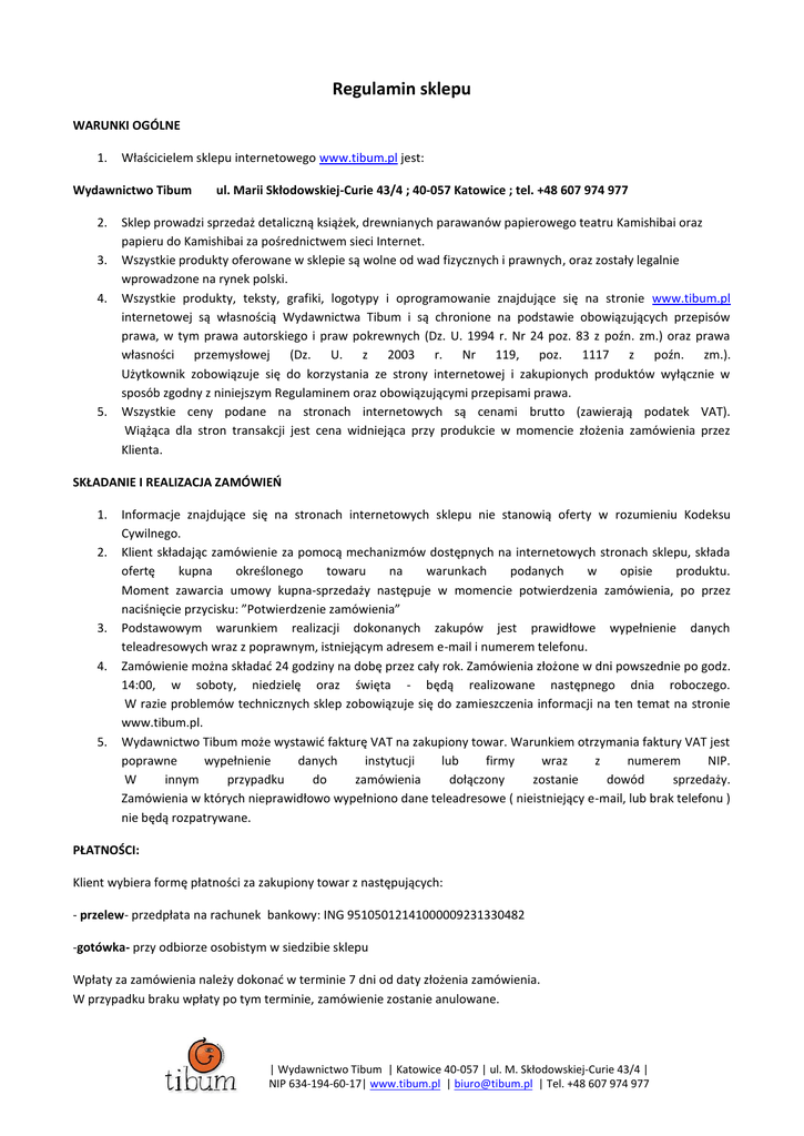Regulamin sklepu WARUNKI OGÓLNE 1. Właścicielem sklepu internetowego www.tibum.pl jest: Wydawnictwo Tibum 2. 3. 4. 5. ul. Marii Skłodowskiej-Curie 43/4 ; 40-057 Katowice ; tel. +48 607 974 977 Sklep prowadzi sprzedaż detaliczną książek, drewnianych parawanów papierowego teatru Kamishibai oraz papieru do Kamishibai za pośrednictwem sieci Internet. Wszystkie produkty oferowane w sklepie są wolne od wad fizycznych i prawnych, oraz zostały legalnie wprowadzone na rynek polski. Wszystkie produkty, teksty, grafiki, logotypy i oprogramowanie znajdujące się na stronie www.tibum.pl internetowej są własnością Wydawnictwa Tibum i są chronione na podstawie obowiązujących przepisów prawa, w tym prawa autorskiego i praw pokrewnych (Dz. U. 1994 r. Nr 24 poz. 83 z poźn. zm.) oraz prawa własności przemysłowej (Dz. U. z 2003 r. Nr 119, poz. 1117 z poźn. zm.). Użytkownik zobowiązuje się do korzystania ze strony internetowej i zakupionych produktów wyłącznie w sposób zgodny z niniejszym Regulaminem oraz obowiązującymi przepisami prawa. Wszystkie ceny podane na stronach internetowych są cenami brutto (zawierają podatek VAT). Wiążąca dla stron transakcji jest cena widniejąca przy produkcie w momencie złożenia zamówienia przez Klienta. SKŁADANIE I REALIZACJA ZAMÓWIEŃ 1. 2. 3. 4. 5. Informacje znajdujące się na stronach internetowych sklepu nie stanowią oferty w rozumieniu Kodeksu Cywilnego. Klient składając zamówienie za pomocą mechanizmów dostępnych na internetowych stronach sklepu, składa ofertę kupna określonego towaru na warunkach podanych w opisie produktu. Moment zawarcia umowy kupna-sprzedaży następuje w momencie potwierdzenia zamówienia, po przez naciśnięcie przycisku: ”Potwierdzenie zamówienia” Podstawowym warunkiem realizacji dokonanych zakupów jest prawidłowe wypełnienie danych teleadresowych wraz z poprawnym, istniejącym adresem e-mail i numerem telefonu. Zamówienie można składać 24 godziny na dobę przez cały rok. Zamówienia złożone w dni powszednie po godz. 14:00, w soboty, niedzielę oraz święta - będą realizowane następnego dnia roboczego. W razie problemów technicznych sklep zobowiązuje się do zamieszczenia informacji na ten temat na stronie www.tibum.pl. Wydawnictwo Tibum może wystawić fakturę VAT na zakupiony towar. Warunkiem otrzymania faktury VAT jest poprawne wypełnienie danych instytucji lub firmy wraz z numerem NIP. W innym przypadku do zamówienia dołączony zostanie dowód sprzedaży. Zamówienia w których nieprawidłowo wypełniono dane teleadresowe ( nieistniejący e-mail, lub brak telefonu ) nie będą rozpatrywane. PŁATNOŚCI: Klient wybiera formę płatności za zakupiony towar z następujących: - przelew- przedpłata na rachunek bankowy: ING 95105012141000009231330482 -gotówka- przy odbiorze osobistym w siedzibie sklepu Wpłaty za zamówienia należy dokonać w terminie 7 dni od daty złożenia zamówienia. W przypadku braku wpłaty po tym terminie, zamówienie zostanie anulowane. | Wydawnictwo Tibum | Katowice 40-057 | ul. M. Skłodowskiej-Curie 43/4 | NIP 634-194-60-17| www.tibum.pl | [email protected] | Tel. +48 607 974 977 DOSTAWA 1. Zamówiony towar dostarczamy za pomocą firm kurierskich lub za pośrednictwem Poczty Polskiej. Kupujący jest obciążany kosztami dostawy określonymi w cenniku transportu: Poczta Polska - przelew - 12,00 zł w przypadku zamawiania książek. Kurier – przelew: 19,00 zł w przypadku zamawiania teatrzyku drewnianego Kamishibai. 19,00 zł w przypadku zamówienia teatrzyku drewnianego i książek. 19,00 zł. w przypadku zamówienia teatrzyku drewnianego, książek i papieru. 19,00 zł. w przypadku zamówienia papieru. 2. Przesyłki są dostarczane Pocztą Polską w ciągu 2–7 dni roboczych. Firma kurierska dostarcza przesyłki w ciągu 1–3 dni roboczych po wysyłce z naszego magazynu. Nie odpowiadamy za opóźnienia w dostawie przesyłek przez Pocztę Polską i firmy kurierskie. ZWROT I REKLAMACJA 1. Prawo odstąpienia od umowy: a. Klient ma prawo odstąpić od niniejszej umowy w terminie 14 dni bez podania jakiejkolwiek przyczyny. Termin do odstąpienia od umowy wygasa po upływie 14 dni od dnia, w którym wszedł on w posiadanie pierwszej z rzeczy lub w którym osoba trzecia inna niż przewoźnik i wskazana przez klienta weszła w posiadanie pierwszej z rzeczy. Aby skorzystać z prawa odstąpienia od umowy, klient musi poinformować nas (Wydawnictwo Tibum, ul. M. Skłodowskiej-Curie 43/4; 40-057 Katowice, [email protected] ) o swojej decyzji o odstąpieniu od niniejszej umowy w drodze jednoznacznego oświadczenia (na przykład pismo wysłane pocztą, faksem lub pocztą elektroniczną). b. Klient może skorzystać ze wzoru formularza odstąpienia od umowy, jednak nie jest to obowiązkowe. Klient może również wypełnić i przesłać formularz odstąpienia od umowy lub jakiekolwiek inne jednoznaczne oświadczenie drogą elektroniczną na adres [email protected]. Jeżeli klient skorzysta z tej możliwości, zostanie muniezwłocznie wysłane potwierdzenie otrzymania informacji o odstąpieniu od umowy na trwałym nośniku (na przykład pocztą elektroniczną. c. Aby zachować termin do odstąpienia od umowy klient dostarcza informację dotyczącą wykonania przysługującego mu prawa odstąpienia od umowy przed upływem terminu do odstąpienia od umowy. d. W przypadku odstąpienia od niniejszej umowy klientowi zwracane są wszystkie otrzymane od niego płatności, w tym koszty dostarczenia rzeczy (z wyjątkiem dodatkowych kosztów wynikających z wybranego przez niego sposobu dostarczenia innego niż najtańszy zwykły sposób dostarczenia oferowany przez nas), niezwłocznie, a w każdym przypadku nie później niż 14 dni od dnia, w którym zostaliśmy poinformowani o decyzji klienta o wykonaniu prawa odstąpienia od niniejszej umowy. Zwrotu płatności dokonamy przy użyciu takich samych sposobów płatności, jakie zostały przez klienta uży
