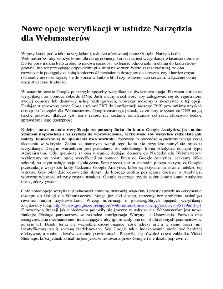 Nowe opcje weryfikacji w usłudze Narzędzia dla Webmasterów W przydatnej pod wieloma względami, usłudze oferowanej przez Google: Narzędzia dla Webmasterów, aby założyć konto dla danej domeny, konieczna jest weryfikacja własności domeny. Do tej pory można było zrobić to na dwa sposoby: wklejając odpowiedni metatag do kodu strony głównej lub tez przesyłając odpowiedni plik html na serwer. Warto zaznaczyć tutaj, że oba rozwiązania pociągały za sobą konieczność posiadania dostępów do serwera, czyli bardzo często dla osoby nie orientującej się do końca w kodzie html czy ustawieniach serwera, włączenie takiej opcji stwarzało trudności. W ostatnim czasie Google poszerzyło sposoby weryfikacji o dwie nowe opcje. Pierwsza z nich to weryfikacja za pomocą rekordu DNS. Jeśli mamy możliwość aby zalogować się do rejestratora swojej domeny lub dostawcy usług hostingowych, wówczas możemy z skorzystać z tej opcji. Dodając sugerowany przez Google rekord TXT do konfiguracji naszego DNS powinniśmy uzyskać dostęp do Narzędzi dla Webmasterów. Google zastrzega jednak, że zmiany w systemie DNS mogą trochę potrwać, dlatego jeśli dany rekord nie zostanie odnaleziony od razu, okresowo będzie sprawdzana jego dostępność. Kolejna, nowa metoda weryfikacja za pomocą linku do konta Google Analytics, jest moim zdaniem najprostsza i najszybsza do wprowadzenia, aczkolwiek aby wszystko zadziałało jak należy, konieczne są do spełnienia dwa warunki. Pierwszy to obecność asynchronicznego kodu śledzenia w witrynie. Żadna ze starszych wersji tego kodu nie przejdzie pomyślnie procesu weryfikacji. Drugim warunkiem jest posiadanie do założonego konta Analytics dostępu typu Administrator. Gdy spełnione są oba warunki, dodając domenę do Narzędzi dla Webmasterów wybieramy po prostu opcję weryfikacji za pomocą linku do Google Analytics, czekamy kilka sekund, po czym usługa staje się aktywna. Sam proces jaki tu zachodzi polega na tym, że Google przeszukuje wszystkie kody śledzenia Google Analytics, które są aktywne na stronie indeksu tej witryny. Gdy odnajdzie odpowiedni skrypt, do którego profilu posiadamy dostępy w Analytics, wówczas własność witryny zostaje ustalona. Google zastrzega też, że żadne dane z konta Analytics nie są odczytywane. Obie nowe opcje weryfikacji własności domeny, stanowią wygodny i prosty sposób na otrzymanie dostępu do Usługi dla Webmasterów. Mając już taki dostęp, możemy bez problemu nadać go również innym użytkownikom. Więcej informacji o poszczególnych opcjach weryfikacji znajdziemy tutaj: http://www.google.com/support/webmasters/bin/answer.py?answer=35179&hl=pl Z nowszych funkcji jakie niedawno pojawiły się jeszcze w usłudze dla Webmasterów jest nowa funkcja: Obsługa parametrów, w zakładce konfiguracja Witryny → Ustawienia. Pozwala ona zasugerowanie mechanizmom indeksującym, aby ignorowały one do 15 określonych parametrów w adresie url. Dzięki temu nie wszystkie strony mające różne adresy url, a te same treści (np. identyfikatory sesji) zostaną zindeksowane. Wg Google takie indeksowanie może być bardziej efektywne, a mniej adresów zostanie powielonych. Pojawiła się również nowa zakładka Video Sitemaps, która jednak aktualnie jest jeszcze testowana przez Google i nie działa poprawnie.