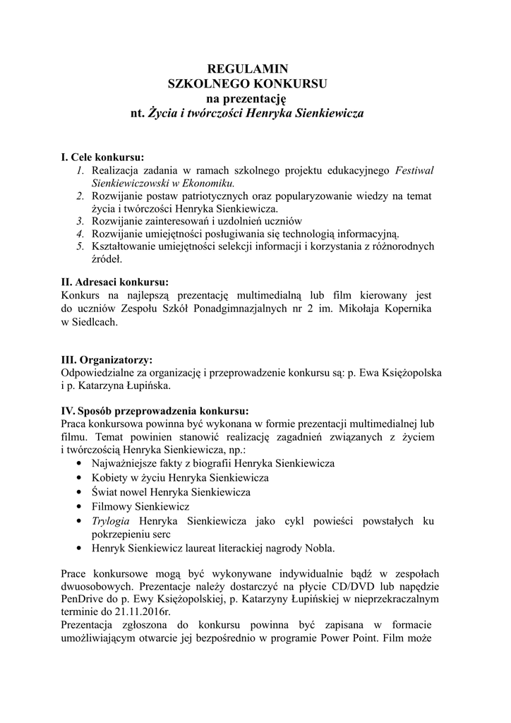 REGULAMIN SZKOLNEGO KONKURSU na prezentację nt. Życia i twórczości Henryka Sienkiewicza I. Cele konkursu: 1. Realizacja zadania w ramach szkolnego projektu edukacyjnego Festiwal Sienkiewiczowski w Ekonomiku. 2. Rozwijanie postaw patriotycznych oraz popularyzowanie wiedzy na temat życia i twórczości Henryka Sienkiewicza. 3. Rozwijanie zainteresowań i uzdolnień uczniów 4. Rozwijanie umiejętności posługiwania się technologią informacyjną. 5. Kształtowanie umiejętności selekcji informacji i korzystania z różnorodnych źródeł. II. Adresaci konkursu: Konkurs na najlepszą prezentację multimedialną lub film kierowany jest do uczniów Zespołu Szkół Ponadgimnazjalnych nr 2 im. Mikołaja Kopernika w Siedlcach. III. Organizatorzy: Odpowiedzialne za organizację i przeprowadzenie konkursu są: p. Ewa Księżopolska i p. Katarzyna Łupińska. IV. Sposób przeprowadzenia konkursu: Praca konkursowa powinna być wykonana w formie prezentacji multimedialnej lub filmu. Temat powinien stanowić realizację zagadnień związanych z życiem i twórczością Henryka Sienkiewicza, np.:  Najważniejsze fakty z biografii Henryka Sienkiewicza  Kobiety w życiu Henryka Sienkiewicza  Świat nowel Henryka Sienkiewicza  Filmowy Sienkiewicz  Trylogia Henryka Sienkiewicza jako cykl powieści powstałych ku pokrzepieniu serc  Henryk Sienkiewicz laureat literackiej nagrody Nobla. Prace konkursowe mogą być wykonywane indywidualnie bądź w zespołach dwuosobowych. Prezentacje należy dostarczyć na płycie CD/DVD lub napędzie PenDrive do p. Ewy Księżopolskiej, p. Katarzyny Łupińskiej w nieprzekraczalnym terminie do 21.11.2016r. Prezentacja zgłoszona do konkursu powinna być zapisana w formacie umożliwiającym otwarcie jej bezpośrednio w programie Power Point. Film może być wykonany np. w programie Windows Movie Maker lub innym i zapisany w formacie .wmv lub .mp4 Jako nazwę pliku należy wpisać imię i nazwisko (imiona i nazwiska) uczestnika (uczestników). Slajd tytułowy powinien zawierać tytuł prezentacji/filmu oraz dane autora (imię i nazwisko) i szkoły. Prezentacja/film winna zawierać co najmniej 20 slajdów. Treść powinna być zilustrowana odpowiednimi zdjęciami, rysunkami, rycinami, a także fragmentami dzieł filmowych i/lub muzycznych. Ostatni slajd powinien zawierać bibliografię (spis materiałów wykorzystanych przy tworzeniu prezentacji, łącznie ze stronami www). Kryteria oceniania prac wykonanych indywidualnie i zespołowo są takie same. Prace zgłoszone na konkurs pozostają do dyspozycji organizatora. Wyniki konkursu zostaną ogłoszone do dnia 1.12.2016 r. V. Kryteria oceniania: Zgodność treści prezentacji z hasłem przewodnim konkursu. Poprawność merytoryczna zamieszczonych w prezentacji informacji. Poprawność ortograficzna, stylistyczna, językowa i edycyjna. Innowacyjność i kreatywność w podejściu do tematu. Adekwatność zastosowanych narzędzi i efektów do przedstawianych treści. Przejrzysty i uporządkowany układ prezentacji. Walory edukacyjne i popularyzatorskie. Ogólne wrażenie estetyczne. VI. Nagrody: Laureaci I–III miejsca otrzymują nagrody. Przewidziane są również wyróżnienia. Prace nagrodzone będą prezentowane podczas konferencji podsumowującej Festiwal Sienkiewiczowski w Ekonomiku, a ich autorzy otrzymają między innymi oceny celujące z informatyki.