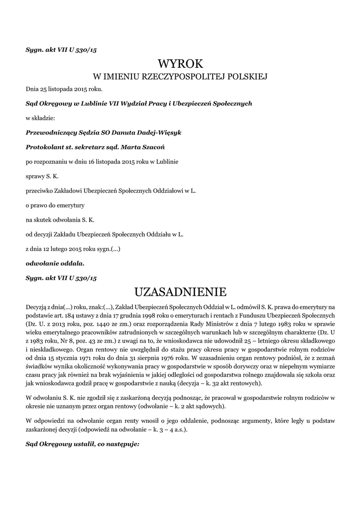 Sygn. akt VII U 530/15 WYROK W IMIENIU RZECZYPOSPOLITEJ POLSKIEJ Dnia 25 listopada 2015 roku. Sąd Okręgowy w Lublinie VII Wydział Pracy i Ubezpieczeń Społecznych w składzie: Przewodniczący Sędzia SO Danuta Dadej-Więsyk Protokolant st. sekretarz sąd. Marta Szacoń po rozpoznaniu w dniu 16 listopada 2015 roku w Lublinie sprawy S. K. przeciwko Zakładowi Ubezpieczeń Społecznych Oddziałowi w L. o prawo do emerytury na skutek odwołania S. K. od decyzji Zakładu Ubezpieczeń Społecznych Oddziału w L. z dnia 12 lutego 2015 roku sygn.(...) odwołanie oddala. Sygn. akt VII U 530/15 UZASADNIENIE Decyzją z dnia(...) roku, znak:(...), Zakład Ubezpieczeń Społecznych Oddział w L. odmówił S. K. prawa do emerytury na podstawie art. 184 ustawy z dnia 17 grudnia 1998 roku o emeryturach i rentach z Funduszu Ubezpieczeń Społecznych (Dz. U. z 2013 roku, poz. 1440 ze zm.) oraz rozporządzenia Rady Ministrów z dnia 7 lutego 1983 roku w sprawie wieku emerytalnego pracowników zatrudnionych w szczególnych warunkach lub w szczególnym charakterze (Dz. U z 1983 roku, Nr 8, poz. 43 ze zm.) z uwagi na to, że wnioskodawca nie udowodnił 25 – letniego okresu składkowego i nieskładkowego. Organ rentowy nie uwzględnił do stażu pracy okresu pracy w gospodarstwie rolnym rodziców od dnia 15 stycznia 1971 roku do dnia 31 sierpnia 1976 roku. W uzasadnieniu organ rentowy podniósł, że z zeznań świadków wynika okoliczność wykonywania pracy w gospodarstwie w sposób dorywczy oraz w niepełnym wymiarze czasu pracy jak również na brak wyjaśnienia w jakiej odległości od gospodarstwa rolnego znajdowała się szkoła oraz jak wnioskodawca godził pracę w gospodarstwie z nauką (decyzja – k. 32 akt rentowych). W odwołaniu S. K. nie zgodził się z zaskarżoną decyzją podnosząc, że pracował w gospodarstwie rolnym rodziców w okresie nie uznanym przez organ rentowy (odwołanie – k. 2 akt sądowych). W odpowiedzi na odwołanie organ renty wnosił o jego oddalenie, podnosząc argumenty, które legły u podstaw zaskarżonej decyzji (odpowiedź na odwołanie – k. 3 – 4 a.s.). Sąd Okręgowy ustalił, co następuje: S. K., urodzony (...), w dniu 19 stycznia 2015 roku złożył wniosek o emeryturę. W jego treści zawarł oświadczenie o tym, że jest członkiem otwartego funduszu emerytalnego, jednocześnie wnosząc o przekazanie środków zgromadzonych na rachunku w otwartym funduszu emerytalnym, za pośrednictwem Zakładu, na dochody budżetu państwa. Na podstawie dokumentów dołączonych do wniosku oraz znajdujących się w aktach Zakładu, organ rentowy ustalił na dzień 1 stycznia 1999 roku łączny okres podlegania ubezpieczeniom w wymiarze 21 lat i 2 dni, w tym 20 lat, 9 miesięcy i 26 dni okresów składkowych oraz 2 miesięcy i 6 dni okresów nieskładkowych. Organ rentowy uwzględnił do stażu pracy w warunkach szczególnych okresy zatrudnienia w wymiarze 19 lat, 2 miesięcy i 10 dni (okoliczności bezsporne). Rodzice S. K., M. i S. małżeństwo K. w okresie od dnia 15 stycznia 1971 roku do dnia 31 sierpnia 1976 roku prowadzili stanowiące ich własność gospodarstwo rolne o powierzchni 6 ha położone w miejscowości M. S. w gminie B. oraz w miejscowości Z. w gminie C.. W okresie objętym sporem ubezpieczony zamieszkiwał razem z rodzicami oraz dwoma braćmi, niepełnosprawnym urodzonym w (...) roku oraz urodzonym w (...) roku. Ojciec skarżącego urodzony w (...) roku chorował na rozedmę płuc, niepełnosprawny brat nie był w stanie pracować w gospodarstwie rolnym ze względu na stan zdrowia a najmłodszy z braci ze względu na wiek, wobec czego większość prac w gospodarstwie wykonywała matka, której ubezpieczony pomagał po powrocie ze szkoły. W ramach prowadzonego gospodarstwa rolnego były uprawiane buraki na powierzchni 0,5 hektara, ziemniaki na powierzchni około 1,5 hektara, pszenica jara i ozima na powierzchni 1,7 hektara, żyto na powierzchni około 1 hektara, owies na powierzchni około 1 hektara, jęczmień, tytoń na powierzchni od 30 do 40 arów, mieszankę zbożową na powierzchni około 1,5 hektara oraz koniczyna lub seradela. Wszystkie wskazane uprawy w ramach prac polowych ubezpieczony obrabiał się koniem. W gospodarstwie hodowano również od 10 do 15 świń, 2 krowy oraz konia. W okresie od dnia 1 września 1970 roku do dnia 20 czerwca 1973 roku ubezpieczony uczył się w (...) Szkole Budowlanej nr (...) w L., której siedziba mieściła się przy ówczesnej ul. (...) (obecnie al. (...)) w zawodzie mechanika. Nauka we wskazanym okresie odbywała się przez 6 dni w tygodniu od poniedziałku do soboty z podziałem na 3 dni zajęć teoretycznych i 3 dni zajęć praktycznych. Liczba godzin dydaktycznych w tygodniu obowiązująca ubezpieczonego w pierwszej klasie, tj. w okresie od dnia 1 września 1970 roku do dnia 26 czerwca 1971 roku wynosiła 36, w tym 3 dni zajęć praktycznych po 4 godziny dziennie. W drugiej klasie, tj. w okresie od dnia 1 września 1971 roku do dnia 24 czerwca 1972 roku liczba takich godzin wynosiła również 36, w tym 3 dni zajęć praktycznych po 6 godziny dziennie. Natomiast w trzeciej klasie, tj. w okresie od dnia 1 września 1972 roku do dnia 20 czerwca 1973 roku, liczba wskazanych godzin wynosiła 42, w tym 3 dni zajęć praktycznych po 8 godziny dziennie. Liczba dopuszczalnych programem nauczania godzin nieobecności w zajęciach szkolnych wynosiła w roku szkolnym 1970/1971 25 w tym 19 nieusprawiedliwionych, w roku szkolnym 1971/1972 103 w tym 7 nieusprawiedliwionych a w roku szkolnym 1972/1973 84 w tym 15 nieusprawiedliwionych. Następnie w okresie od dnia 1 września 1973 roku do dnia 9 czerwca 1976 roku ubezpieczony uczył się w Pedagogicznym Studium (...) im. Komisji Edukacji Narodowej w L.. W roku szkolnym 1973/1974 opuścił 66 godzin lekcyjnych, w roku szkolnym 1974/1975 26 godzin, w roku szkolnym 1975/1976 29 godzin a w roku szkolnym 1976/1977 12 godzin. Zarówno do (...) Szkoły Budowlanej nr 