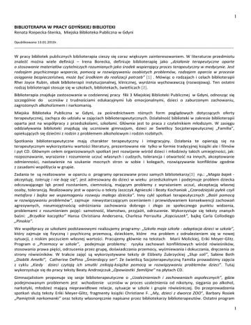 1 BIBLIOTERAPIA W PRACY GDYŃSKIEJ BIBLIOTEKI Renata Rzepecka-Stenka, Miejska Biblioteka Publiczna w Gdyni Opublikowano 13.01.2010r. ____________________________________________________________________________________________________________________ W pracy bibliotek publicznych biblioterapia cieszy się coraz większym zainteresowaniem. W literaturze przedmiotu znaleźć można wiele definicji – Irena Borecka, definiuje biblioterapię jako „działanie terapeutyczne oparte o stosowanie materiałów czytelniczych rozumianych jako środek wspierający proces terapeutyczny w medycynie. Jest rodzajem psychicznego wsparcia, pomocą w rozwiązywaniu osobistych problemów, rodzajem oparcia w procesie osiągania bezpieczeństwa, może być środkiem do realizacji potrzeb” [1] . Mówiąc o rodzajach i celach biblioterapii Rhei Joyce Rubin, obok biblioterapii instytucjonalnej, klinicznej, wyróżnia wychowawczą (rozwojową). Ten ostatni rodzaj biblioterapii stosuje się w szkołach, bibliotekach, świetlicach [2]. Biblioterapia znajduje zastosowanie w codziennej pracy filii 3 Miejskiej Biblioteki Publicznej w Gdyni, odnosząc się szczególnie do uczniów z trudnościami edukacyjnymi lub emocjonalnymi, dzieci o zaburzonym zachowaniu, zagrożonych alkoholizmem i narkomanią. Miejska Biblioteka Publiczna w Gdyni, za pośrednictwem różnych form poglądowych dotyczących oferty terapeutycznej, zachęca do udziału w zajęciach biblioterapeutycznych. Działalność biblioteki w zakresie biblioterapii oparta jest na współpracy z przedszkolami, szkołami. Głównie jest to praca z czytelnikiem młodszym. W zasięgu oddziaływania biblioteki znajdują się uczniowie gimnazjum, dzieci ze Świetlicy Socjoterapeutycznej „Familia”, opiekujących się dziećmi z rodzin z problemem alkoholowym i rodzin rozbitych. Spotkania biblioterapeutyczne mają charakter terapeutyczny i integracyjny. Działania te opierają się na terapeutycznym wykorzystaniu wartości literatury, prezentowane nie tylko w formie tradycyjnej książki ale i filmów i pyt CD. Głównym celem organizowanych spotkań jest rozwijanie wśród dzieci i młodzieży takich umiejętności, jak: rozpoznawanie, wyrażanie i rozumienie uczuć własnych i cudzych, tolerancja i otwartość na innych, akceptowanie odmienności, nastawienie na szukanie mocnych stron w sobie i kolegach, rozwiązywanie konfliktów zgodnie z zasadami współżycia w grupie. Zadania te są realizowane w oparciu o programy opracowane przez samych bibliotekarzy[3] np.: „Magia bajek akceptuję, toleruję i nie boję się”, jest adresowany do dzieci w wieku przedszkolnym i podejmuje problem dziecka odczuwającego lęk przed rozstaniem, ciemnością, mającym problemy z wyrażaniem uczuć, akceptacją własnej osoby, tolerancją. Realizowany jest w oparciu o teksty Jaszczyk Agnieszki i Beaty Kochaniak „Czarodziejski pyłek czyli metafora i bajka we wspomaganiu rozwoju małego dziecka”. Inny cykl spotkań terapeutycznych „Baśń pomocą w rozwiązywaniu problemów”, zajmuje niewystarczającym ocenianiem i przewidywaniem konsekwencji zachowań agresywnych, nieumiejętnością odróżniania zachowania dobrego i złego ze społecznego punktu widzenia, problemami z rozumieniem pojęć: samotność, kłamstwo, przyjaźń, odrzucenie. Wykorzystuje się teksty znanych baśni: „Brzydkie kaczątko” Hansa Christiana Andersena, Charlesa Perraulta „Kopciuszek”, bajkę Carla Collodiego „Pinokio”. We współpracy ze szkołami podstawowymi realizujemy programy: „Szkoła moja szkoła - adaptacja dzieci w szkole”, który zajmuje się fizyczną i psychiczną przemocą, dzieckiem, które ma problem z odnalezieniem się w nowej sytuacji, z niskim poczuciem własnej wartości. Pracujemy głównie na tekstach Marii Molickiej, Eriki Meyer-Glitz. Program o „Przemocy w szkole”, podejmuje problemy: ryzyka zachowań konfliktowych wśród rówieśników, stosowania prawa pięści, odrzucenia przez grupę, doświadczania przemocy, wyśmiewania i dokuczania, dręczenia ze strony rówieśników. W trakcie zajęć są wykorzystywane teksty dr Elżbiety Zubrzyckiej „Słup soli”, Sabine Both „Diablik Amelki”, Catherine DePino „Śmierdzący ser”. Ze świetlicą Socjoterapeutyczną Familia prowadzimy zajęcia z cyklu „Kiedy dzieci czytają ich smutki znikają-książka pomocą w rozwiązywaniu problemów dzieci”. Tutaj wykorzystuje się do pracy teksty Beaty Andrzejczuk „Opowiastki familijne” na płytach CD. Gimnazjalistom proponuje się sesje biblioterapeutyczne o „Uzależnieniach i zachowaniach aspołecznych”, gdzie podejmowanym problemem jest wchodzenie uczniów w proces uzależnienia od nikotyny, sięgania po alkohol, narkotyki, młodzież mającą nieprawidłowe relacje, sytuacje w szkole i grupie rówieśniczej. Do przeprowadzenia spotkań służą teksty Eriki Meyer-Glitz, fragmenty książki Christiane F. „My, dzieci z dworca ZOO”, Barbary Rosiek „Pamiętnik narkomanki” oraz teksty własnoręcznie napisane przez bibliotekarzy biblioterapeutów. Ostatni program 1 2 „Lekcje przestrogi” mówi o współczesnych zagrożeniach młodzieży i oparty jest o filmy edukacyjne Roberta Tuleja. W filmach prezentowani są uczniowie, którzy są lub wchodzą w proces uzależnienia od komputera, Internetu, telewizji. W spotkaniach udział biorą zaproszeni goście, specjaliści: terapeuci, psycholodzy z Poradni Psychologiczno Pedagogicznej. Rozmowa ze specjalistą pomaga spojrzeć na sytuację z innej perspektywy, dojrzeć pozytywne aspekty danej sytuacji oraz ułatwia rozwiązanie problemu. Podczas zajęć biblioterapeutycznych stosuje się różnorodne formy i techniki. Za punkt wyjścia działań terapeutycznych przyjmuje się czytanie, słuchanie tekstów z płyt CD, odwoływanie się do materiałów alternatywnych: filmów. Posługujemy się metodami aktywizującymi, wpływającymi na rozwój samodzielnego myślenia i kształtowania postawy