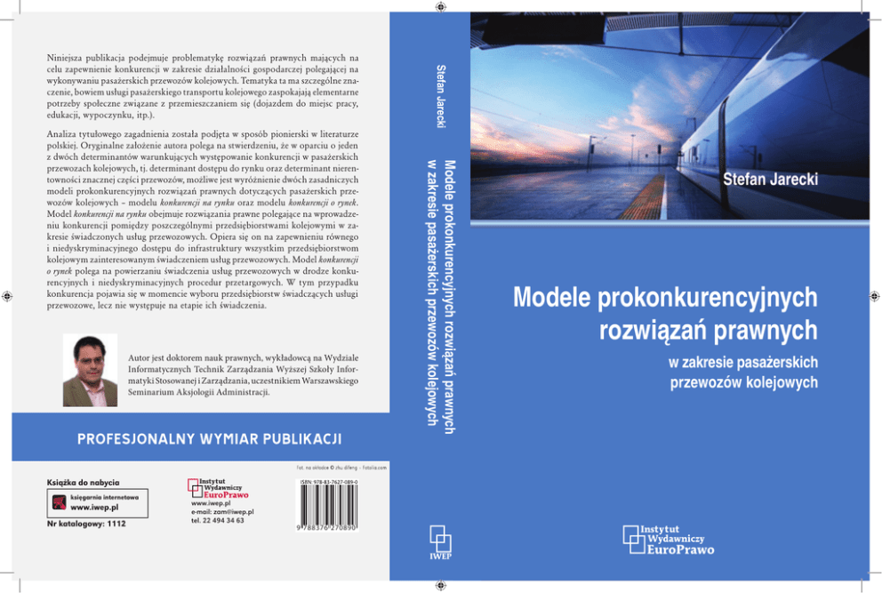 Książka do nabycia księgarnia internetowa www.iwep.pl Nr katalogowy: 1112 www.iwep.pl e-mail: [email protected] tel. 22 494 34 63 9 788376 270890 EP EM O IW Stefan Jarecki er ia ły D Modele prokonkurencyjnych rozwiązań prawnych M at Autor jest doktorem nauk prawnych, wykładowcą na Wydziale Informatycznych Technik Zarządzania Wyższej Szkoły Informatyki Stosowanej i Zarządzania, uczestnikiem Warszawskiego Seminarium Aksjologii Administracji. Modele prokonkurencyjnych rozwiązań prawnych w zakresie pasażerskich przewozów kolejowych Analiza tytułowego zagadnienia została podjęta w sposób pionierski w literaturze polskiej. Oryginalne założenie autora polega na stwierdzeniu, że w oparciu o jeden z dwóch determinantów warunkujących występowanie konkurencji w pasażerskich przewozach kolejowych, tj. determinant dostępu do rynku oraz determinant nierentowności znacznej części przewozów, możliwe jest wyróżnienie dwóch zasadniczych modeli prokonkurencyjnych rozwiązań prawnych dotyczących pasażerskich przewozów kolejowych – modelu konkurencji na rynku oraz modelu konkurencji o rynek. Model konkurencji na rynku obejmuje rozwiązania prawne polegające na wprowadzeniu konkurencji pomiędzy poszczególnymi przedsiębiorstwami kolejowymi w zakresie świadczonych usług przewozowych. Opiera się on na zapewnieniu równego i niedyskryminacyjnego dostępu do infrastruktury wszystkim przedsiębiorstwom kolejowym zainteresowanym świadczeniem usług przewozowych. Model konkurencji o rynek polega na powierzaniu świadczenia usług przewozowych w drodze konkurencyjnych i niedyskryminacyjnych procedur przetargowych. W tym przypadku konkurencja pojawia się w momencie wyboru przedsiębiorstw świadczących usługi przewozowe, lecz nie występuje na etapie ich świadczenia. Stefan Jarecki Niniejsza publikacja podejmuje problematykę rozwiązań prawnych mających na celu zapewnienie konkurencji w zakresie działalności gospodarczej polegającej na wykonywaniu pasażerskich przewozów kolejowych. Tematyka ta ma szczególne znaczenie, bowiem usługi pasażerskiego transportu kolejowego zaspokajają elementarne potrzeby społeczne związane z przemieszczaniem się (dojazdem do miejsc pracy, edukacji, wypoczynku, itp.). w zakresie pasażerskich przewozów kolejowych ria at e M ły O EM D EP IW EP EM O IW Stefan Jarecki M at e ria ły D Modele prokonkurencyjnych rozwiązań prawnych w zakresie pasażerskich przewozów kolejowych © Instytut Wydawniczy EuroPrawo Sp. z o.o., 2013 M at e ria ły D EM O IW EP Wszelkie prawa zastrzeżone. Żadna część niniejszej publikacji nie może być reprodukowana, przechowywana i przetwarzana jako źródło danych w jakiejkolwiek formie zapisu bez pisemnej zgody wydawcy. książka do nabycia: księgarnia internetowa www.iwep.pl [email protected] nr kat. 1112 Warszawa, 2013 ISBN: 978-83-7627-089-0 EP Spis treści IW Wykaz akronimów ............................................................. 11 Wstęp ............................................................................... 13 D EM O Rozdział I Zagadnienia wprowadzające ................................................ 17 1. Cel i metoda badawcza ............................................................... 17 2. Pojęcie konkurencji .................................................................... 24 3. Modele konkurencji wyróżnione ze względu na determinant dostępu do rynku ...................................................................... 38 M at e ria ły Rozdział II Rozwiązania stosowane w wybranych państwach członkowskich Unii Europejskiej .......................... 45 1. Organizacja i finansowanie pasażerskich przewozów kolejowych w Zjednoczonym Królestwie Wielkiej Brytanii i Irlandii Północnej .................................................................... 45 2. Organizacja i finansowanie pasażerskich przewozów kolejowych w Republice Federalnej Niemiec ................................ 65 Rozdział III Konkurencja na rynku pasażerskich przewozów kolejowych ........ 81 1. Umożliwienie konkurencji na rynku świadczenia usług transportu kolejowego. Przedsiębiorstwa pionowo zintegrowane i monopol naturalny .................................................................. 81 2. Rozdzielenie działalności polegającej na zarządzaniu infrastrukturą kolejową i świadczeniu usług przewozowych (unbundling) ............. 91 2.1. Rodzaje unbundlingu ............................................................ 91 6 Spis treści at e ria ły D EM O IW EP 2.2. Modele unbundlingu występujące w Europie ........................... 95 2.3. Unbundling w prawie Unii Europejskiej ................................. 97 2.4. Unbundling w prawie polskim .............................................. 105 2.4.1. Zapewnienie niezależności personalno-decyzyjnej PKP PLK S.A. (unbundling funkcjonalny) .................... 114 2.4.2. Przejęcie własności PKP PLK S.A. przez Skarb Państwa (unbundling własnościowy) ........... 116 2.4.3. PKP PLK S.A. jako podmiot administrujący ............... 118 3. Dostęp przewoźników do infrastruktury kolejowej ..................... 121 3.1. Pojęcie infrastruktury kolejowej ........................................... 121 3.2. Dostęp do infrastruktury kolejowej w przepisach prawa UE .......................................................................... 123 3.2.1. Dostęp do infrastruktury w celu świadczenia międzynarodowych przewozów kolejowych w przepisach prawa Unii Europejskiej ......................... 131 3.3. Dostęp do infrastruktury kolejowej w przepisach prawa polskiego .................................................................. 145 3.3.1. Okres przejściowy ...................................................... 157 3.3.2. Dostęp do infrastruktury w celu świadczenia międzynarodowych przewozów kolejowych w przepisach prawa polskiego ..................................... 163 3.3.3. Dostęp do infr