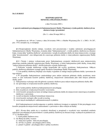 Dz.U.03.88.813 ROZPORZĄDZENIE MINISTRA SPRAWIEDLIWOŚCI z dnia 9 kwietnia 2003 r. w sprawie należności przysługujących funkcjonariuszowi Służby Więziennej z tytułu podróży służbowych na obszarze kraju i przeniesień (Dz. U. z dnia 20 maja 2003 r.) Na podstawie art. 109 ust. 2 ustawy z dnia 26 kwietnia 1996 r. o Służbie Więziennej (Dz. U. z 2002 r. Nr 207, poz. 1761) zarządza się, co następuje: § 1. Rozporządzenie określa rodzaje, wysokość, tryb przyznawania i wypłaty należności przysługujących funkcjonariuszowi Służby Więziennej, zwanemu dalej "funkcjonariuszem", z tytułu podróży służbowej na obszarze kraju, zwanej dalej "podróżą służbową", przeniesienia z urzędu do pełnienia służby do innej miejscowości, zwanego dalej "przeniesieniem", oraz delegowania do czasowego pełnienia służby w innej jednostce organizacyjnej Służby Więziennej. § 2. 1. Termin i miejsce wykonywania przez funkcjonariusza czynności służbowych poza miejscowością stanowiącą siedzibę jednostki organizacyjnej Służby Więziennej, w której funkcjonariusz pełni służbę, zwaną dalej "stałym miejscem pełnienia służby", określa polecenie wyjazdu służbowego. 2. Polecenie wyjazdu służbowego wydaje bezpośredni lub wyższy przełożony funkcjonariusza. Odbycie podróży służbowej samolotem wymaga zgody Dyrektora Generalnego Służby Więziennej. 3. Czas podróży służbowej obejmuje czas między wyjazdem ze stałego miejsca pełnienia służby i powrotem do tego miejsca. 4. W przypadku funkcjonariusza zamieszkałego poza stałym miejscem pełnienia służby przełożony może uznać, w celu rozliczenia kosztów podróży służbowej, miejscowość zamieszkania jako stałe miejsce pełnienia służby, jeżeli: 1) funkcjonariusz wykonuje stale lub głównie czynności służbowe poza stałym miejscem pełnienia służby albo 2) nie spowoduje to zwiększenia kosztów podróży służbowej. § 3. Z tytułu podróży służbowej funkcjonariuszowi przysługują: 1) diety na pokrycie zwiększonych kosztów wyżywienia; 2) zwrot kosztów przejazdu na trasie od stałego miejsca pełnienia służby do miejscowości stanowiącej cel podróży służbowej i z powrotem; 3) ryczałt na dojazdy środkami komunikacji miejscowej; 4) zwrot kosztów noclegów albo ryczałt za nocleg; 5) zwrot innych niezbędnych i udokumentowanych wydatków. § 4. Funkcjonariuszowi przebywającemu w podróży służbowej trwającej co najmniej 10 dni przysługuje zwrot kosztów przejazdu do miejscowości zamieszkania i z powrotem w dniu wolnym od służby. § 5. 1. Kwotę diety ustala się w wysokości określonej w przepisach o wysokości oraz warunkach ustalania należności przysługujących pracownikowi z tytułu podróży służbowej na obszarze kraju, wydanych na podstawie art. 775 § 2 Kodeksu pracy. 2. Jeżeli podróż służbowa trwa: 1) nie dłużej niż dobę i wynosi: a) mniej niż 8 godzin - dieta nie przysługuje, b) od 8 do 12 godzin - przysługuje połowa diety, c) ponad 12 godzin - przysługuje dieta w pełnej wysokości; 2) dłużej niż jedną dobę - za każdą dobę przysługuje dieta w pełnej wysokości, a za niepełną, ale rozpoczętą dobę: a) do 8 godzin - przysługuje połowa diety, b) ponad 8 godzin - przysługuje dieta w pełnej wysokości. 3. Dieta nie przysługuje: 1) za czas pobytu w stałym miejscu pełnienia służby lub miejscu zamieszkania; 2) za czas pobytu w szpitalu lub innym zakładzie leczniczym w związku z chorobą powstałą podczas podróży służbowej; 3) w przypadkach, w których funkcjonariusz otrzymuje całodzienne bezpłatne wyżywienie w naturze lub równoważnik pieniężny w zamian za wyżywienie. § 6. 1. Środek transportu odpowiedni do odbycia podróży służbowej określa przełożony w poleceniu wyjazdu służbowego, uwzględniając posiadane przez funkcjonariusza uprawnienie do przejazdów bezpłatnych lub ulgowych, dogodność połączeń na danej trasie oraz termin i pilność załatwienia czynności służbowej. 2. Zwrot kosztów przejazdu obejmuje cenę biletu określonego środka transportu, z uwzględnieniem posiadanej przez funkcjonariusza ulgi na dany środek transportu, bez względu na to, z jakiego tytułu ulga przysługuje. 3. Zwrotu kosztów przejazdu autobusem, pociągiem w wagonie sypialnym lub z miejscami do leżenia, pociągiem ekspresowym, InterCity i EuroCity oraz przelotu samolotem dokonuje się funkcjonariuszowi w wysokości udokumentowanej biletami i miejscówkami. § 7. Na wniosek funkcjonariusza przełożony może wyrazić zgodę na przejazdy w podróży służbowej samochodem, który nie pozostaje w dyspozycji Służby Więziennej. W takim przypadku funkcjonariuszowi przysługuje zwrot kosztów przejazdu według stawki za 1 km przebiegu samochodu, ustalonej przez przełożonego, nie wyższej niż określona na podstawie przepisów, o których mowa w § 5 ust. 1. § 8. 1. Za każdą rozpoczętą dobę pobytu w podróży służbowej funkcjonariuszowi przysługuje ryczałt na pokrycie kosztów dojazdów środkami komunikacji miejscowej (miejskiej) w wysokości 20% diety. 2. Ryczałt, o którym mowa w ust. 1, nie przysługuje, jeżeli funkcjonariusz odbywa podróż służbową pojazdem służbowym lub samochodem, o którym mowa w § 7, albo gdy nie ponosi kosztów, na których pokrycie przeznaczony jest ten ryczałt. § 9. 1. Za nocleg w hotelu lub innym obiekcie świadczącym usługi hotelarskie funkcjonariuszowi przysługuje zwrot kosztów w wysokości stwierdzonej rachunkiem, jednak nie więcej, za 1 dobę hotelową, niż dziesięciokrotność wysokości diety. W uzasadnionych przypadkach przełożony może zezwolić funkcjonariuszowi na skorzystanie z droższego noclegu. 2. Funkcjonariuszowi, który wobec braku możliwości uzyskania noclegu w miejscowości stanowiącej cel podróży służbowej korzystał z noclegu w miejscowości, do której czas dojazdu nie przekracza jednej godziny, przysługuje 