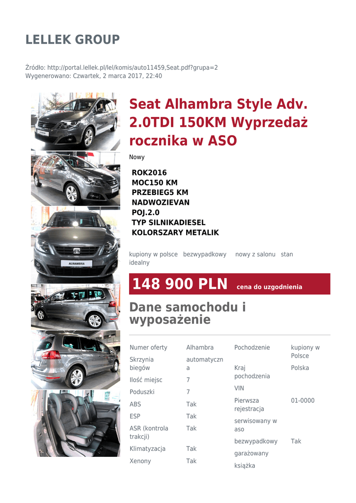 LELLEK GROUP Źródło: http://portal.lellek.pl/lel/komis/auto11459,Seat.pdf?grupa=2 Wygenerowano: Czwartek, 2 marca 2017, 22:40 Seat Alhambra Style Adv. 2.0TDI 150KM Wyprzedaż rocznika w ASO Nowy ROK2016 MOC150 KM PRZEBIEG5 KM NADWOZIEVAN POJ.2.0 TYP SILNIKADIESEL KOLORSZARY METALIK kupiony w polsce bezwypadkowy idealny 148 900 PLN nowy z salonu stan cena do uzgodnienia Dane samochodu i wyposażenie Numer oferty Alhambra Skrzynia biegów automatyczn a Ilość miejsc 7 Poduszki 7 ABS Tak ESP Tak ASR (kontrola trakcji) Tak Klimatyzacja Tak Xenony Tak Pochodzenie kupiony w Polsce Kraj pochodzenia Polska VIN Pierwsza rejestracja 01-0000 serwisowany w aso bezwypadkowy garażowany książka Tak serwisowa Elektryczne szyby Tak Elektryczne lusterka Tak kupiony w salonie Szyberdach Tak tunning Wspomaganie kierownicy Tak homologacja Komputer Tak Radioodtwarza cz Tak Alarm Tak Immobilizer Tak Centralny zamek Tak Nawigacja satelitarna Tak Światła przeciwmgieln e Tak Czujnik deszczu Tak Czujniki parkowania Tak Hak Tak Kierownica wielofunkcyjna Tak Podgrzewane fotele Tak Tempomat Tak Asystent pasa ruchu Tak Czujnik martwego pola Tak Kamera cofania Tak Bluetooth Tak System Start-Stop Tak Asystent parkowania Tak Czujniki parkowania przód Tak I właściciel stan idealny właściciel niepalący Tak Dach panoramiczny Tak Alufelgi Tak Miejsce postoju AUTO CENTRUM NYSA Opis dodatkowy Handlowiec TANIEJ o 14 700 zł Paweł Bąk +48 77 433 22 21 zapytaj mobile +48 601 758 748 Auto dostępne od ręki!!! ZAPYTAJ o bardzo atrakcyjne formy finansowania lub rabaty dla FIRM I GRUP ZAWODOWYCH! WYPOSAŻENIE DODATKOWE PREZENTOWANEGO MODELU: Charakterystyka spalania cykl miejski 6.7 l/100km cykl pozamiejski 4.5 l/100km cykl mieszany 5.3 l/100km emisja CO2 117 g/km Gwarancja Gwarancja dostępna Ubezpieczenie Ubezpieczenie dostępne Kredyt Kredyt dostępny - 2 foteliki dziecięce zintegrowane w zewnętrznym fotelu w drugim rzędzie siedzeń - Trzeci rząd foteli 2 + 3 + 2, system przypominający o obowiązku zapinania pasów bezpieczeństwa przy 7 fotelach, fotele w drugim rzędzie z funkcją ułatwiającą wsiadanie oraz fotele w trzecim rzędzie z dywanikami i zaczepami iSOFIX + Top Tether - Mirror Link - Zestaw naprawczy do opon - Alarm - Asystent świateł drogowych - Boczne poduszki powietrzne w drugim rzędzie foteli - Pakiet technologiczny WYBRANE ELEMENTY WYPOSAŻENIA WERSJI STYLE ADVANCED: - 17-calowe felgi aluminiowe - Przesuwany podłokietnik ze schowkiem umieszczony między przednimi fotelami - Dodatkowe schowki w bagażniku - Zamykane schowki w podłodze przy drugim rzędzie foteli - 2 rolety przeciwsłoneczne przy tylnych drzwiach bocznych - Płaska półka na oparciach przednich foteli - Schowki pod fotelem kierowcy i pasażera - Automatyczne lusterko wsteczne z układem zabezpieczającym przed oślepieniem - Dywaniki materiałowe z przodu i z tyłu - Zamykany, podświetlany i chłodzony schowek w konsoli centralnej - 3 osobne fotele z tyłu z funkcją przesuwania wzdłuż osi pojazdu, regulacją zagłówków i funkcją Easy Fol - Wielofunkcyjna kierownica obszyta skórą - Elektrycznie sterowany hamulec pomocniczy - Składane lusterka boczne - Zdalne otwieranie tylnej klapy Zeskanuj kod, aby zobaczyć ofertę online - Elektrycznie sterowane i podgrzewane lusterka boczne - System bezkluczykowego dostępu i uruchamiania samochodu KESSY - Elektrycznie sterowane szyby boczne z przodu i z tyłu - Navi system - Media System Plus - Czujniki parkowania z przodu i z tyłu z Optycznym systemem parkowania OPS - Tempomat - Czujnik zmierzchu - System rozpoznawania zmęczenia - Czujnik deszczu - Automatyczna trzystrefowa klimatyzacja Climatronic z panelem sterowania przy drugim rzędzie siedzeń - Oświetlenie parkingowe w lusterkach bocznych - Tylne światła LED z oświetleniem tablicy rejestracyjnej LED - Reflektory biksenonowe + spryskiwacze reflektorów + System Adaptacyjnego Oświetlenia (AFS) - Światła przeciwmgielne z funkcją doświetlania zakrętów - Śruby zabezpieczające felgi przed kradzieżą - Opony samouszczelniające się - Pakiet Chromo - Przyciemniane szyby - Elektrycznie przesuwane drzwi + elektrycznie otwierana klapa bagażnika - Atermiczne szyby z boku i z tyłu - 4 lata Ochrony Gwarancyjnej SEAT - ESC z systemem wspomagania hamowania awaryjnego - Pięć trzypunktowych automatycznych pasów bezpieczeństwa z napinaczami i regulacją wysokości mocowania - Dezaktywacja poduszki powietrznej pasażera - 7 poduszek powietrznych (2 czołowe, 2 boczne, 2 kurtyny powietrzne, poduszka kolanowa kierowcy) Nota prawna Informacja nie stanowi oferty w rozumieniu art. 66 Kodeksu Cywilnego. Podane dane mają charakter wyłącznie informacyjny. Pełna informacja dostępna jest u handlowca. Sprzedający nie odpowiada za ewentualne błędy lub nieaktualność ogłoszenia.
