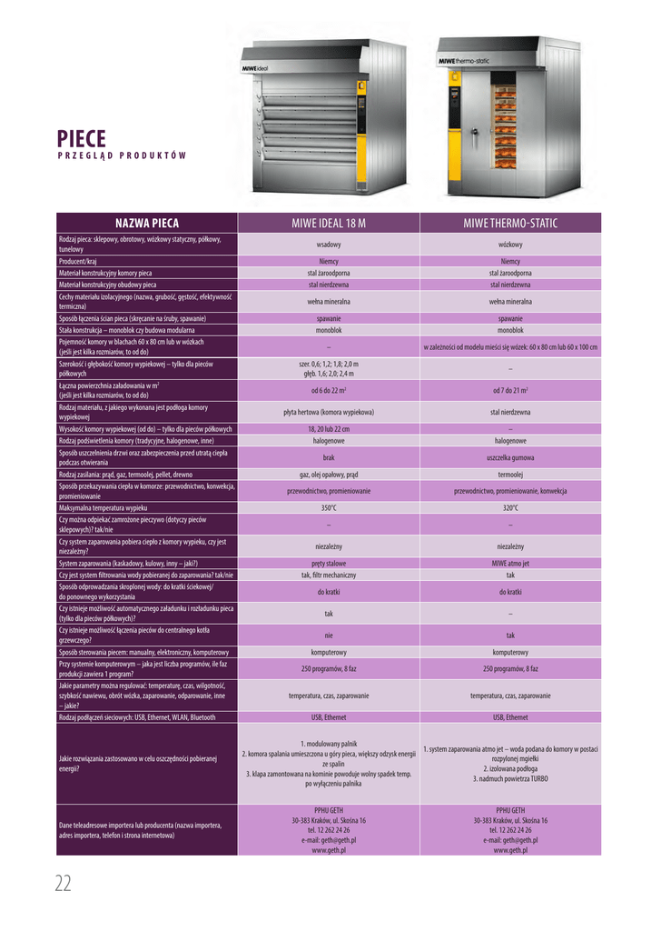 piece p r z e g l ą d p r o d u k t ó w Nazwa pieca Rodzaj pieca: sklepowy, obrotowy, wózkowy statyczny, półkowy, tunelowy Producent/kraj Materiał konstrukcyjny komory pieca Materiał konstrukcyjny obudowy pieca Cechy materiału izolacyjnego (nazwa, grubość, gęstość, efektywność termiczna) Sposób łączenia ścian pieca (skręcanie na śruby, spawanie) Stała konstrukcja – monoblok czy budowa modularna Pojemność komory w blachach 60 x 80 cm lub w wózkach (jeśli jest kilka rozmiarów, to od do) Szerokość i głębokość komory wypiekowej – tylko dla pieców półkowych Łączna powierzchnia załadowania w m2 (jeśli jest kilka rozmiarów, to od do) Rodzaj materiału, z jakiego wykonana jest podłoga komory wypiekowej Wysokość komory wypiekowej (od do) – tylko dla pieców półkowych Rodzaj podświetlenia komory (tradycyjne, halogenowe, inne) Sposób uszczelnienia drzwi oraz zabezpieczenia przed utratą ciepła podczas otwierania Rodzaj zasilania: prąd, gaz, termoolej, pellet, drewno Sposób przekazywania ciepła w komorze: przewodnictwo, konwekcja, promieniowanie Maksymalna temperatura wypieku Czy można odpiekać zamrożone pieczywo (dotyczy pieców sklepowych)? tak/nie Czy system zaparowania pobiera ciepło z komory wypieku, czy jest niezależny? System zaparowania (kaskadowy, kulowy, inny – jaki?) Czy jest system filtrowania wody pobieranej do zaparowania? tak/nie Sposób odprowadzania skroplonej wody: do kratki ściekowej/ do ponownego wykorzystania Czy istnieje możliwość automatycznego załadunku i rozładunku pieca (tylko dla pieców półkowych)? Czy istnieje możliwość łączenia pieców do centralnego kotła grzewczego? Sposób sterowania piecem: manualny, elektroniczny, komputerowy Przy systemie komputerowym – jaka jest liczba programów, ile faz produkcji zawiera 1 program? Jakie parametry można regulować: temperaturę, czas, wilgotność, szybkość nawiewu, obrót wózka, zaparowanie, odparowanie, inne – jakie? Rodzaj podłączeń sieciowych: USB, Ethernet, WLAN, Bluetooth Jakie rozwiązania zastosowano w celu oszczędności pobieranej energii? Dane teleadresowe importera lub producenta (nazwa importera, adres importera, telefon i strona internetowa) 22 MIWE ideal 18 m MIWE thermo-static wsadowy wózkowy Niemcy stal żaroodporna stal nierdzewna Niemcy stal żaroodporna stal nierdzewna wełna mineralna wełna mineralna spawanie monoblok spawanie monoblok – w zależności od modelu mieści się wózek: 60 x 80 cm lub 60 x 100 cm szer. 0,6; 1,2; 1,8; 2,0 m głęb. 1,6; 2,0; 2,4 m – od 6 do 22 m2 od 7 do 21 m2 płyta hertowa (komora wypiekowa) stal nierdzewna 18, 20 lub 22 cm halogenowe – halogenowe brak uszczelka gumowa gaz, olej opałowy, prąd termoolej przewodnictwo, promieniowanie przewodnictwo, promieniowanie, konwekcja 350°C 320°C – – niezależny niezależny pręty stalowe tak, filtr mechaniczny MIWE atmo jet tak do kratki do kratki tak – nie tak komputerowy komputerowy 250 programów, 8 faz 250 programów, 8 faz temperatura, czas, zaparowanie temperatura, czas, zaparowanie USB, Ethernet USB, Ethernet 1. modulowany palnik 1. system zaparowania atmo jet – woda podana do komory w postaci 2. komora spalania umieszczona u góry pieca, większy odzysk energii rozpylonej mgiełki ze spalin 2. izolowana podłoga 3. klapa zamontowana na kominie powoduje wolny spadek temp. 3. nadmuch powietrza TURBO po wyłączeniu palnika PPHU GETH 30-383 Kraków, ul. Skośna 16 tel. 12 262 24 26 e-mail: [email protected] www.geth.pl PPHU GETH 30-383 Kraków, ul. Skośna 16 tel. 12 262 24 26 e-mail: [email protected] www.geth.pl MIWE CONDO 120 X 60 CM MIWE ROLL-IN E+ GT 1200 cukierniczy, półkowy obrotowy piec półkowy piekarniczo-cukierniczy Niemcy stal żaroodporna stal nierdzewna Niemcy stal żaroodporna stal nierdzewna Ibis Polska płyta hertowa, blacha kwasoodporna blacha kwasoodporna wełna mineralna wełna mineralna – komora spawana, moduły skręcane ze sobą modularna skręcanie monoblok w zależności od modelu mieszczą się 1 lub 2 wózki o wymiarach: 60 x 80 cm lub 60 x 100 cm – – – 4 blachy 40 x 60 na komorę 50 x 40, 60 x 80, 80 x 60, 120 x 80, 120 x 120 cm – 125 x 85 cm od 0,24 do 8,6 m2 MIWE roll-in jumbo do 24 m², MIWE roll-in e + do 12 m2 1 m2 na komorę, maks. 6 modułów płyta hertowa (komora wypiekowa) stal nierdzewna płyta hertowa 13, 17 lub 22 cm halogenowe – halogenowe 18 cm – – uszczelka drzwiowa – prąd prąd, gaz, olej opałowy elektryczny przewodnictwo, promieniowanie konwekcja – 350°C 350°C 270°C nie tak tak niezależny, własna grzałka pobiera ciepło z komory system zaparowania niezależny elektryczny tak kaskadowy nie rurowy – do kratki całościowe odparowanie w komorze – – – – nie nie – komputerowy komputerowy, elektryczny elektroniczny 250 programów, 8 faz 250 programów, 8 faz 20 programów temperatura, czas, zaparowanie temperatura, czas, zaparowanie, przepływ powietrza w komorze wypiekowej temperatura, czas, wilgotność, zaparowanie, odparowanie, autostart USB, Ethernet 1. trzystopniowa regulacja mocy grzałek 2. tryb ekoczuwania 3. uszczelki na szybach komory PPHU GETH 30-383 Kraków, ul. Skośna 16 tel. 12 262 24 26 e-mail: [email protected] www.geth.pl USB, Ethernet 1. system air control (żaluzja na suficie komory) 2. kanał obiegu spalin zamontowany na całej tylnej ścianie 3. nowy system zaparowania 4. ściana magazynująca energię cieplną 5. temp. spalin niższa niż w komorze pieczenia 6. nowe, bardziej szczelne drzwi 7. system eco wing, klapa na kominie spalinowym zapobiega utracie ciepła PPHU GETH 30-383 Kraków, ul. Skośna 16 tel. 12 262 24 26 e-mail: [email protected] www.geth.pl – izolacja termiczna, grzałki energooszczędne PPHU TECHKLIPS 89-200 Szubin Królikowo, ul. Słupowa 4 tel. 517 911 007 e-mail: [email protected] www.techklips.pl, www.immbis.pl 23 PIECE PRZEGLĄD PRODUKTÓW NAZWA PIECA Rodzaj pieca: sklepowy, obrotowy, wózkowy s