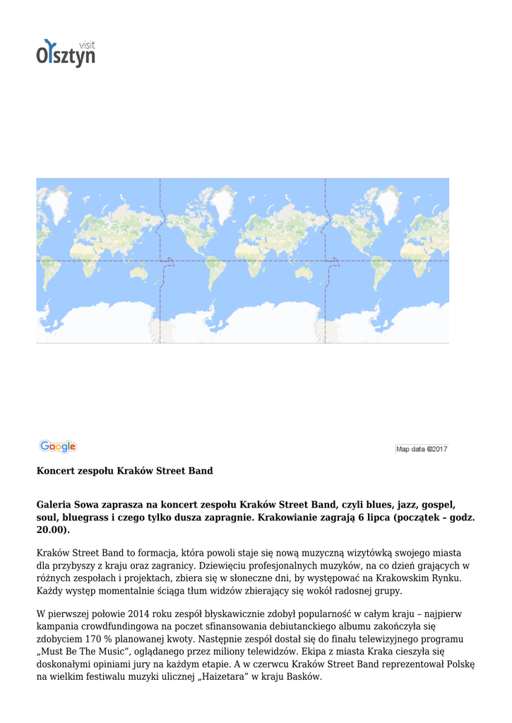 Koncert zespołu Kraków Street Band Galeria Sowa zaprasza na koncert zespołu Kraków Street Band, czyli blues, jazz, gospel, soul, bluegrass i czego tylko dusza zapragnie. Krakowianie zagrają 6 lipca (początek – godz. 20.00). Kraków Street Band to formacja, która powoli staje się nową muzyczną wizytówką swojego miasta dla przybyszy z kraju oraz zagranicy. Dziewięciu profesjonalnych muzyków, na co dzień grających w różnych zespołach i projektach, zbiera się w słoneczne dni, by występować na Krakowskim Rynku. Każdy występ momentalnie ściąga tłum widzów zbierający się wokół radosnej grupy. W pierwszej połowie 2014 roku zespół błyskawicznie zdobył popularność w całym kraju – najpierw kampania crowdfundingowa na poczet sfinansowania debiutanckiego albumu zakończyła się zdobyciem 170 % planowanej kwoty. Następnie zespół dostał się do finału telewizyjnego programu „Must Be The Music”, oglądanego przez miliony telewidzów. Ekipa z miasta Kraka cieszyła się doskonałymi opiniami jury na każdym etapie. A w czerwcu Kraków Street Band reprezentował Polskę na wielkim festiwalu muzyki ulicznej „Haizetara” w kraju Basków. Rok 2015 to przede wszystkim wydanie kolejnej niezwykłej płyty, nagranej w Radio Kraków, a w całości poświęconej twórczości Jerzego Wójcika – pierwszego polskiego artysty wykonującego muzykę bluegrassową. Kompozycje z repertuaru „Little Ole Opry” wykonane zostały przez Kraków Street Band oraz Krystynę Święcicką-Wójcik i trójkę zaproszonych gości. W corocznej ankiecie czasopisma „Twój Blues” Kraków Street Band uznany został za „Odkrycie Roku 2014”, po czym sięgnął po tytuł „Zespół Roku 2015”. Bilety: 25 zł w przedsprzedaży i 30 zł w dniu koncertu do nabycia w sklepie muzycznym RockFan (D.H. Inka) i Galerii Sowa. 1)Klub „Galeria Sowa”, (2016-07-06 20:00-2016-07-06 22:00) www.visit.olsztyn.eu