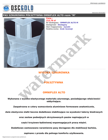 Informacje o produkcie Utworzono 02-03-2017 PAS SZNURÓWKA PÓŁSZTYWNA OMNIFLEX ALTO rozm "M" Cena : 212,76 zł er m ar k Nr katalogowy : OMNIFLEX ALTO M Dostępność : Dostępny Stan magazynowy : wysoki Średnia ocena : brak recenzji at WYSOKA SZNURÓWKA w PÓŁSZTYWNA OMNIFLEX ALTO Wykonana z wysoko-elastycznego materiału ażurowego, posiadającego właściwości oddychające. Zaopatrzona w cztery wzmocnienia aluminiowe formowane anatomicznie, dwie elastyczne stalki boczne dodatkowo stabilizujące na wysokości talerzy biodrowych oraz zestaw podwójnych skrzyżowanych pasów napinających w części krzyżowo-lędźwiowej wspomagających pracę mięśni. Dodatkowo zastosowano naramienne pasy dociągowe dla stabilizacji barków, zapinane z przodu dla pełnego komfortu użytkowania. Wygenerowano w programie www.oscGold.com KOLORY: BIAŁY LUB BEŻOWY ROZMIAR: obwód pasa S 65 - 80 cm M 75 - 90 cm L 85 - 100 cm XL 95 - 110 cm er m ar k XXL 105 - 140 cm ZASTOSOWANIE: * procesy zapalne w obrębie stawów kręgosłupa * niestabilność kręgosłupa * dyskopatia wielopoziomowa * zmiany zwyrodnieniowe kręgosłupa * kręgozmyk lędźwiowy * nerwobóle lędźwiowe at * zespoły bólowe odcinka piersiowo-lędźwiowo-krzyżowego w * wzmożone napięcia mięśni * po zabiegach operacyjnych PRODUKT JEST NOWY I ZAPAKOWANY W ORYGINALNE OPAKOWANIE RACHUNEK LUB PARAGON