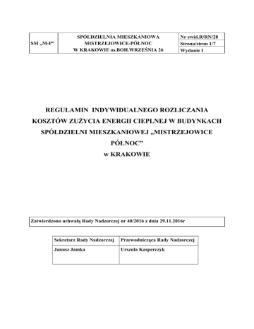 SM „M-P” SPÓŁDZIELNIA MIESZKANIOWA MISTRZEJOWICE-PÓŁNOC W KRAKOWIE os.BOH.WRZEŚNIA 26 Nr ewid.R/RN/28 Strona/stron 1/7 Wydanie I REGULAMIN INDYWIDUALNEGO ROZLICZANIA KOSZTÓW ZUŻYCIA ENERGII CIEPLNEJ W BUDYNKACH SPÓŁDZIELNI MIESZKANIOWEJ „MISTRZEJOWICE PÓŁNOC” w KRAKOWIE Zatwierdzono uchwałą Rady Nadzorczej nr 40/2016 z dnia 29.11.2016r Sekretarz Rady Nadzorczej Przewodnicząca Rady Nadzorczej Janusz Jamka Urszula Kasperczyk SM”M-P” Tytuł: Regulamin Indywidualnego Rozliczania Kosztów Zużycia Energii Cieplnej w Budynkach Spółdzielni Mieszkaniowej „Mistrzejowice –Północ” w Krakowie Nr ewid.R/RN/28 Strona stron 2 /9 Wydanie I §1 W budynkach Spółdzielni Mieszkaniowej Mistrzejowice Północ stosuje się indywidualne rozliczanie kosztów zużycia energii cieplnej dla lokali. Pod pojęciem UŻYTKOWNIK rozumie się osobę której lokal wyposażony jest w instalację centralnego ogrzewania. §2 Podstawą rozliczania energii cieplnej jest koszt całkowity zakupionego ciepła dla danego budynku lub węzła , naliczony fakturami Miejskiego Przedsiębiorstwa Energetyki Cieplnej, poniesiony w okresie rozliczeniowym. Na koszt ten składają się: 1. Koszt zakupu ciepła ustalony ciepłomierzami głównymi, zainstalowanymi w węzłach cieplnych budynków. 2. Koszt mocy zamówionej, jej przesyłu i opłaty abonamentowej oraz innych opłat stałych dla danego budynku. §3 Za powierzchnię ogrzewaną centralnie uważa się ogólną powierzchnię użytkową lokalu. Powierzchnie pomieszczeń nie posiadających grzejników c.o wchodzących w skład lokali mieszkalnych i użytkowych ogrzewanych pośrednio ciepłem sąsiadujących pomieszczeń, traktuje się jako powierzchnię ogrzewaną centralnie. §4 Przez okres rozliczeniowy rozumie się przedział czasu , w którym dokonuje się rozliczenia kosztów całkowitych ogrzewania. §5 Zaliczki na pokrycie kosztów ogrzewania i kosztów rozliczenia ciepła przez firmę rozliczającą są wnoszone przez użytkowników w formie miesięcznych zaliczkowych przedpłat. Wysokość miesięcznej przedpłaty ustala się zwiększając średni koszt ogrzania 1 m2 na miesiąc z poprzedniego okresu grzewczego o 0,30 zł i mnożąc tak otrzymany koszt przez powierzchnię mieszkania. Przy zmianach cen lub zmianach poboru energii cieplnej ustalona wysokość zaliczki w okresie rozliczeniowym może być korygowana. 1 2 §6 Rozliczenie c.o lokali lub pomieszczeń nie wyposażonych w podzielniki kosztów ciepła z przyczyn leżących po stronie użytkownika lokalu lub w których użytkownik lokalu zlikwidował grzejniki, odbywa się poprzez pomnożenie 200 % średnich kosztów ogrzania 1 m2 w danym węźle przez ilość m2 danego lokalu. Pomieszczenia nie posiadające źródła ciepła opomiarowanego, gdzie nie ma możliwości technicznych montażu podzielników(np.grzejnik rurowy,favier itp.) lub posiadające zasilanie z innego źródła ciepła np. grzałka elektryczna, rozliczane są poprzez pomnożenie średniego kosztu ogrzewania 1m2 w danym węźle przez ilość m2 danego pomieszczenia. SM”M-P” Tytuł: Regulamin Indywidualnego Rozliczania Kosztów Zużycia Energii Cieplnej w Budynkach Spółdzielni Mieszkaniowej „Mistrzejowice –Północ” w Krakowie Nr ewid.R/RN/28 Strona stron 3 /9 Wydanie I §7 1.Indywidualne rozliczenie kosztów c.o. lokali wyposażonych w podzielniki kosztów ciepła zainstalowanych na grzejnikach dokonywane jest na podstawie wskazań tych podzielników. 2.Całkowite koszty dotyczące zużytej energii zgodnie ze wskazaniem na liczniku głównym zainstalowanym w węźle cieplnym pomiejsza się o koszty energii zużytej do ogrzania pomieszczeń wspólnych i koszty energii zużytej na wentylację. Pozostałe koszty dzieli się zgodnie ze wskazaniami podzielników. 3.Koszty ogrzania pomieszczeń wspólnych określa się procentowo, biorąc pod uwagę stosunek mocy grzejników w pomieszczeniach wspólnych do mocy grzejników zainstalowanych w lokalach. 4. Koszt energii zużytej na wentylację określa się procentowo, biorąc stosunek obliczeniowej sezonowej ilość energii cieplnej potrzebnej do ogrzania budynku /straty energii/ do sezonowej ilości energii cieplnej potrzebnej do ogrzania powietrza wentylacyjnego. Procentowy udział energii potrzebnej do ogrzania powietrza wentylacyjnego dla poszczególnych bydynków stanowi załącznik nr 3 do niniejszego regulaminu. 5.Koszty mocy zamówionej, przesyłu, opłaty abonamentowej, uznanych reklamacji z poprzedniego okresu rozliczeniowego, ogrzania pomieszczeń wspólnych, koszty energii zużytej na wentylację i innych opłat stałych, rozlicza się proporcjonalnie do powierzchni użytkowej lokali. §8 Odczyt wskazań podzielników kosztów ciepła na nowy okres rozliczeniowy dokonywane są przed kolejnym okresem rozliczeniowym każdego roku przez firmę rozliczającą, która zawarła umowę ze Spółdzielnią: 1. Radiowo bez konieczności wchodzenia do mieszkań. 2. Naocznie – wymaga wejścia do mieszkania. §9 W przypadku o którym mowa w § 8 ust. 2: 1.O terminie dokonywania odczytów firma rozliczająca zawiadamia użytkowników budynków w sposób ustalony ze Spółdzielnią z minimalnym wyprzedzeniem 10 dni przed planowanym odczytem poprzez ogłoszenia umieszczane na bramach. 2.Jeżeli odczyt nie mógł być dokonany z winy użytkownika lokalu, firma rozliczająca pisemnie zawiadamia użytkownika poprzez pozostawienie na drzwiach budynku zawiadomienia o ponownym bezpłatnym terminie odczytu. Bezpłatny odczyt odbywa się w ciągu 7 dni od pierwszego odczytu. Trzeci i następne terminy odczytów są wykonywane odpłatnie po uzgodnieniu terminu z użytkownikiem na jego koszt, jednak nie później niż 21 dni po terminie pierwszego odczytu. W takim przypadku użytkownik jest zobowiązany ustalić z firmą rozliczającą indywidualny termin odczytu urządzeń pomiarowych. 3.W czasie odczytu podzielniki kosztów ciepła muszą być dostępne bez przeszkód dla 
