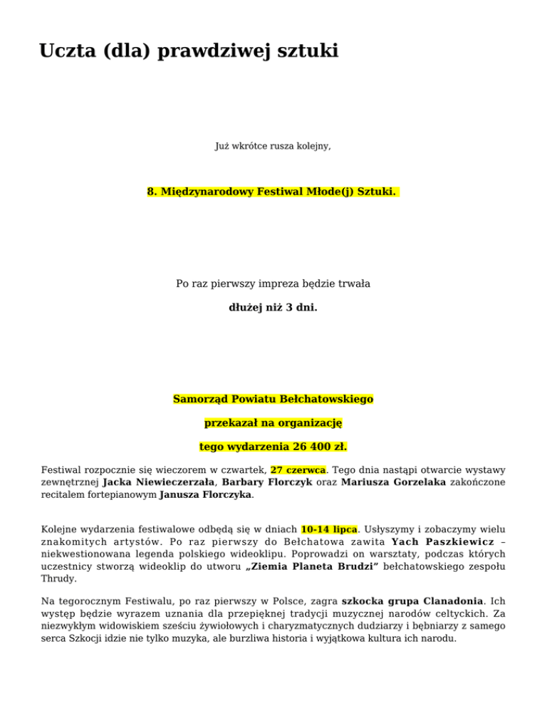 Uczta (dla) prawdziwej sztuki Już wkrótce rusza kolejny, 8. Międzynarodowy Festiwal Młode(j) Sztuki. Po raz pierwszy impreza będzie trwała dłużej niż 3 dni. Samorząd Powiatu Bełchatowskiego przekazał na organizację tego wydarzenia 26 400 zł. Festiwal rozpocznie się wieczorem w czwartek, 27 czerwca. Tego dnia nastąpi otwarcie wystawy zewnętrznej Jacka Niewieczerzała, Barbary Florczyk oraz Mariusza Gorzelaka zakończone recitalem fortepianowym Janusza Florczyka. Kolejne wydarzenia festiwalowe odbędą się w dniach 10-14 lipca. Usłyszymy i zobaczymy wielu znakomitych artystów. Po raz pierwszy do Bełchatowa zawita Yach Paszkiewicz – niekwestionowana legenda polskiego wideoklipu. Poprowadzi on warsztaty, podczas których uczestnicy stworzą wideoklip do utworu „Ziemia Planeta Brudzi” bełchatowskiego zespołu Thrudy. Na tegorocznym Festiwalu, po raz pierwszy w Polsce, zagra szkocka grupa Clanadonia. Ich występ będzie wyrazem uznania dla przepięknej tradycji muzycznej narodów celtyckich. Za niezwykłym widowiskiem sześciu żywiołowych i charyzmatycznych dudziarzy i bębniarzy z samego serca Szkocji idzie nie tylko muzyka, ale burzliwa historia i wyjątkowa kultura ich narodu. Program Festiwalu jest także odzwierciedleniem wielkiego uznania dla kreatywności w sztuce i nowych, niecodziennych formartystycznego wyrazu. Stąd zaproszenie do udziału w projekcie m.in. Adama Bałdycha, prezentującego nowatorskie podejście do improwizacji skrzypcowej, a także nieustannie poszukującego nowych środków wyrazu i ekspresji. Wśród wybitnie zdolnych i nieprzeciętnie kreatywnych festiwalowych artystów nie mogło zabraknąć Bernarda Maselego oraz Ireneusza Głyka z ich nowym projektem na marimbę i wibrafon, a także tworzącego na żywo muzykę do filmów – Marcina Pukaluka. Szczegóły dostępne na stronie Festiwalu oraz na profilu Facebook. Serdecznie zapraszamy. Wydział Promocji i Rozwoju Powiatu Starostwo Powiatowe w Bełchatowie