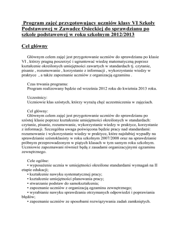 Program zajęć przygotowujący uczniów klasy VI Szkoły Podstawowej w Zawadce Osieckiej do sprawdzianu po szkole podstawowej w roku szkolnym 2012/2013 Cel główny Głównym celem zajęć jest przygotowanie uczniów do sprawdzianu po klasie VI , którzy pragną poszerzyć i ugruntować wiedzę matematyczną poprzez kształcenie określonych umiejętności zawartych w standardach tj. czytanie, pisanie , rozumowanie , korzystanie z informacji , wykorzystanie wiedzy w praktyce , a także zapoznanie uczniów z organizacją egzaminu . Czas trwania programu: Program realizowany będzie od września 2012 roku do kwietnia 2013 roku. Uczestnicy: Uczniowie klas szóstych, którzy wyrażą chęć uczestniczenia w zajęciach. Cel główny: Głównym celem zajęć jest przygotowanie uczniów do sprawdzianu po szóstej klasie poprzez kształcenie umiejętności określonych w standardach: czytanie, pisanie, rozumowanie, wykorzystanie wiedzy w praktyce, korzystanie z informacji. Szczególna uwaga poświęcona będzie pracy nad standardami: rozumowanie i wykorzystanie wiedzy w praktyce, które najsłabiej wypadły na sprawdzianie szóstoklasisty w roku szkolnym 2007/2008 oraz na sprawdzianie próbnym przeprowadzonym w piątych klasach w tym samym roku szkolnym. Uczniowie zapoznawani również będą z zasadami organizacyjnymi egzaminu zewnętrznego. Cele ogólne: • wyposażenie ucznia w umiejętności określone standardami wymagań na II etapie edukacji; • kształcenie nawyku systematycznej pracy; • kształcenie umiejętności planowania pracy; • stwarzanie podstaw do samokształcenia; • zapoznanie uczniów z organizacją egzaminu zewnętrznego; • wyrabianie nawyku sprawdzania otrzymanych odpowiedzi i poprawiania błędów; • zapoznanie uczniów ze sposobami rozwiązywania zadań zamkniętych. Cele dla nauczyciela: • kształcenie umiejętności czytania, pisania, rozumowania, korzystania z informacji oraz wykorzystania wiedzy w praktyce; • dostarczanie wiedzy z różnych źródeł; • uzupełnianie ewentualnych braków w wiedzy i umiejętnościach uczniów; • motywowanie ucznia do systematycznej pracy; • stwarzanie sytuacji sprzyjających właściwemu planowaniu pracy. Cele dla ucznia: • rozwijanie umiejętności czytania, pisania, rozumowania, korzystania z informacji oraz wykorzystania wiedzy w praktyce; • nabywanie wiedzy z różnych źródeł; • wyrabianie nawyku systematycznej pracy; • planowanie swoich działań; • nabywanie wiedzy i umiejętności umożliwiających samokształcenie; • wyrównanie braków w wiadomościach i umiejętnościach; • utrwalenie umiejętności zdobytych na lekcjach; • doskonalenie umiejętności czytania tekstu; • wzbudzanie motywacji do nauki; • rozwijanie umiejętności wykorzystania wiedzy w praktyce poprzez rozwiązywanie prostych zadań z treścią; • odczytywanie informacji z wykresów i diagramów; TREŚCI KSZTAŁCENIA 1. Tworzenie i odczytywanie diagramów, wykresów i tabel. 2. Korzystanie z map i planów. 3. Czytanie tekstu ze zrozumieniem. 4. Praca z tekstem źródłowym i literackim. 5. Rozwiązywanie zadań z treścią. 6. Rozwiązywanie zadań zamkniętych. 7. Korzystanie ze źródeł informacji. 8. Pisanie zaproszenia i ogłoszenia. 9. Pisanie sprawozdania. 10. Określanie wieku wydarzeń i praca z taśmą czasu. 11. Zaznaczanie odpowiedzi w karcie odpowiedzi. 12. Sprawdzanie odpowiedzi i poprawianie błędów. Pomoce dydaktyczne: • karty pracy, • gry dydaktyczne, • modele figur przestrzennych, • przybory kreślarskie, • słowniki i encyklopedie, • Internet, • mapy ścienne i atlasy, • międzyprzedmiotowe arkusze testowe przygotowujące do sprawdzianu uczniów kończących szkołę podstawową, • arkusze egzaminacyjne z lat poprzednich. Metody i formy pracy: • rozwiązywanie zadań testowych, • praca z tekstem, • praca ze słownikami i encyklopedią, • praca z mapą i diagramem, • uzupełnianie kart odpowiedzi, • rozwiązywanie zadań z treścią, • praca z taśmą chronologiczną, Przewidywane osiągnięcia: • umiejętności określone standardami wymagań; • podstawowa wiedza i umiejętności niezbędne w dalszym kształceniu i samokształceniu; • świadomość konieczności planowania działań; • motywacja do nauki; • nawyk systematycznej pracy; • znajomość różnych metod rozwiązywania zadań zamkniętych. Sposoby ewaluacji: • analiza wyników sprawdzianu klas szóstych i porównanie z wynikami z lat poprzednich; • wyniki próbnych sprawdzianów klas szóstych; • opinie uczniów i ankiety. Uwagi o realizacji: Program będzie realizowany w wymiarze 1 godziny tygodniowo w formie zajęć pozalekcyjnych dla uczniów klas szóstych. Na każdych zajęciach dodatkowo uczniowie rozwiązywać będą indywidualnie lub grupowo krótki test, w którym pojawi się kilka zadań zamkniętych i otwartych związanych z omawianym tematem. Uczestniczenie w zajęciach nie jest obowiązkowe. Osoba odpowiedzialna za realizację projektu: Mgr inż. Jacek Zalewski
