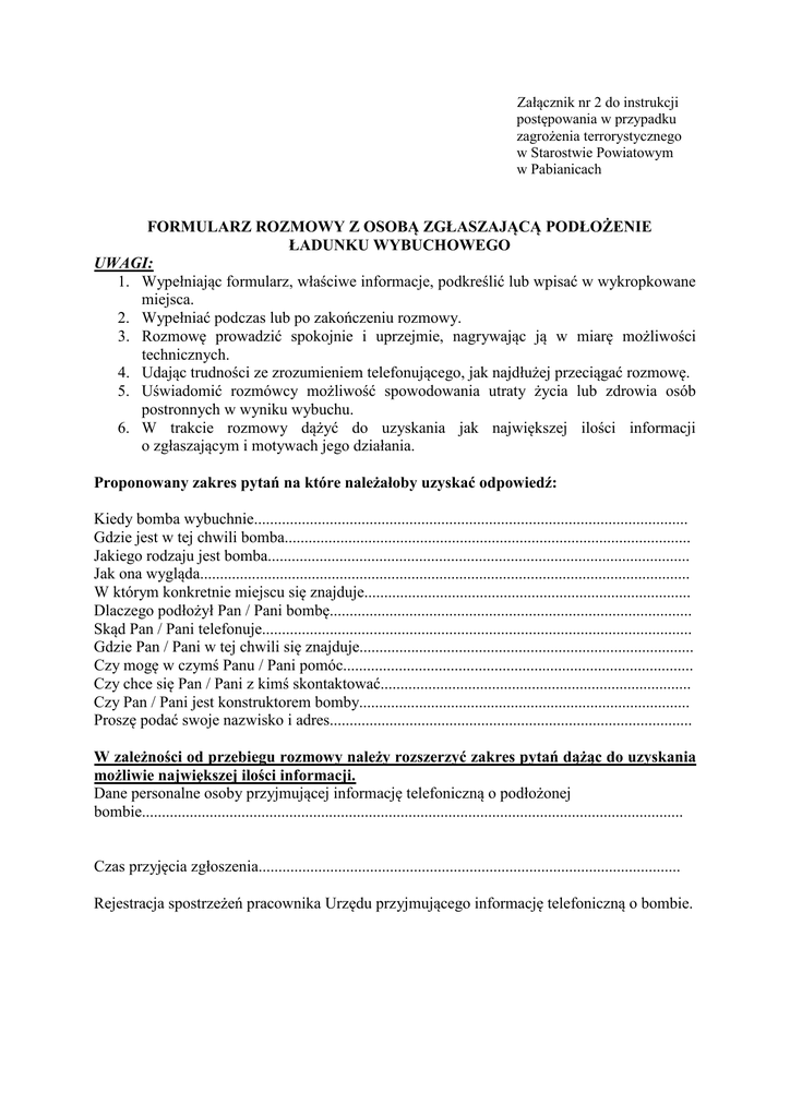 Załącznik nr 2 do instrukcji postępowania w przypadku zagrożenia terrorystycznego w Starostwie Powiatowym w Pabianicach FORMULARZ ROZMOWY Z OSOBĄ ZGŁASZAJĄCĄ PODŁOŻENIE ŁADUNKU WYBUCHOWEGO UWAGI: 1. Wypełniając formularz, właściwe informacje, podkreślić lub wpisać w wykropkowane miejsca. 2. Wypełniać podczas lub po zakończeniu rozmowy. 3. Rozmowę prowadzić spokojnie i uprzejmie, nagrywając ją w miarę możliwości technicznych. 4. Udając trudności ze zrozumieniem telefonującego, jak najdłużej przeciągać rozmowę. 5. Uświadomić rozmówcy możliwość spowodowania utraty życia lub zdrowia osób postronnych w wyniku wybuchu. 6. W trakcie rozmowy dążyć do uzyskania jak największej ilości informacji o zgłaszającym i motywach jego działania. Proponowany zakres pytań na które należałoby uzyskać odpowiedź: Kiedy bomba wybuchnie............................................................................................................. Gdzie jest w tej chwili bomba...................................................................................................... Jakiego rodzaju jest bomba.......................................................................................................... Jak ona wygląda........................................................................................................................... W którym konkretnie miejscu się znajduje.................................................................................. Dlaczego podłożył Pan / Pani bombę........................................................................................... Skąd Pan / Pani telefonuje............................................................................................................ Gdzie Pan / Pani w tej chwili się znajduje.................................................................................... Czy mogę w czymś Panu / Pani pomóc........................................................................................ Czy chce się Pan / Pani z kimś skontaktować.............................................................................. Czy Pan / Pani jest konstruktorem bomby................................................................................... Proszę podać swoje nazwisko i adres........................................................................................... W zależności od przebiegu rozmowy należy rozszerzyć zakres pytań dążąc do uzyskania możliwie największej ilości informacji. Dane personalne osoby przyjmującej informację telefoniczną o podłożonej bombie........................................................................................................................................ Czas przyjęcia zgłoszenia.......................................................................................................... Rejestracja spostrzeżeń pracownika Urzędu przyjmującego informację telefoniczną o bombie. Opis głosu rozmówcy: Z jaką znaną ci osobą utożsamiasz głos rozmówcy...................................................................... Płeć: mężczyzna kobieta dziecko Wiek rozmówcy: młody średni starszy W przybliżeniu lat....................................................................... Akcent – cechy charakterystyczne np. cudzoziemiec, gwara, sztucznie zmieniony itp.................................................................................................................................................. Ton głosu: głośny szybki niski cichy wolny wysoki ciepły jąkający się bełkotliwy chrapliwy zniekształcony sepleniący Charakterystyczna wymowa jakiejś litery.................................................................................... Inny............................................................................................................................................... Inne cechy charakterystyczne głosu.............................................................................................. Dźwięki tła: fabryka ulica biuro dworzec autobusowy cisza dworzec kolejowy klimatyzatory winda głosy ludzkie głosy zwierząt jakie...................................................................... muzyka jakiego rodzaju................................................................ inne............................................................................................... Zachowanie się zgłaszającego: spokojne rozsądne rozgniewane desperackie aroganckie nieracjonalne wesołe inne................................................................................................ Wpisać dokładną treść zgłoszenia................................................................................................. ....................................................................................................................................................... ....................................................................................................................................................... ....................................................................................................................................................... Kogo powiadomiono o zgłoszeniu................................................................................................ ............................................................... data i podpis przyjmującego zgłoszenie