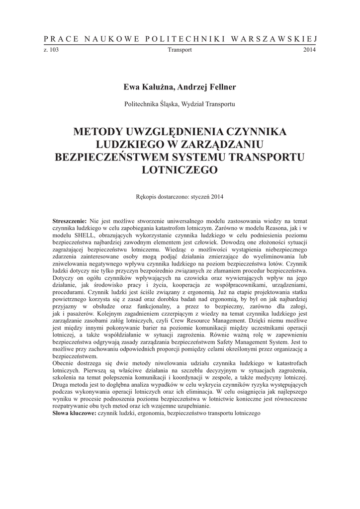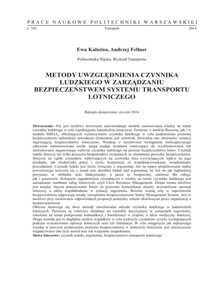 PRACE NAUKOWE POLITECHNIKI WARSZAWSKIEJ z. 103 Transport 2014 Ewa Ka"u#na, Andrzej Fellner Politechnika /l5ska, Wydzia9 Transportu METODY UWZGL)DNIENIA CZYNNIKA LUDZKIEGO W ZARZ*DZANIU BEZPIECZE+STWEM SYSTEMU TRANSPORTU LOTNICZEGO R;kopis dostarczono: stycze= 2014 Streszczenie: Nie jest mo@liwe stworzenie uniwersalnego modelu zastosowania wiedzy na temat czynnika ludzkiego w celu zapobiegania katastrofom lotniczym. Zarówno w modelu Reasona, jak i w modelu SHELL, obrazuj5cych wykorzystanie czynnika ludzkiego w celu podniesienia poziomu bezpiecze=stwa najbardziej zawodnym elementem jest cz9owiek. Dowodz5 one z9o@onoVci sytuacji zagra@aj5cej bezpiecze=stwu lotniczemu. Wiedz5c o mo@liwoVci wyst5pienia niebezpiecznego zdarzenia zainteresowane osoby mog5 podj5X dzia9ania zmierzaj5ce do wyeliminowania lub zniwelowania negatywnego wp9ywu czynnika ludzkiego na poziom bezpiecze=stwa lotów. Czynnik ludzki dotyczy nie tylko przyczyn bezpoVrednio zwi5zanych ze z9amaniem procedur bezpiecze=stwa. Dotyczy on ogó9u czynników wp9ywaj5cych na czowieka oraz wywieraj5cych wp9yw na jego dzia9anie, jak Vrodowisko pracy i @ycia, kooperacja ze wspó9pracownikami, urz5dzeniami, procedurami. Czynnik ludzki jest VciVle zwi5zany z ergonomi5. Ju@ na etapie projektowania statku powietrznego korzysta si; z zasad oraz dorobku bada= nad ergonomi5, by by9 on jak najbardziej przyjazny w obs9udze oraz funkcjonalny, a przez to bezpieczny, zarówno dla za9ogi, jak i pasa@erów. Kolejnym zagadnieniem czzerpi5cym z wiedzy na temat czynnika ludzkiego jest zarz5dzanie zasobami za9óg lotniczych, czyli Crew Resource Management. Dzi;ki niemu mo@liwe jest mi;dzy innymi pokonywanie barier na poziomie komunikacji mi;dzy uczestnikami operacji lotniczej, a tak@e wspó9dzia9anie w sytuacji zagro@enia. Równie wa@n5 rol; w zapewnieniu bezpiecze=stwa odgrywaj5 zasady zarz5dzania bezpiecze=stwem Safety Management System. Jest to mo@liwe przy zachowaniu odpowiednich proporcji pomi;dzy celami okreVlonymi przez organizacj; a bezpiecze=stwem. Obecnie dostrzega si; dwie metody niwelowania udzia9u czynnika ludzkiego w katastrofach lotniczych. Pierwsz5 s5 w9aVciwe dzia9ania na szczeblu decyzyjnym w sytuacjach zagro@enia, szkolenia na temat polepszenia komunikacji i koordynacji w zespole, a tak@e medycyny lotniczej. Druga metoda jest to dog9;bna analiza wypadków w celu wykrycia czynników ryzyka wyst;puj5cych podczas wykonywania operacji lotniczych oraz ich eliminacja. W celu osi5gni;cia jak najlepszego wyniku w procesie podnoszenia poziomu bezpiecze=stwa w lotnictwie konieczne jest równoczesne rozpatrywanie obu tych metod oraz ich wzajemne uzupe9nianie. S"owa kluczowe: czynnik ludzki, ergonomia, bezpiecze=stwo transportu lotniczego 100 Ewa Ka9u@na, Andrzej Fellner 1. GENEZA CZYNNIKA LUDZKIEGO W BEZPIECZE+STWIE SYSTEMU LOTNICZEGO Niezwykle dynamiczny rozwój transportu spowodowa9 jednoczeVnie koniecznoVX zwrócenia wi;kszej uwagi na rol; cz9owieka w tej dziedzinie dzia9alnoVci. W zwi5zku z tym pojawi9o si; ró@nie okreVlane poj;cie czynnika ludzkiego oraz metody jego uwzgl;dnienia, szczególnie w bezpiecze=stwie systemu lotniczego. InterdyscyplinarnoVX tego poj;cia stanowi przeszkod; w jednoznacznym zdefiniowaniu czynnika ludzkiego oraz przyj;cia jednolitego modelu. Niew5tpliw5 przeszkod5 jest przede wszystkim istota natury ludzkiej, stanowi5cej przedmiot bada=. PodkreVliX nale@y, @e poj;cie czynnika ludzkiego wprowadzono po raz pierwszy w dwudziestym wieku, w Stanach Zjednoczonych a istotn5 jest definicja Arthura S. Rebera, @e „Czynniki ludzkie (Humans Factor) to ogólny termin u@ywany najcz;Vciej jako nazwa specjalnoVci zawodowej, która bada relacje cz9owiek-maszyna. Skupia si; ogólnie na problemach postrzegania psychofizyki, podejmowaniu decyzji i innych aspektach przetwarzania informacji. Niekiedy jest u@ywany w odniesieniu do takich elementów (czynników), jak: wyposa@enie, Vrodowisko fizyczne, zadania i osoby, które wykonuj5 prac;”[6]. Uwzgl;dniaj5c powy@sz5 definicj;, zasadne jest stwierdzenie, @e bezpiecze=stwo systemu lotniczego to wypadkowa istotnych podstawowych elementów: stanu technicznego statku powietrznego, sprawnoVci funkcjonowania systemów 95cznoVci, nawigacji i dozorowania, sprawnoVci s9u@b zarz5dzania przestrzeni5 powietrzn5, naziemnego i lataj5cego personelu oraz oddzia9ywania Vrodowiska. Z tego wynika, @e bezpiecze=stwo to zale@y od trzech zasadniczych czynników: ! ludzkiego (cz9owieka) – Humans Factor; ! technicznego; ! Vrodowiska. Z przykroVci5 trzeba stwierdziX, @e do niedawna czynnik ludzki nie by9 w wystarczaj5cy sposób brany pod uwag; podczas badania przyczyn wypadków lotniczych, jako mog5cy doprowadziX do katastrofy. Szkoda, gdy@ niew5tpliwie „Humans Factor” pe9ni wa@n5 rol; w bezpiecze=stwie systemu lotniczego dlatego, @e pod poj;ciem cz9owiek, nale@y rozumieX: odpowiedni poziom wiedzy praktycznej i teoretycznej, znajomoVX statku powietrznego przez za9ogi oraz urz5dze= i systemów przez osoby umo@liwiaj5ce wykonywanie lotów, zgodnie z przepisami i wiedz5 techniczn5 utrzymywanie zdatnoVci technicznej statku powietrznego, odpowiednia logistyka i eksploatacja. Wraz z rozwojem procedur badania wypadków lotniczych zacz;to dostrzegaX koniecznoVX wypracowania ogólnego modelu badania czynnika ludzkiego, który by9by podstaw5 nowoczesnej metodologii bada= wypadków w transporcie lotniczym. W tym celu opracowano system analizowania i klasyfikowania czynnika ludzkiego (HFACS - Human Factor Analysis and Classification System), który s9u@y podczas bada= zdarze= i wypadków lotniczych. Dzi;ki mo@liwoVci wyci5gania ogólniejszych wniosków, a przez to kreowania dzia9a= dorafnych oraz systemowych maj5cych za zadanie zmniejszenie ryzyka zwi5zanego z obecnoVci5 czynnika ludzkiego, system ten stanowi istotne narz;dzie. Metody uwzgl*dnienia czynnika ludzkiego w zarz1dzaniu bezpiecze4stwem systemu … 101 Natomiast z przeprowadzonych analiz przyczyn wypadków lotniczych wynika, =e udzia> czynnika ludzkiego stan