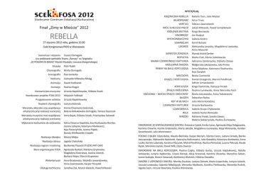 WYSTĘPUJĄ: Finał „Zimy w Mieście” 2012 REBELLA 27 stycznia 2012 roku, godzina 13.00 Sala Kongresowa PKiN w Warszawie Scenariusz i reżyseria Cezary Domagała (na podstawie spektaklu Teatru „Rampa” na Targówku „W POGONI ZA BAJKĄ” Moniki Muskały i Janusza Margańskiego) Muzyka Piotr Rubik Choreografia Scenografia Kostiumy Animacja Dawid Kozłowski Ilustracje Paulina Mager Kierownictwo muzyczne Marta Domagała Ewa Łaniecka Gabryella Miłowska-Moląg Urszula Napiórkowska, Elżbieta Siczek Koordynator projektu FOSA 2012 Wojciech Feliksiak Przygotowanie solistów Urszula Napiórkowska Asystent choreografa Justyna Kolenda Warsztaty aktorskie oraz współpraca artystyczna przy realizacji scenicznej Hanna Chojnacka-Gościniak, Bożena Robakowska-Domagała, Tomasz Daszczuk Warsztaty muzyczne oraz współpraca artystyczna przy realizacji scenicznej Anna Bajak, Elżbieta Siczek, Przemysław Zalewski Wykonanie kostiumów do widowiska Kalina Downar-Zapolska, Ewa Kunkowska-Dembe, Joanna Łabęcka, Katarzyna Markiewicz, Kaja Piaszczyńska, Joanna Piątek, Dorota Wielkosielec-Ciapało Realizacja dźwięku Maciej Wełpa Realizacja obrazu Jagoda Chalcińska Realizacja nagrań i mastering Bartłomiej Piasecki STUDIO ART CAFE Biuro organizacyjne FOSA Agnieszka Budzyń, Martyna Gryżewska, Magdalena Kostrzewa, Joanna Liberek, Barbara Wajer, Marcin Krupowicz Wolontariusze Anna Brodowska, Wioletta Lewandowska, Anna Zawistowska, Kacper Poszytek Jarosław Żak, Marcin Bielecki, Paweł Wilewski Obsługa techniczna KSIĘŻNICZKA REBELLA BAJKOPISARZ WIRTUO KRÓL SUKCESSO PAŁER KRÓLOWA BIUTINA SINOBRODY WYCHOWAWCZYNI SZAMBELAN LEKARZE MINISTER ZDROWIA ROPUCHA MAMA CZERWONEGO KAPTURKA KRÓLEWNA ŚNIEŻKA PANNY NA BALU KOPCIUSZKA MACOCHA KSIĄŻĘ Z KOPCIUSZKA KOPCIUSZEK ŚPIĄCA KRÓLEWNA KRÓLOWA – MATKA ŚPIĄCEJ KRÓLEWNY BŁAZEN KOT W BUTACH CZERWONY KAPTUREK CZAROWNICA WILK WRÓŻKI Natalia Tsen, Julia Wojtaś Artur Truss Tobiasz Zawistowski Jakub Milewski, Paweł Szmytkowski Kinga Borowska Jan Budzyń Izabela Kostro Kamil Bukato Aleksandra Lasocka, Magdalena Lepionka, Anna Mazurek Wanda Astrid Gerlee Marta Ciak, Marta Sobolewska Adrianna Zembrzycka, Elżbieta Żóraw Małgorzata Jakubowska, Julia Protas Anna Majdura, Katarzyna Stachurska, Ewa Świątek Beata Czarnecka Daniel Grzegorek, Marcin Parafiniuk, Adrian Umiastowski Kinga Dymińska, Patrycja Postek Paulina Łuniewska, Anna Weronika Pych Maria Janczewska, Anna Tułodziecka Sebastian Raźny Julia Maria Kołodziej Urszula Borkowska Izabela Stupa-Chybowska Izabela Hurko-Romeyko Adrianna Frelak, Sandra Gawor, Waleria Siekierzyńska, Paulina Żuchowska DWORZANIE ZE WSPÓŁCZESNEGO DWORU: Antonina Cydzik, Emilia Cyran, Agnieszka Maja Dołęgowska, Karolina Drewnik, Kamila Grabowska, Marta Jakubik, Magdalena Łuniewska, Maja Mirkowska, Kordian Szczerbowski, Julia Woronowicz POSTACI Z BAJEK: Edyta Bełza, Klaudia Bielińska, Kacper Borzym, Dorota Facon, Justyna Gniady, Blanka Januszewska, Aleksandra Kędziorek, Katarzyna Kołtunowicz, Julia Kowalska, Katarzyna Kozłowska, Anna Laufer, Kamila Lubańska, Karolina Mazurek, Michał Parafiniuk, Paulina Pietrasiak, Lucyna Pietrzak, Nicole Ryżak, Weronika Sajnak, Paweł Wilk, Edyta Zawisza DWORZANIE NA BALU KOPCIUSZKA: Paulina Czajka, Elżbieta Gurba, Urszula Hajdukiewicz, Natalia Jankowska, Justyna Kędzierska, Cezary Kierzyk, Alicja Krzesniak, Karolina Olszanka, Marcelina Salwin, Iwona Szałajda, Marcin Szewczak, Bartłomiej Woźnicki, Elżbieta Zawadka DWÓRKI Z UŚPIONEGO DWORU: Monika Daukszo, Justyna Dziewit, Marta Łopacińska, Justyna Łukasik, Urszula Łuniewska, Gabriela Mikołajczyk, Weronika Myśliwiec, Karolina Pieńkowska, Weronika Rudnik, Jagoda Sasin, Urszula Sławińska, Paulina Wiśniewska Organizator: Scenariusz i reżyseria: Cezary Domagała Na podstawie spektaklu Teatru „Rampa” na Targówku „W POGONI ZA BAJKĄ” Moniki Muskały i Janusza Margańskiego z muzyką Piotra Rubika Wykonawcy: uczestnicy warsztatów Feryjnych Otwartych Spotkań Artystycznych SCEK Dyrektor: Wojciech Feliksiak Wicedyrektor: Gabryella Miłowska-Moląg ZIMA W MIEŚCIE FINAŁ Sala Kongresowa 27.01.2012 godz. 13.00 Realizacja widowiska sfinansowana przez Miasto Stołeczne Warszawa. Dziękujemy Stołecznej Estradzie, Teatrowi Rampa na Targówku i Staromiejskiemu Domowi Kultury za pomoc w realizacji widowiska. Partnerzy: Stołeczne Centrum Edukacji Kulturalnej, Warszawa, Stare Miasto, ul. Jezuicka 4, tel.: 22 831 53 93, fax: 22 831 33 35, e-mail: [email protected], www.scek.pl Organizator: Scenariusz i reżyseria: Cezary Domagała Na podstawie spektaklu Teatru „Rampa” na Targówku „W POGONI ZA BAJKĄ” Moniki Muskały i Janusza Margańskiego z muzyką Piotra Rubika Wykonawcy: uczestnicy warsztatów Feryjnych Otwartych Spotkań Artystycznych SCEK Dyrektor: Wojciech Feliksiak Wicedyrektor: Gabryella Miłowska-Moląg ZIMA W MIEŚCIE FINAŁ Sala Kongresowa 27.01.2012 godz. 13.00 Realizacja widowiska sfinansowana przez Miasto Stołeczne Warszawa. Dziękujemy Stołecznej Estradzie, Teatrowi Rampa na Targówku i Staromiejskiemu Domowi Kultury za pomoc w realizacji widowiska. Partnerzy: Stołeczne Centrum Edukacji Kulturalnej, Warszawa, Stare Miasto, ul. Jezuicka 4, tel.: 22 831 53 93, fax: 22 831 33 35, e-mail: [email protected], www.scek.pl