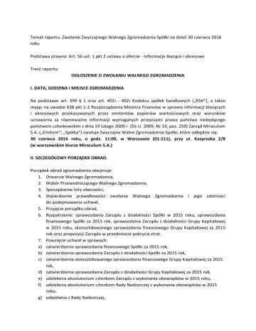 Temat raportu: Zwołanie Zwyczajnego Walnego Zgromadzenia Spółki na dzień 30 czerwca 2016 roku Podstawa prawna: Art. 56 ust. 1 pkt 2 ustawy o ofercie - informacje bieżące i okresowe Treść raportu: OGŁOSZENIE O ZWOŁANIU WALNEGO ZGROMADZENIA I. DATA, GODZINA I MIEJSCE ZGROMADZENIA Na podstawie art. 399 § 1 oraz art. 4021 - 4022 Kodeksu spółek handlowych („KSH“), a także mając na uwadze §38 pkt 1-2 Rozporządzenia Ministra Finansów w sprawie informacji bieżących i okresowych przekazywanych przez emitentów papierów wartościowych oraz warunków uznawania za równoważne informacji wymaganych przepisami prawa państwa niebędącego państwem członkowskim z dnia 19 lutego 2009 r. (Dz.U. 2009, Nr 33, poz. 259) Zarząd Miraculum S.A. („Emitent“; „Spółka“) zwołuje Zwyczajne Walne Zgromadzenie Spółki, które odbędzie się: 30 czerwca 2016 roku, o godz. 11:00, w Warszawie (01-211), przy ul. Kasprzaka 2/8 (w warszawskim biurze Miraculum S.A.) II. SZCZEGÓŁOWY PORZĄDEK OBRAD. Porządek obrad zgromadzenia obejmuje: 1. Otwarcie Walnego Zgromadzenia, 2. Wybór Przewodniczącego Walnego Zgromadzenia, 3. Sporządzenie listy obecności, 4. Stwierdzenie prawidłowości zwołania Walnego Zgromadzenia i jego zdolności do podejmowania uchwał, 5. Przyjęcie porządku obrad, 6. Rozpatrzenie: sprawozdania Zarządu z działalności Spółki w 2015 roku, sprawozdania finansowego Spółki za 2015 rok, sprawozdania Zarządu z działalności Grupy Kapitałowej w 2015 roku, skonsolidowanego sprawozdania finansowego Grupy Kapitałowej za 2015 rok oraz propozycji Zarządu w przedmiocie pokrycia strat. 7. Powzięcie uchwał w sprawach: a) zatwierdzenia sprawozdania finansowego Spółki za 2015 rok, b) zatwierdzenia sprawozdania Zarządu z działalności Spółki za 2015 rok, c) zatwierdzenia skonsolidowanego sprawozdania finansowego Grupy Kapitałowej za 2015 rok, d) zatwierdzenia sprawozdania Zarządu z działalności Grupy Kapitałowej za 2015 rok, e) udzielenia absolutorium członkom Zarządu z wykonania obowiązków w 2015 roku, f) udzielenia absolutorium członkom Rady Nadzorczej z wykonania obowiązków w 2015 roku, g) odwołania z Rady Nadzorczej, h) i) j) k) l) powołania do Rady Nadzorczej, sposobu pokrycia straty za rok obrotowy 2015, zmiany Statutu Spółki, upoważnienia Rady Nadzorczej do ustalenia tekstu jednolitego Statutu Spółki, uchylenia dotychczasowego i przyjęcia w to miejsce nowego Regulaminu Walnego Zgromadzenia. III. Precyzyjny opis procedur dotyczących uczestnictwa w Zwyczajnym Walnym Zgromadzeniu Spółki zwołanym na dzień 30 czerwca 2016 roku i wykonywania prawa głosu. 1. Prawo akcjonariusza do żądania umieszczenia określonych spraw w porządku obrad Zwyczajnego Walnego Zgromadzenia Spółki. Zgodnie z treścią przepisu art. 401 § 1 Ksh, akcjonariusz lub akcjonariusze reprezentujący co najmniej jedną dwudziestą kapitału zakładowego mogą żądać umieszczenia określonych spraw w porządku obrad walnego zgromadzenia. Żądanie powinno zostać zgłoszone zarządowi nie później niż na dwadzieścia jeden dni przed wyznaczonym terminem zgromadzenia. Żądanie powinno zawierać uzasadnienie lub projekt uchwały dotyczącej proponowanego punktu porządku obrad. Żądanie może zostać złożone w postaci elektronicznej. Wobec powyższego, żądanie wraz z uzasadnieniem lub projektem uchwały dotyczącej proponowanego punktu porządku obrad, może zostać złożone na piśmie w siedzibie Spółki przy ul. Prof. Michała Bobrzyńskiego 14, 30 – 348 Kraków, albo dostarczone w postaci elektronicznej, w formacie PDF, na adres poczty elektronicznej e – mail: [email protected], nie później niż na 21 dni przed wyznaczonym terminem zgromadzenia, tj. nie później niż do dnia 9 czerwca 2016 roku. Każdy akcjonariusz lub akcjonariusze zobowiązany jest dołączyć do przedmiotowego żądania dokumenty pozwalające na jego identyfikację oraz potwierdzające prawo do zgłoszenia rzeczonego żądania. Dokumentem identyfikacyjnym może być w szczególności kopia dowodu osobistego albo paszportu potwierdzona za zgodność z oryginałem przez podmiot uprawniony zgodnie z powszechnie obowiązującymi przepisami prawa, a w przypadku podmiotów wpisanych do odpowiedniego rejestru, aktualny odpis z właściwego rejestru. Dokumentem potwierdzającym prawo do zgłoszenia może być w szczególności, w przypadku zdematerializowanych akcji na okaziciela, oryginał albo kopia imiennego zaświadczenia o prawie uczestnictwa w Zwyczajnym Walnym Zgromadzeniu Spółki albo oryginał albo kopia odpowiedniego imiennego świadectwa depozytowego (przy czym kopie powinny być potwierdzone za zgodność z oryginałem przez podmiot uprawniony zgodnie z powszechnie obowiązującymi przepisami prawa). Zarząd Spółki niezwłocznie, jednak nie później niż na osiemnaście dni przed wyznaczonym terminem Zwyczajnego Walnego Zgromadzenia, tj. nie później niż 12 czerwca 2016 roku, ogłosi zmiany w porządku obrad, wprowadzone na żądanie akcjonariusza lub akcjonariuszy. Ogłoszenie nastąpi w sposób właściwy dla zwołania Zwyczajnego Walnego Zgromadzenia Spółki. 2. Prawo akcjonariusza do zgłaszania projektów uchwał dotyczących spraw wprowadzonych do porządku obrad lub spraw, które mają zostać wprowadzone do porządku obrad przed terminem Zwyczajnego Walnego Zgromadzenia Spółki. Zgodnie z przepisem art. 401 § 4 Ksh, akcjonariusz lub akcjonariusze Spółki reprezentujący co najmniej jedną dwudziestą kapitału zakładowego mogą przed terminem walnego zgromadzenia zgłaszać spółce na piśmie lub przy wykorzystaniu środków komunikacji elektronicznej projekty uchwał dotyczące spraw wprowadzonych do porządku obrad walnego zgromadzenia lub spraw, które mają zostać wprowadzone do porządku obrad. Spółka niezwłocznie ogłasza projekty uchwał na stronie internetowej. Wobec powyższego projekty uchwał mogą zostać złożone, z uwagi na koni