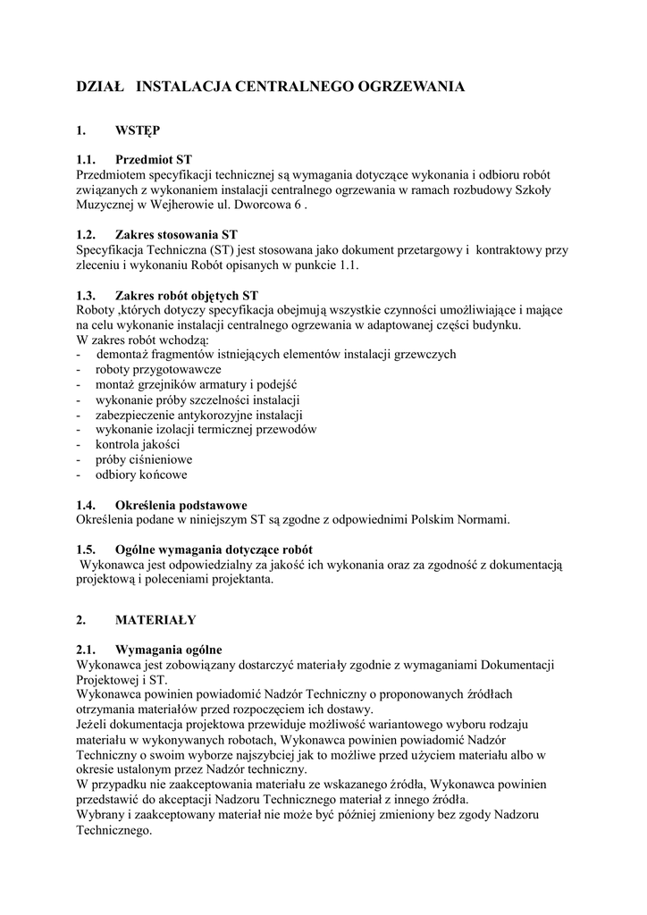 DZIAŁ INSTALACJA CENTRALNEGO OGRZEWANIA 1. WSTĘP 1.1. Przedmiot ST Przedmiotem specyfikacji technicznej sąwymagania dotyczące wykonania i odbioru robót zwią zanych z wykonaniem instalacji centralnego ogrzewania w ramach rozbudowy Szkoł y Muzycznej w Wejherowie ul. Dworcowa 6 . 1.2. Zakres stosowania ST Specyfikacja Techniczna (ST) jest stosowana jako dokument przetargowy i kontraktowy przy zleceniu i wykonaniu Robót opisanych w punkcie 1.1. 1.3. Zakres robót objętych ST Roboty ,których dotyczy specyfikacja obejmująwszystkie czynnoś ci umoż liwiające i mające na celu wykonanie instalacji centralnego ogrzewania w adaptowanej czę ś ci budynku. W zakres robót wchodzą : - demontażfragmentów istniejących elementów instalacji grzewczych - roboty przygotowawcze - montażgrzejników armatury i podejś ć - wykonanie próby szczelnoś ci instalacji - zabezpieczenie antykorozyjne instalacji - wykonanie izolacji termicznej przewodów - kontrola jakoś ci - próby ciś nieniowe - odbiory końcowe 1.4. Okreś lenia podstawowe Okreś lenia podane w niniejszym ST sązgodne z odpowiednimi Polskim Normami. 1.5. Ogólne wymagania dotyczące robót Wykonawca jest odpowiedzialny za jakoś ćich wykonania oraz za zgodnoś ćz dokumentacją projektowąi poleceniami projektanta. 2. MATERIAŁY 2.1. Wymagania ogólne Wykonawca jest zobowiązany dostarczyćmateriał y zgodnie z wymaganiami Dokumentacji Projektowej i ST. Wykonawca powinien powiadomićNadzór Techniczny o proponowanych ź ródł ach otrzymania materiał ów przed rozpoczę ciem ich dostawy. Jeżeli dokumentacja projektowa przewiduje moż liwoś ćwariantowego wyboru rodzaju materiał u w wykonywanych robotach, Wykonawca powinien powiadomićNadzór Techniczny o swoim wyborze najszybciej jak to moż liwe przed uż yciem materiał u albo w okresie ustalonym przez Nadzór techniczny. W przypadku nie zaakceptowania materiał u ze wskazanego źródł a, Wykonawca powinien przedstawićdo akceptacji Nadzoru Technicznego materiałz innego ź ródł a. Wybrany i zaakceptowany materiałnie może byćpóź niej zmieniony bez zgody Nadzoru Technicznego. Każdy rodzaj robót , w którym znajdująsięniezbadane i nie zaakceptowane materiał y, wykonawca wykonuje na wł asne ryzyko, licząc sięz jego nie przyjęciem i niezapł aceniem za wykonanie pracy. 2.2 Materiał y dotyczące instalacji c.o. 2.2.1 Rury Rury stalowe instalacyjne czarne ze szwem wg normy PN-80/H-74200, dn15 wraz z kształ tkami, poł ą czenia spawane. 2.2.2 Armatura Zawory grzejnikowe termostatyczne proste typ A DN15 z termostatami Uni XH prod. Oventrop Zawory powrotne Combi-4 prod. Ovenrtrop 2.2.3 Urządzenia Grzejniki stalowe dwu- i trzypł ytowe z konwektorami z podł ą czeniem bocznym typu CosmoNova prod. VNH 2.2.4 Izolacje termiczne Otuliny z pianki PE 2.3 Skł adowanie materiał ów Grzejniki, rury, materiał y izolacyjne, armaturęnależ y skł adowaćw magazynie zamknię tym. 2.4 Odbiór materiał ów na budowie Materiał y należ y dostarczaćna budowęwraz ze ś wiadectwami jakoś ci, kartami gwarancyjnymi i protokoł ami odbioru technicznego. Dostarczone materiał y na miejsce budowy należy sprawdzićpod wzglę dem kompletnoś ci i zgodnoś ci z danymi producenta. Należ y przeprowadzićoględziny dostarczonych materiał ów. W razie stwierdzenia wad lub powstania wą tpliwoś ci co do ich jakoś ci , przed wbudowaniem należy poddaćbadaniom okreś lonym przez Nadzór Techniczny. 3. SPRZĘT 3.1. Ogólne wymagania dotyczące stosowanych urządzeń Ogólne wymagania dotyczą ce sprzę tu podano w ST DziałB-00 „Wymagania Ogólne pkt. 3. 3.2. Stosowany sprzęt - pił y elektryczne do cięcia rur - agregaty spawalnicze gazowe - gwintownice do rur - gię tarki do gię cia rur 4. TRANSPORT 4.1. Wymagania ogólne Ogólne wymagania dotyczą ce transportu podano w ST DziałB-00 „Wymagania Ogólne” pkt. 5. 4.2. Transport materiał ów i elementów Przewiduje sięprzewóz materiał ów i elementów od producenta na plac budowy. Materiał y mogąbyćprzewoż one dowolnymi ś rodkami transportu , rozmieszczone równomiernie na cał ej powierzchni ł adunku i zabezpieczone przed spadaniem lub przesuwaniem. 5.0 WYKONYWANIE ROBÓT Wykonawca przedstawi do akceptacji projekt organizacji i harmonogram robót uwzglę dniają cy wszystkie warunki w jakich będąwykonywane roboty zwią zane z wykonawstwem instalacji centralnego ogrzewania w budynku. Roboty instalacji należy wykonywaćzgodnie z :warunkami technicznymi wykonania robót budowlano-montaż owych” cz.II – Instalacje sanitarne. 5.1 Demontażistniejących instalacji grzewczych - zdemontowanie istnieją cych przewodów grzewczych , grzejników oraz innych urzą dzeńzwiązanych z instalacjami grzewczymi - wywóz zdemontowanych elementów instalacji grzewczych - utylizacja zdemontowanych elementów instalacji grzewczej 5.2 Roboty przygotowawcze - wytyczenie tras prowadzenia przewodów - wyznaczenie miejsc montaż u grzejników 5.3 Roboty montażowe instalacji grzewczych Instalacje wody grzewczej wykonaćz rur czarnych ze szwem PN-80/H-74200 ł ą czonych przez spawanie. 5.3.1 Łą czenie rurociągów Spawanie rurocią gów i badanie zł ą czy spawanych należy wykonaćzgodnie z PN-92/M34031. Klasęwadliwoś ci zł ą cza przyję to R4 wg PN-92/M-34031. Spawanie i szczepianie rurociągów mogąwykonywaćtylko spawacze z odpowiednimi aktualnymi kwalifikacjami i uprawnieniami dozoru technicznego, stosownie do zakresu wykonywanej pracy. Poł ączenia spawane rurociągów wykonywaćdoczoł owo. Rowki do spawania przygotować zgodnie z PN-69/M-69019. Wszystkie zł ą cza spawane należy wykonywaćś ciś le wg opracowanej przez wykonawcę technologii, która powinna zawierać : ogólne zasady organizacji robót, wymagania dotyczą ce przygotowania zł ą cza do spawania, wymagania dotyczą ce przygotowania miejsca pracy, karty technologiczne spawania i obróbki cieplnej. Temperatura otoczenia w czasie spawania nie 