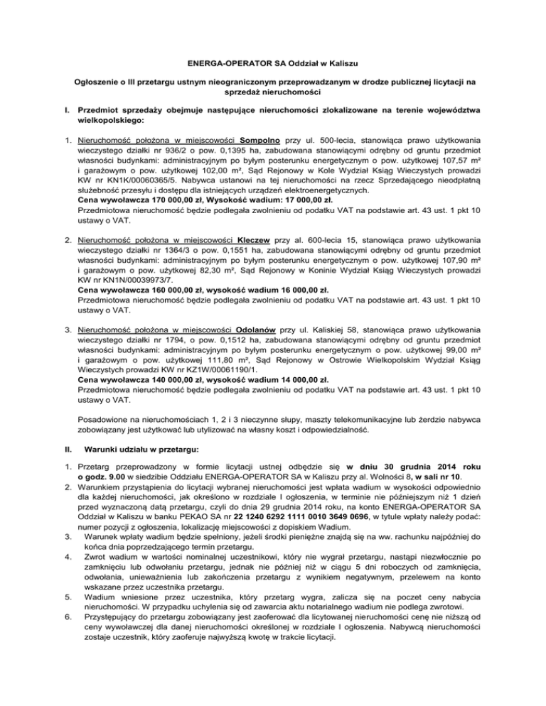 ENERGA-OPERATOR SA Oddział w Kaliszu Ogłoszenie o III przetargu ustnym nieograniczonym przeprowadzanym w drodze publicznej licytacji na sprzedaż nieruchomości I. Przedmiot sprzedaży obejmuje następujące nieruchomości zlokalizowane na terenie województwa wielkopolskiego: 1. Nieruchomość położona w miejscowości Sompolno przy ul. 500-lecia, stanowiąca prawo użytkowania wieczystego działki nr 936/2 o pow. 0,1395 ha, zabudowana stanowiącymi odrębny od gruntu przedmiot własności budynkami: administracyjnym po byłym posterunku energetycznym o pow. użytkowej 107,57 m² i garażowym o pow. użytkowej 102,00 m², Sąd Rejonowy w Kole Wydział Ksiąg Wieczystych prowadzi KW nr KN1K/00060365/5. Nabywca ustanowi na tej nieruchomości na rzecz Sprzedającego nieodpłatną służebność przesyłu i dostępu dla istniejących urządzeń elektroenergetycznych. Cena wywoławcza 170 000,00 zł, Wysokość wadium: 17 000,00 zł. Przedmiotowa nieruchomość będzie podlegała zwolnieniu od podatku VAT na podstawie art. 43 ust. 1 pkt 10 ustawy o VAT. 2. Nieruchomość położona w miejscowości Kleczew przy al. 600-lecia 15, stanowiąca prawo użytkowania wieczystego działki nr 1364/3 o pow. 0,1551 ha, zabudowana stanowiącymi odrębny od gruntu przedmiot własności budynkami: administracyjnym po byłym posterunku energetycznym o pow. użytkowej 107,90 m² i garażowym o pow. użytkowej 82,30 m², Sąd Rejonowy w Koninie Wydział Ksiąg Wieczystych prowadzi KW nr KN1N/00039973/7. Cena wywoławcza 160 000,00 zł, wysokość wadium 16 000,00 zł. Przedmiotowa nieruchomość będzie podlegała zwolnieniu od podatku VAT na podstawie art. 43 ust. 1 pkt 10 ustawy o VAT. 3. Nieruchomość położona w miejscowości Odolanów przy ul. Kaliskiej 58, stanowiąca prawo użytkowania wieczystego działki nr 1794, o pow. 0,1512 ha, zabudowana stanowiącymi odrębny od gruntu przedmiot własności budynkami: administracyjnym po byłym posterunku energetycznym o pow. użytkowej 99,00 m² i garażowym o pow. użytkowej 111,80 m², Sąd Rejonowy w Ostrowie Wielkopolskim Wydział Ksiąg Wieczystych prowadzi KW nr KZ1W/00061190/1. Cena wywoławcza 140 000,00 zł, wysokość wadium 14 000,00 zł. Przedmiotowa nieruchomość będzie podlegała zwolnieniu od podatku VAT na podstawie art. 43 ust. 1 pkt 10 ustawy o VAT. Posadowione na nieruchomościach 1, 2 i 3 nieczynne słupy, maszty telekomunikacyjne lub żerdzie nabywca zobowiązany jest użytkować lub utylizować na własny koszt i odpowiedzialność. II. Warunki udziału w przetargu: 1. Przetarg przeprowadzony w formie licytacji ustnej odbędzie się w dniu 30 grudnia 2014 roku o godz. 9.00 w siedzibie Oddziału ENERGA-OPERATOR SA w Kaliszu przy al. Wolności 8, w sali nr 10. 2. Warunkiem przystąpienia do licytacji wybranej nieruchomości jest wpłata wadium w wysokości odpowiednio dla każdej nieruchomości, jak określono w rozdziale I ogłoszenia, w terminie nie późniejszym niż 1 dzień przed wyznaczoną datą przetargu, czyli do dnia 29 grudnia 2014 roku, na konto ENERGA-OPERATOR SA Oddział w Kaliszu w banku PEKAO SA nr 22 1240 6292 1111 0010 3649 0696, w tytule wpłaty należy podać: numer pozycji z ogłoszenia, lokalizację miejscowości z dopiskiem Wadium. 3. Warunek wpłaty wadium będzie spełniony, jeżeli środki pieniężne znajdą się na ww. rachunku najpóźniej do końca dnia poprzedzającego termin przetargu. 4. Zwrot wadium w wartości nominalnej uczestnikowi, który nie wygrał przetargu, nastąpi niezwłocznie po zamknięciu lub odwołaniu przetargu, jednak nie później niż w ciągu 5 dni roboczych od zamknięcia, odwołania, unieważnienia lub zakończenia przetargu z wynikiem negatywnym, przelewem na konto wskazane przez uczestnika przetargu. 5. Wadium wniesione przez uczestnika, który przetarg wygra, zalicza się na poczet ceny nabycia nieruchomości. W przypadku uchylenia się od zawarcia aktu notarialnego wadium nie podlega zwrotowi. 6. Przystępujący do przetargu zobowiązany jest zaoferować dla licytowanej nieruchomości cenę nie niższą od ceny wywoławczej dla danej nieruchomości określonej w rozdziale I ogłoszenia. Nabywcą nieruchomości zostaje uczestnik, który zaoferuje najwyższą kwotę w trakcie licytacji. 7. 8. Minimalne postąpienie dla każdej nieruchomości wynosi 1 % ceny wywoławczej lub wielokrotność tej kwoty. Oferenci przystępujący do przetargu zobowiązani są do przedłożenia Komisji przetargowej przed rozpoczęciem przetargu oryginału dowodu wpłacenia wadium oraz: - w przypadku osób fizycznych dokumentu potwierdzającego tożsamość, a będących w związku małżeńskim również obowiązani są wskazać, czy występują w imieniu własnym, czy zamierzają nabyć nieruchomość w imieniu swoim czy i małżonka na majątek wspólny i wówczas obowiązani są przedstawić zgodę drugiego małżonka na zakup nieruchomości, bądź umowę o rozdzielności majątkowej. Osoba obca działająca w imieniu oferenta obowiązana jest przedłożyć oryginał stosownego pełnomocnictwa. - w przypadku podmiotów gospodarczych i jednostek organizacyjnych aktualnego odpisu z KRS lub wypisu z ewidencji działalności gospodarczej, zaświadczenia o numerze REGON, decyzji o nadaniu NIP, stosownych dokumentów potwierdzających tożsamość i upoważnienie do reprezentacji uczestnika przetargu. - dokumentu potwierdzającego uzyskanie stosownej zgody na dokonanie określonej czynności prawnej, jeżeli przepisy prawa, statut, umowa spółki, akt założycielski przedsiębiorcy wymaga uzyskania zgody właściwego organu. 9. Przetarg jest ważny bez względu na ilość uczestników, jeśli przynajmniej jeden uczestnik zaoferuje cenę wywoławczą. 10. Nabywca zobowiązany jest do wpłacenia całości ceny nabycia nieruchomości na konto Sprzedającego najpóźniej na 1 dzień przed planowaną datą zawarcia umowy w formie aktu notarialnego. 11. Nieprzystąpienie osoby wyłonionej jako nabywca nieruc