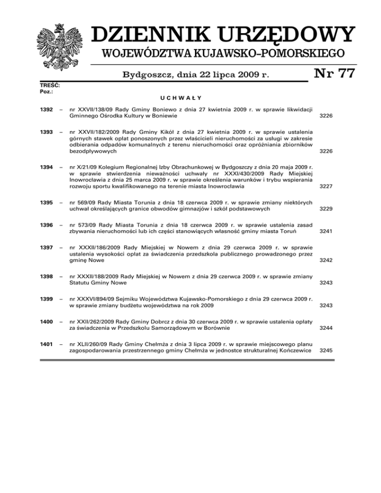 DZIENNIK URZĘDOWY WOJEWÓDZTWA KUJAWSKO-POMORSKIEGO Bydgoszcz, dnia 22 lipca 2009 r. Nr 77 TREŚĆ: Poz.: UCHWAŁY 1392 1393 1394 1395 1396 1397 1398 – – – – – – – nr XXVII/138/09 Rady Gminy Boniewo z dnia 27 kwietnia 2009 r. w sprawie likwidacji Gminnego Ośrodka Kultury w Boniewie 3226 nr XXVII/182/2009 Rady Gminy Kikół z dnia 27 kwietnia 2009 r. w sprawie ustalenia górnych stawek opłat ponoszonych przez właścicieli nieruchomości za usługi w zakresie odbierania odpadów komunalnych z terenu nieruchomości oraz opróżniania zbiorników bezodpływowych 3226 nr X/21/09 Kolegium Regionalnej Izby Obrachunkowej w Bydgoszczy z dnia 20 maja 2009 r. w sprawie stwierdzenia nieważności uchwały nr XXXI/430/2009 Rady Miejskiej Inowrocławia z dnia 25 marca 2009 r. w sprawie określenia warunków i trybu wspierania rozwoju sportu kwalifikowanego na terenie miasta Inowrocławia 3227 nr 569/09 Rady Miasta Torunia z dnia 18 czerwca 2009 r. w sprawie zmiany niektórych uchwał określających granice obwodów gimnazjów i szkół podstawowych 3229 nr 573/09 Rady Miasta Torunia z dnia 18 czerwca 2009 r. w sprawie ustalenia zasad zbywania nieruchomości lub ich części stanowiących własność gminy miasta Toruń 3241 nr XXXII/186/2009 Rady Miejskiej w Nowem z dnia 29 czerwca 2009 r. w sprawie ustalenia wysokości opłat za świadczenia przedszkola publicznego prowadzonego przez gminę Nowe 3242 nr XXXII/188/2009 Rady Miejskiej w Nowem z dnia 29 czerwca 2009 r. w sprawie zmiany Statutu Gminy Nowe 3243 1399 – nr XXXVI/894/09 Sejmiku Województwa Kujawsko-Pomorskiego z dnia 29 czerwca 2009 r. w sprawie zmiany budżetu województwa na rok 2009 3243 1400 – nr XXII/262/2009 Rady Gminy Dobrcz z dnia 30 czerwca 2009 r. w sprawie ustalenia opłaty za świadczenia w Przedszkolu Samorządowym w Borównie 3244 nr XLII/260/09 Rady Gminy Chełmża z dnia 3 lipca 2009 r. w sprawie miejscowego planu zagospodarowania przestrzennego gminy Chełmża w jednostce strukturalnej Kończewice 3245 1401 – Dziennik Urzędowy Województwa Kujawsko-Pomorskiego Nr 77 – 3226 – Poz. 1392, 1393 1392 1392 UCHWAŁA Nr XXVII/138/09 RADY GMINY BONIEWO z dnia 27 kwietnia 2009 r. w sprawie likwidacji Gminnego Ośrodka Kultury w Boniewie. § 2. Czynności likwidacyjne obejmują przede wszystkim zarchiwizowanie akt i dokumentów oraz przekazanie ich do archiwum zakładowego Urzędu Gminy, sporządzenie protokołów stanu majątku, zagospodarowanie majątku Ośrodka zgodnie z niniejszą uchwałą. Na podstawie art. 18 ust. 2 pkt 9 lit. h ustawy z dnia 8 marca 1990 r. o samorządzie gminnym (Dz.U. z 2001 r. Nr 142, poz. 1591, z 2002 r. Nr 23, poz. 220, Nr 62, poz. 558, Nr 113, poz. 984, Nr 153, poz. 1271 i Nr 214, poz. 1806, z 2003 r. Nr 80, poz. 717 i Nr 162, poz. 1568, z 2004 r. Nr 102, poz. 1055, Nr 116, poz. 1203, z 2005 r. Nr 172, poz. 1441 i Nr 175, poz. 1457, z 2006 r. Nr 17, poz. 128, Nr 181, poz. 1337, z 2007 r. Nr 48, poz. 327, Nr 138, poz. 974 i Nr 173, poz. 1218, z 2008 r. Nr 180, poz. 1111 i Nr 223, poz. 1458) oraz art. 22, 23 i 24 ustawy z dnia 25 października 1991 r. o organizowaniu i prowadzeniu działalności kulturalnej (Dz.U. z 2001 r. Nr 13, poz. 123, z 2002 r. Nr 41, poz. 364, z 2003 r. Nr 96, poz. 874, Nr 162, poz. 1568, Nr 213, poz. 2081, z 2004 r. Nr 11, poz. 96, Nr 261, poz. 2598, z 2005 r. Nr 131, poz. 1091, Nr 132, poz. 1111, z 2006 r. Nr 227, poz. 1658) uchwala się, co następuje: § 3. Majątek nieruchomy i ruchomy Ośrodka przechodzi na własność gminy i zostanie zagospodarowany przez Wójta Gminy, zgodnie z przeznaczeniem i potrzebami z zachowaniem zasad zagospodarowania majątkiem komunalnym. § 4. Wykonanie uchwały powierza się Wójtowi Gminy. § 5. Uchwała wchodzi w życie z dniem podjęcia i podlega ogłoszeniu w Dzienniku Urzędowym Województwa Kujawsko-Pomorskiego. § 1. Likwiduje się z dniem 30 kwietnia 2009 r. gminną jednostkę organizacyjną działającą w formie samorządowej instytucji kultury pod nazwą „Gminny Ośrodek Kultury w Boniewie” zwany dalej Ośrodkiem. Przewodniczący Rady Gminy Zbigniew Łuczak 1392 1393 1393 UCHWAŁA Nr XXVII/182/2009 RADY GMINY KIKÓŁ z dnia 27 kwietnia 2009 r. w sprawie ustalenia górnych stawek opłat ponoszonych przez właścicieli nieruchomości za usługi w zakresie odbierania odpadów komunalnych z terenu nieruchomości oraz opróżniania zbiorników bezodpływowych. Na podstawie art. 6 ust. 2 i ust. 4 ustawy z dnia 13 września 1996 r. o utrzymaniu czystości i porządku w gminach (Dz.U. z 2005 r. Nr 236, poz. 2008, z 2006 r. Nr 144, poz. 1042, z 2008 r. Nr 223, poz. 1495, z 2009 r. Nr 18, poz. 97) oraz art. 18 ust. 2 pkt 8 ustawy z dnia 8 marca 1990 r. o samorządzie gminnym (Dz.U. z 2001 r. Nr 142, poz. 1591, z 2002 r. Nr 23, poz. 220, Nr 62, poz. 558, Nr 113, poz. 984, Nr 153, poz. 1271, Nr 214, poz. 1806, z 2003 r. Nr 80, poz. 717, Nr 162, poz. 1568, z 2004 r. Nr 102, poz. 1055, Nr 116, poz. 1203, Nr 167, poz. 1759, z 2005 r. Nr 172, poz. 1441, Nr 175, poz. 1457, z 2006 r. Nr 17, poz. 128, Nr 181, poz. 1337, z 2007 r. Nr 48, poz. 327, Nr 138, poz. 974, Nr 173, poz. 1218, z 2008 r. Nr 180, poz. 1111, Nr 223, poz. 1458, z 2009 r. Nr 52, poz. 420) uchwala się, co następuje: § 1.1. Ustala się górne stawki opłat ponoszonych przez właścicieli nieruchomości z terenu gminy Kikół za usługi w zakresie: 1) odbioru odpadów komunalnych stałych od właścicieli nieruchomości, w wysokości : a) zmieszanych z pojemników 110 dm3 lub 120 dm3: 16,50 zł/szt., b) zmieszanych z pojemników 240 dm3 : 25,00 zł/szt., c) zmieszanych z pojemników 1100 dm3: 60,00 zł/szt., d) zmieszanych z worków na śmieci o pojemności do 60 dm3: 8,00 zł/szt.; 2) opróżniania zbiorników bezodpływowych i transportu nieczystości ciekłych do punktu zlewnego w wysokości 14 zł/m3; 3) odbioru odpadów komunalnych gromadzonych selektywnie, oddzielnie dla szkła, makulatury, tworzyw sztucznych w wysokości: a) z pojemników o pojem