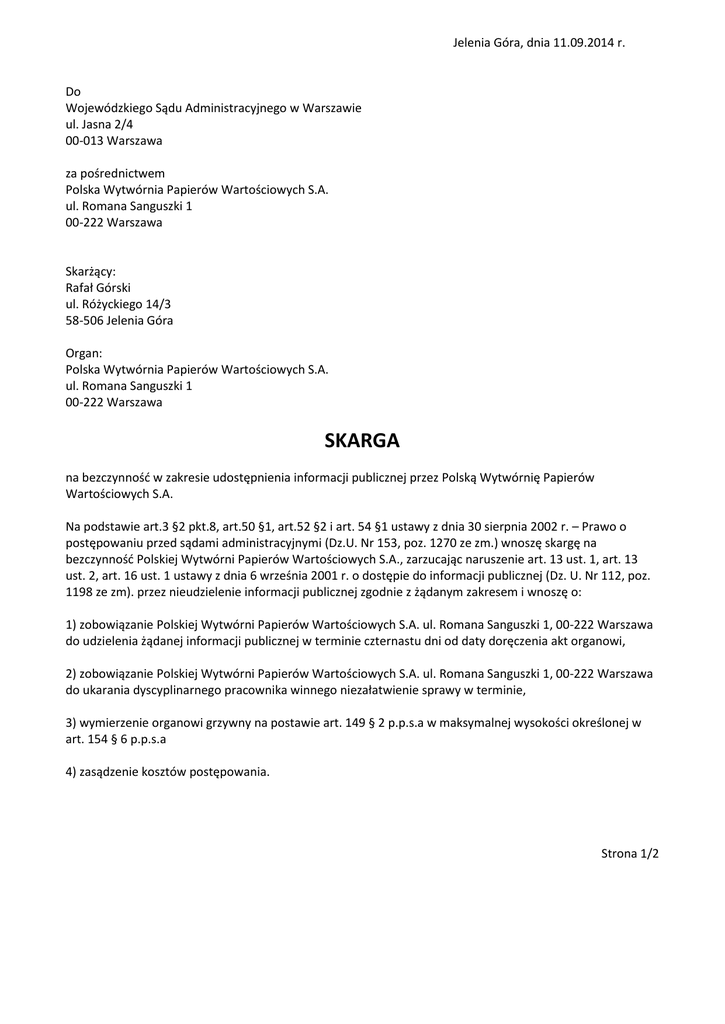 Jelenia Góra, dnia 11.09.2014 r. Do Wojewódzkiego Sądu Administracyjnego w Warszawie ul. Jasna 2/4 00-013 Warszawa za pośrednictwem Polska Wytwórnia Papierów Wartościowych S.A. ul. Romana Sanguszki 1 00-222 Warszawa Skarżący: Rafał Górski ul. Różyckiego 14/3 58-506 Jelenia Góra Organ: Polska Wytwórnia Papierów Wartościowych S.A. ul. Romana Sanguszki 1 00-222 Warszawa SKARGA na bezczynność w zakresie udostępnienia informacji publicznej przez Polską Wytwórnię Papierów Wartościowych S.A. Na podstawie art.3 §2 pkt.8, art.50 §1, art.52 §2 i art. 54 §1 ustawy z dnia 30 sierpnia 2002 r. – Prawo o postępowaniu przed sądami administracyjnymi (Dz.U. Nr 153, poz. 1270 ze zm.) wnoszę skargę na bezczynność Polskiej Wytwórni Papierów Wartościowych S.A., zarzucając naruszenie art. 13 ust. 1, art. 13 ust. 2, art. 16 ust. 1 ustawy z dnia 6 września 2001 r. o dostępie do informacji publicznej (Dz. U. Nr 112, poz. 1198 ze zm). przez nieudzielenie informacji publicznej zgodnie z żądanym zakresem i wnoszę o: 1) zobowiązanie Polskiej Wytwórni Papierów Wartościowych S.A. ul. Romana Sanguszki 1, 00-222 Warszawa do udzielenia żądanej informacji publicznej w terminie czternastu dni od daty doręczenia akt organowi, 2) zobowiązanie Polskiej Wytwórni Papierów Wartościowych S.A. ul. Romana Sanguszki 1, 00-222 Warszawa do ukarania dyscyplinarnego pracownika winnego niezałatwienie sprawy w terminie, 3) wymierzenie organowi grzywny na postawie art. 149 § 2 p.p.s.a w maksymalnej wysokości określonej w art. 154 § 6 p.p.s.a 4) zasądzenie kosztów postępowania. Strona 1/2 Uzasadnienie: W zakresie tej sprawy miał miejsce następujący przebieg zdarzeń: 1. Dnia 25.08.2014 r. złożyłem podanie zawierające wniosek o udostępnienie pytań i odpowiedzi egzaminacyjnych oraz wchodzących w ich skład scenariuszy, wizualizacji i opisów zawartych w testach egzaminacyjnych w zakresie uprawnień prawa jazdy kategorii AM, A1, A2, A, B1, B, C1, C, D1, D i T oraz uprawnienia do kierowania tramwajem. 2. Do dnia złożenia tej skargi 8.09.2014 r. jednoosobowa spółka Skarbu Państwa nie udostępniła żądanej informacji ani też nie wydała decyzji odmownej zgodnie z art. 16 pkt. ustawy o dostępie do informacji publicznej, czym naruszyła 14 dniowy termin zapisany art. 13 ust. 1 ustawy o dostępie do informacji publicznej. WSA w Wyroku z dnia 22 sierpnia 2012 (sygn. akt II SAB/Lu 72/12) zauważył, że "o bezczynności w udostępnieniu informacji publicznej można zatem mówić w sytuacji, gdy zobowiązany do udzielenia tej informacji podmiot nie podejmuje w terminie wskazanym w art. 13 ustawy (przy uwzględnieniu wymienionych wyżej wyjątków) odpowiednich czynności, tj. nie udostępnia informacji publicznej w formie czynności materialno - technicznej lub nie wydaje decyzji o odmowie jej udzielenia." Zgodnie z wykładnią prawa zawartą w Wyroku Naczelnego Sądu Administracyjnego (sygn. akt I OSK 285/11), prawo złożenia tej skargi nie wymaga wyczerpania środków zaskarżenia, "Powyższe rozważania prowadzą więc do wniosku, że skoro skarga na bezczynność w sprawie dostępu do informacji publicznej zmierza do jak najszybszego rozpatrzenia wniosku, a ustawa nie stawia dodatkowych warunków do jej wniesienia, to może być ona wniesiona do sądu administracyjnego bez wezwania do usunięcia naruszenia prawa. Stanowisko to zostało ugruntowane w orzecznictwie sądów administracyjnych (por. postanowienie NSA z dnia 31 marca 2008 r., I OSK 262/08, wyrok NSA z 24 maja 2006 r., I OSK 601/05, postanowienie NSA z 03 października 2007 r., I OSK 1382/07 oraz wyrok WSA w Warszawie z dnia 6 lipca 2011 r., VIII SAB/Wa 18/11) " Za uzasadnione w związku z tym należy uznać zobowiązanie Polskiej Wytwórni Papierów Wartościowych S.A. do ukarania pracownika winnego niezałatwienia sprawy w terminie na podstawie art. 38 KPA Wnoszę także o zasądzenie kosztów postępowania w sprawie. Podpis Załączniki: 1) odpis skargi 2) kopia mojego podania o udostępnienie informacji publicznej Strona 2/2