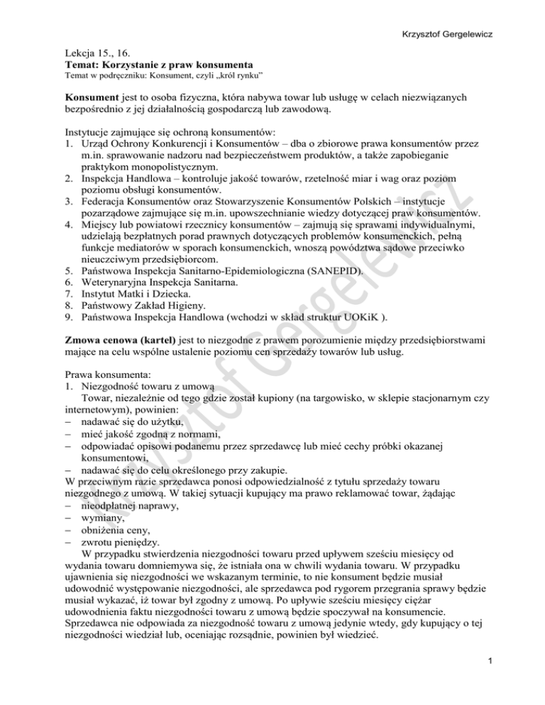 Lekcja 15., 16. Temat: Korzystanie z praw konsumenta Konsument