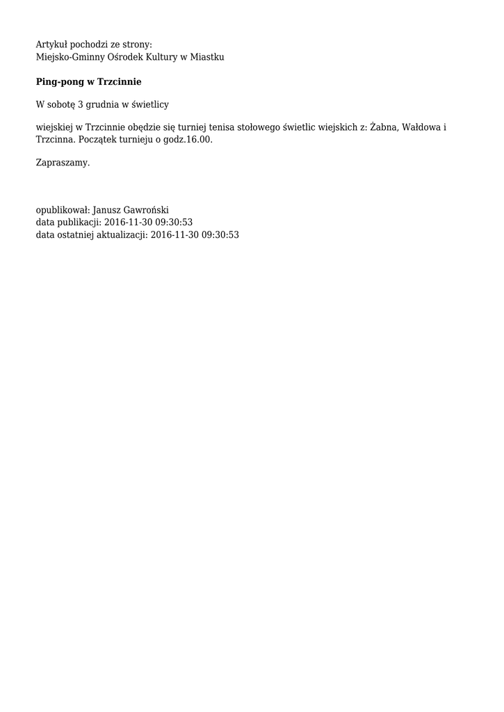 Artykuł pochodzi ze strony: Miejsko-Gminny Ośrodek Kultury w Miastku Ping-pong w Trzcinnie W sobotę 3 grudnia w świetlicy wiejskiej w Trzcinnie obędzie się turniej tenisa stołowego świetlic wiejskich z: Żabna, Wałdowa i Trzcinna. Początek turnieju o godz.16.00. Zapraszamy. opublikował: Janusz Gawroński data publikacji: 2016-11-30 09:30:53 data ostatniej aktualizacji: 2016-11-30 09:30:53